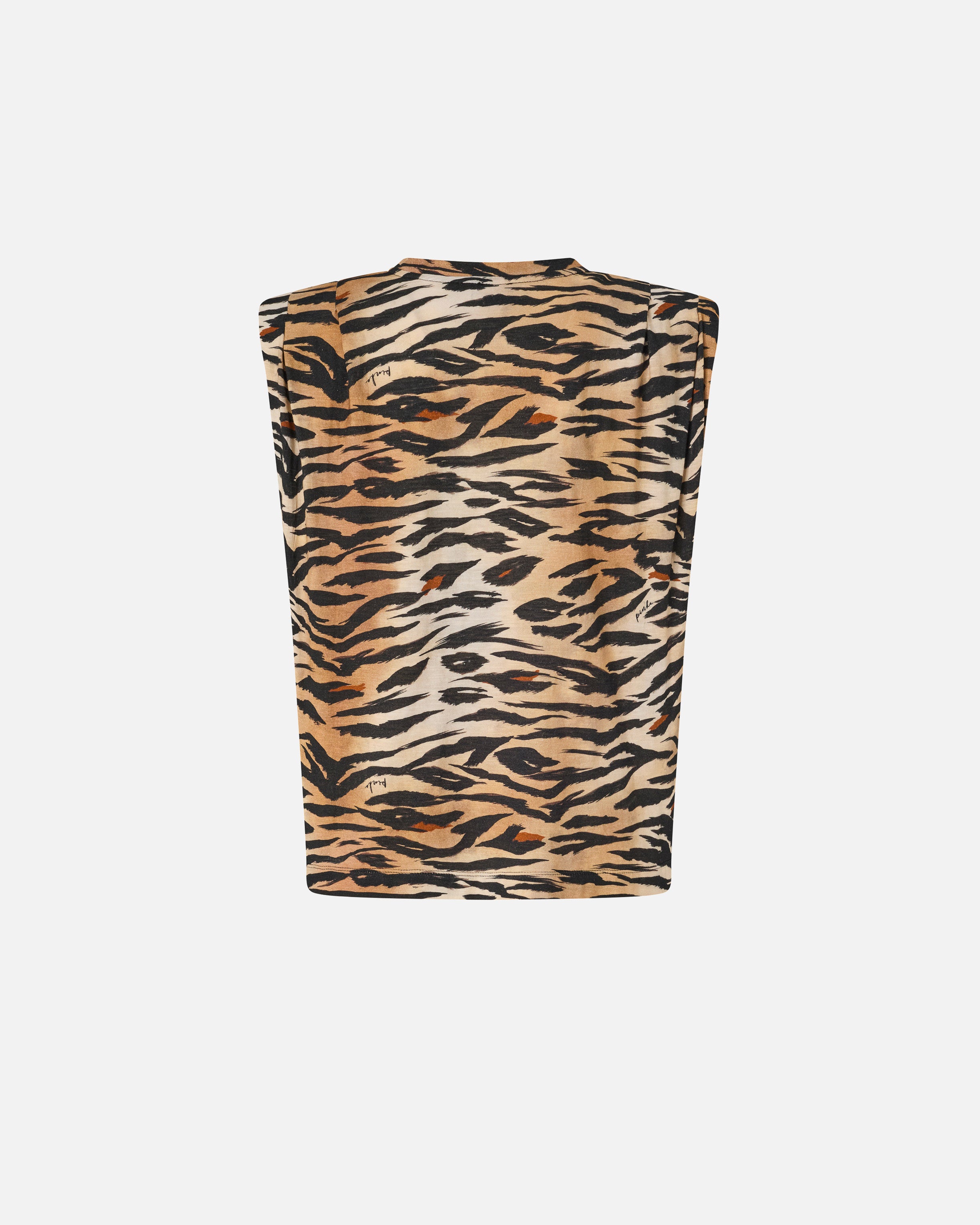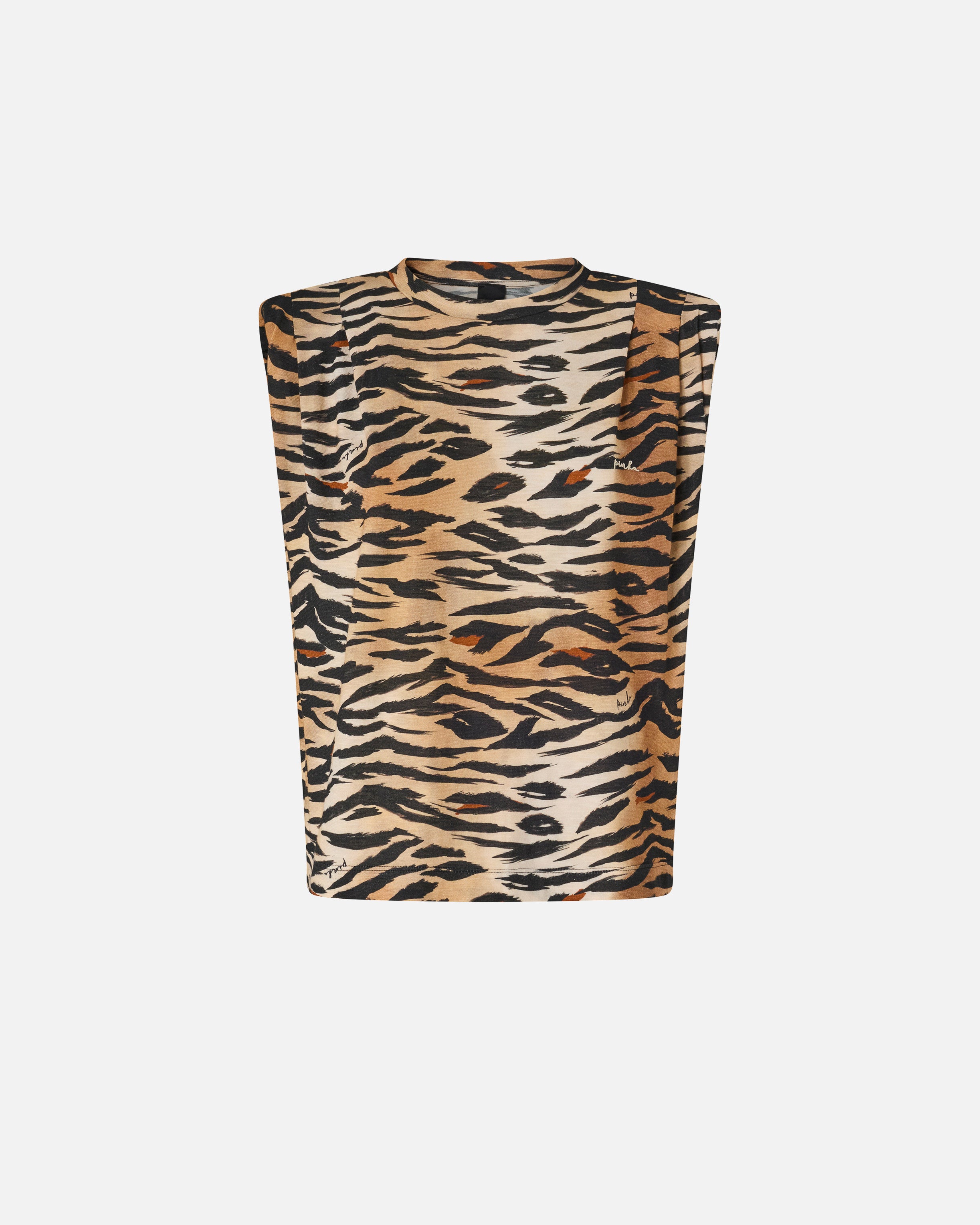 Pullover aus geflammtem Jersey in reiner Baumwolle. Das Modell hat ein ärmelloses Design mit einem raffinierten drapierten Effekt an den Schultern und zeichnet sich durch einen auffälligen Allover-Tigerprint aus, der durch kleine, unauffällige PINKO-Signaturen in kursiv abgerundet wird. Dank der entschlossenen und modernen Ästhetik, die Ausdruck der DNA der Marke ist, ist dieses Kleidungsstück dazu bereit, die Fans von Animalier und anderen Mustern auf den ersten Blick zu erobern.