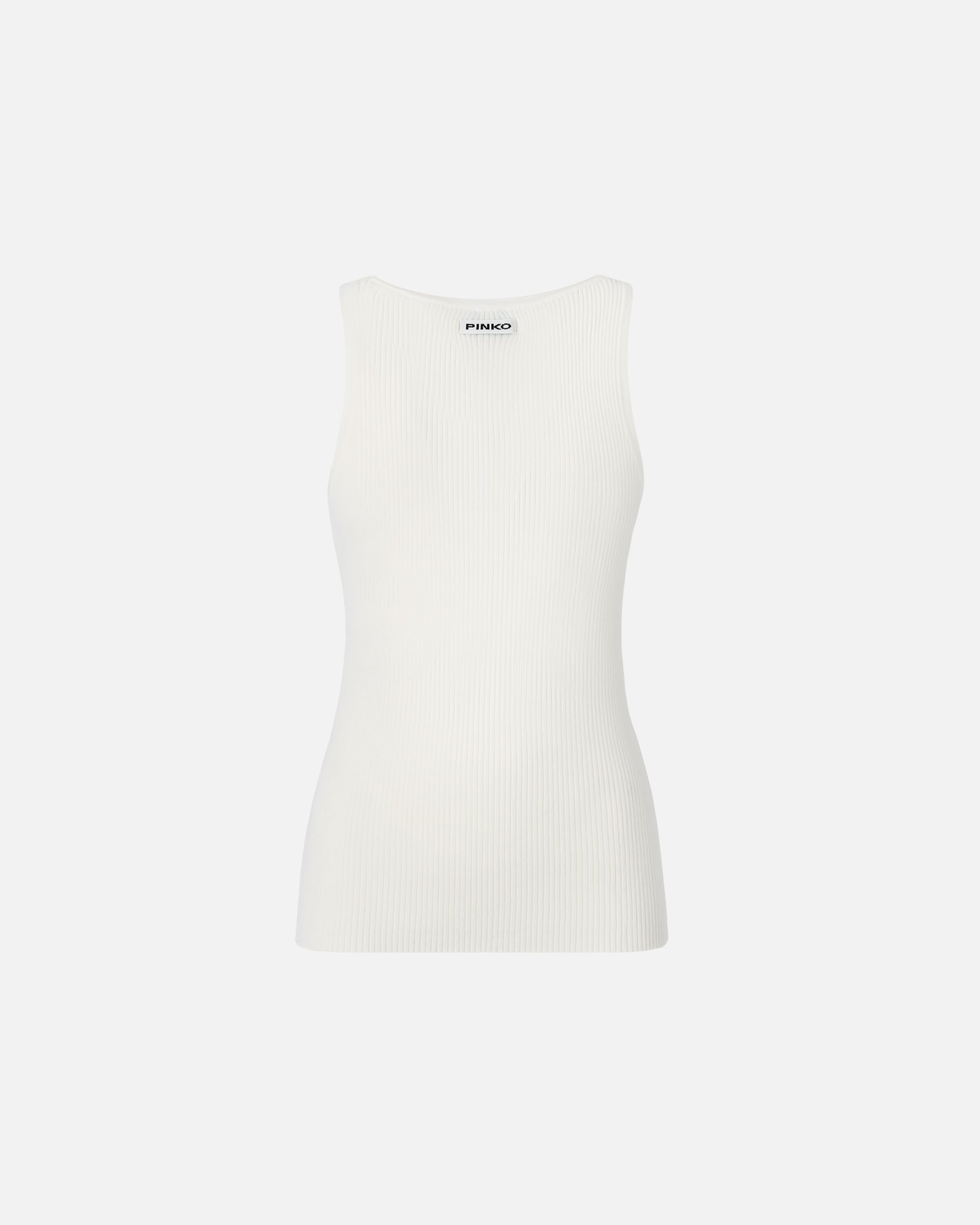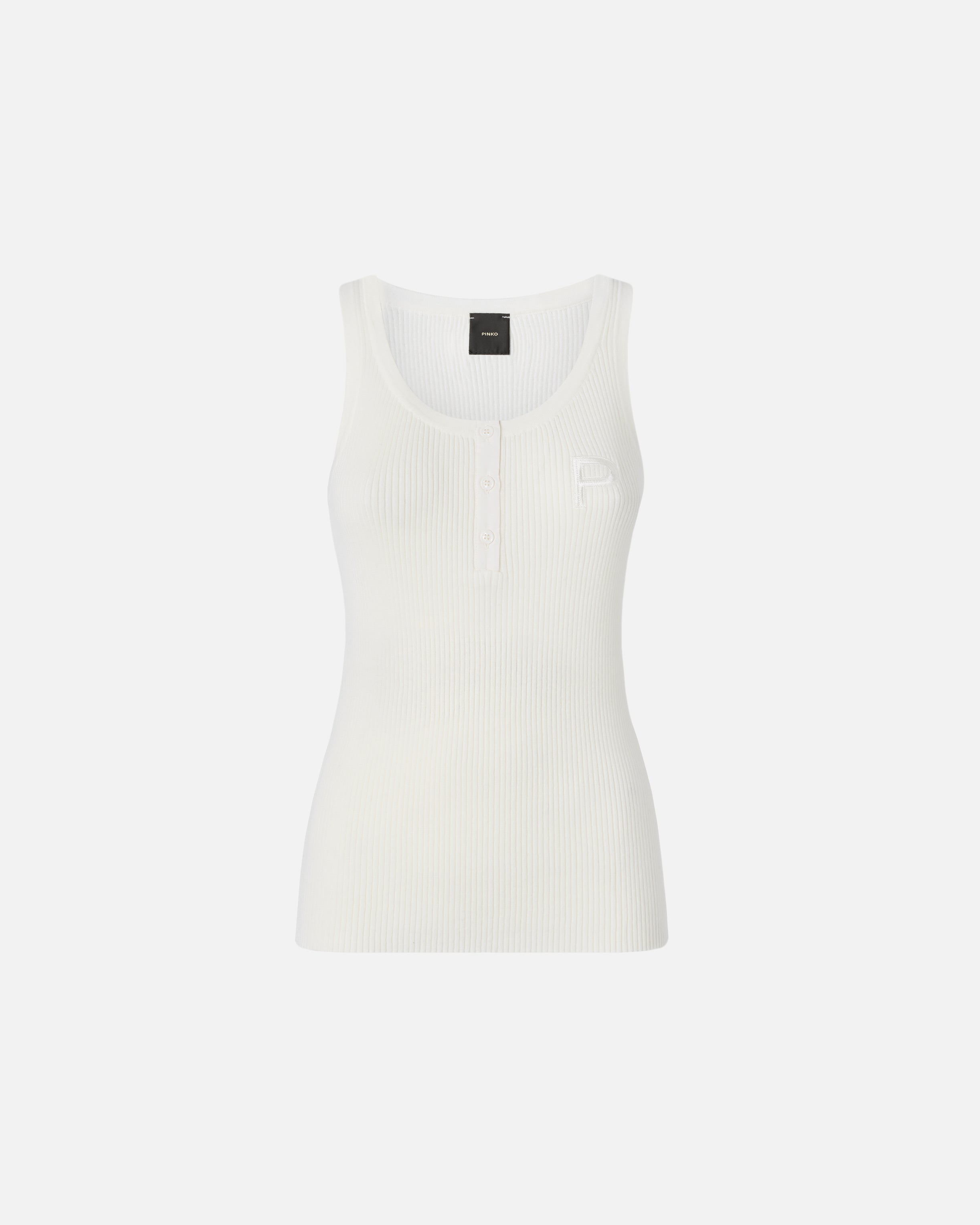 Ärmelloses Top aus feinem Rippstrick in einem weichen und leichten Mix aus Baumwolle und Kaschmir, der jedes Sommeroutfit abrundet. Das Modell mit Rundhalsausschnitt und Henley-Knopfleiste ist mit einem farblich passenden, aufgestickten Monogramm P auf der Brust verziert und wird durch das Etikett mit PINKO-Logo als Lettering in Jacquard auf der Rückseite abgerundet.