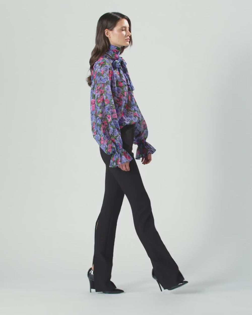 Langärmelige Bluse aus leichtem Creponne-Gewebe mit farbenfrohem, stilisiertem Blumenprint und elastischem Saum für eine bequeme Passform. Diese Bluse ist perfekt für die ersten Tage der neuen Jahreszeit oder unter einem Blazer. Sie hat Rüschen an den Ärmelenden und eine Schärpe, die in einer weichen und eleganten Schleife um den Hals gebunden wird. Dieses leichte und fließende Kleidungsstück von PINKO verleiht Ihrer Alltagsgarderobe und darüber hinaus einen Hauch von Sorglosigkeit.
