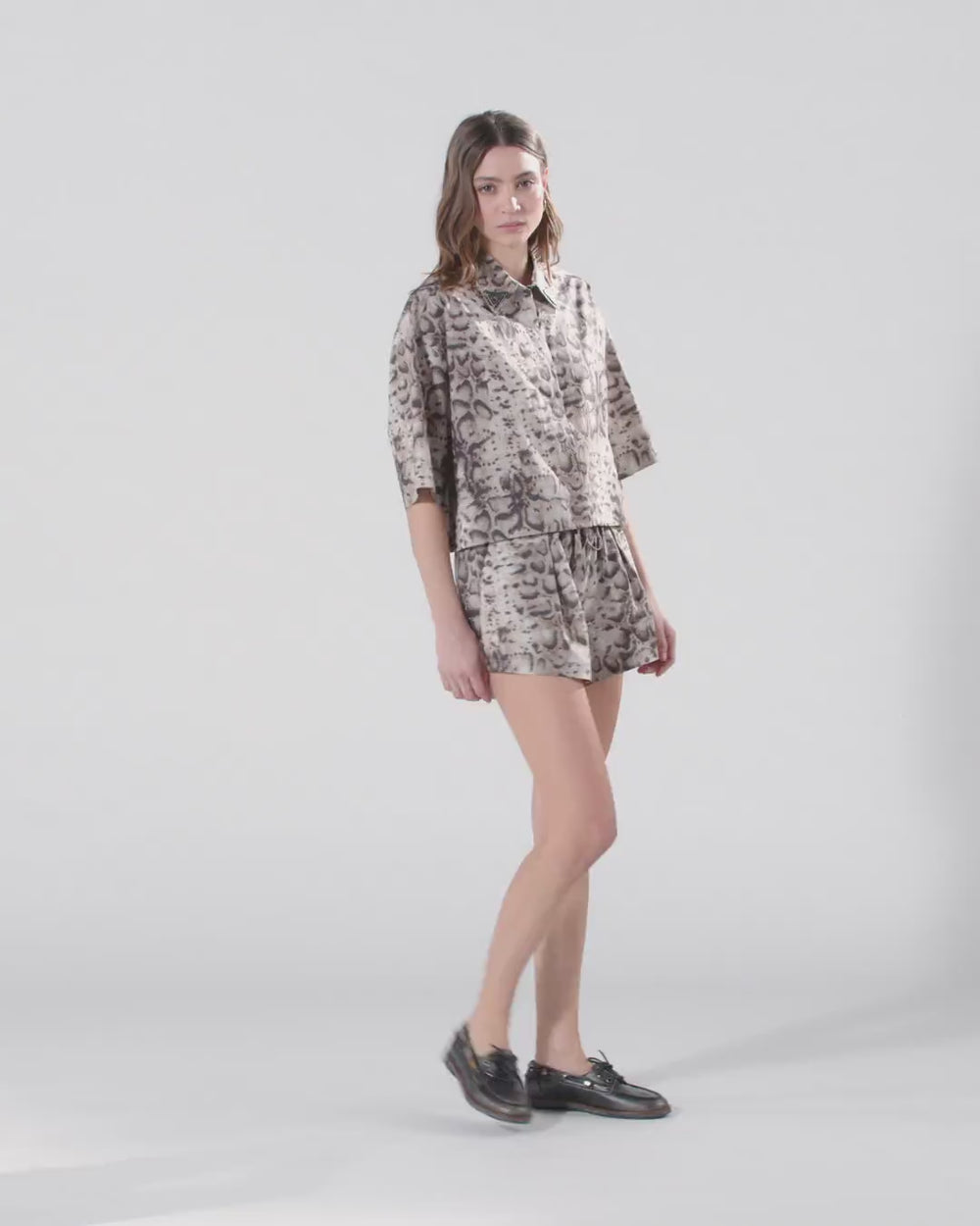 Cropped-Hemd mit weiten Halbärmeln aus reiner Baumwoll-Popeline mit frischem, angenehmem Griff. Perfekt, um Tagesoutfits mit einem Hauch von Originalität zu ergänzen oder frische, entspannte Abendlooks zu kreieren, wird das Modell durch sorgfältig gestaltete Details veredelt, die die Persönlichkeit von PINKO widerspiegeln: ein Allover-Snake-Print und zwei fein verzierte Metallapplikationen im Westernstil an den Kragenspitzen. Abgerundet wird das Design durch eine verdeckte Knopfleiste, bei der nur der oberste Knopf sichtbar ist.