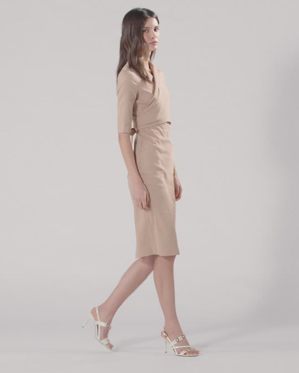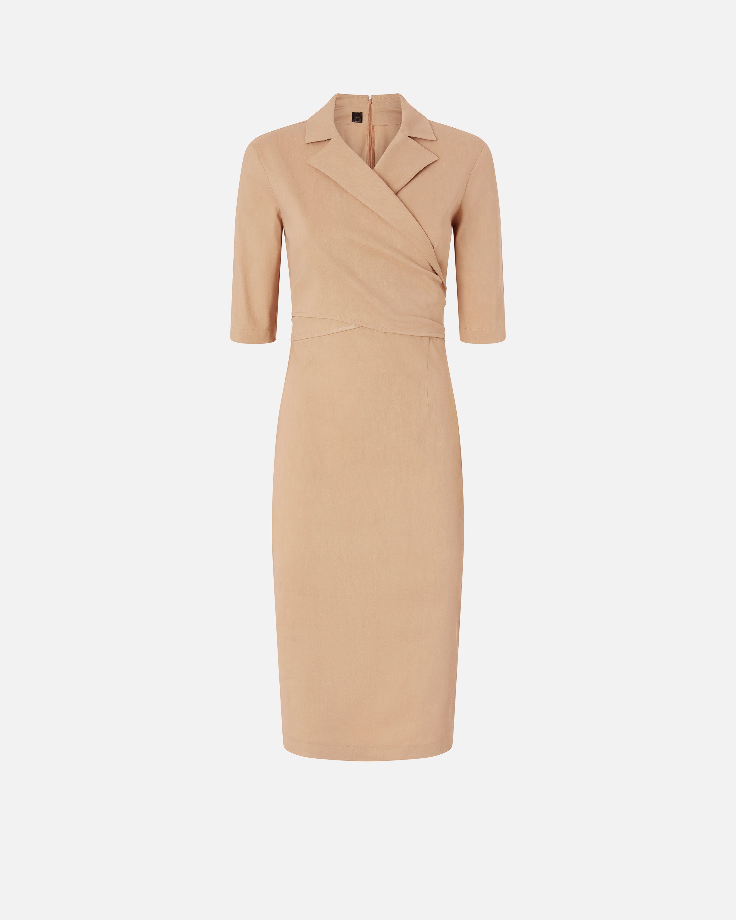 Midikleid mit eng anliegender Silhouette aus einer bequemen, stretchigen Leinenmischung mit charakteristischer geflammter und leuchtender Optik. Das Modell zeichnet sich durch eine geschickte Verschmelzung von strengeren Elementen wie den Ärmeln am Ellbogen und dem Reverskragen aus, der an das Design der Jacken erinnert, und durch femininere Details wie die Überkreuzung auf der Vorderseite, die auf der Rückseite fortgesetzt wird, um eine weiche Schleife entstehen zu lassen. Abgerundet wird das Kleid, das ideal für alle Anlässe, ob tagsüber oder abends ist, durch einen kleinen, zentralen Schlitz hinten und einen praktischen Reißverschluss hinten, der das Anziehen erleichtert.