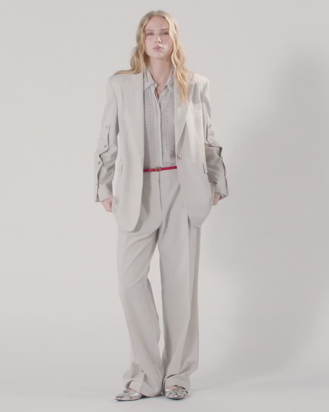 Fließende Jacke mit einreihigem Knopfverschluss, hergestellt aus einem stretchigen Viskosemix. Das Kleidungsstück verfügt über lanzenförmige Revers, zwei Pattentaschen auf der Vorderseite und eine Paspeltasche auf der Brust und zeichnet sich durch raffinierte Schlitze aus, von denen einer auf der Rückseite und zwei an den Ärmeln angebracht sind. Dieses Modell ist mit einem Innenfutter versehen, um ein angenehmes Tragegefühl zu gewährleisten. Kombinieren Sie diese Jacke mit der passenden Hose für einen eleganten Total Look oder tragen Sie sie mit einem lässigeren Oberteil für ein dezentes Outfit. - GRACE JACKET