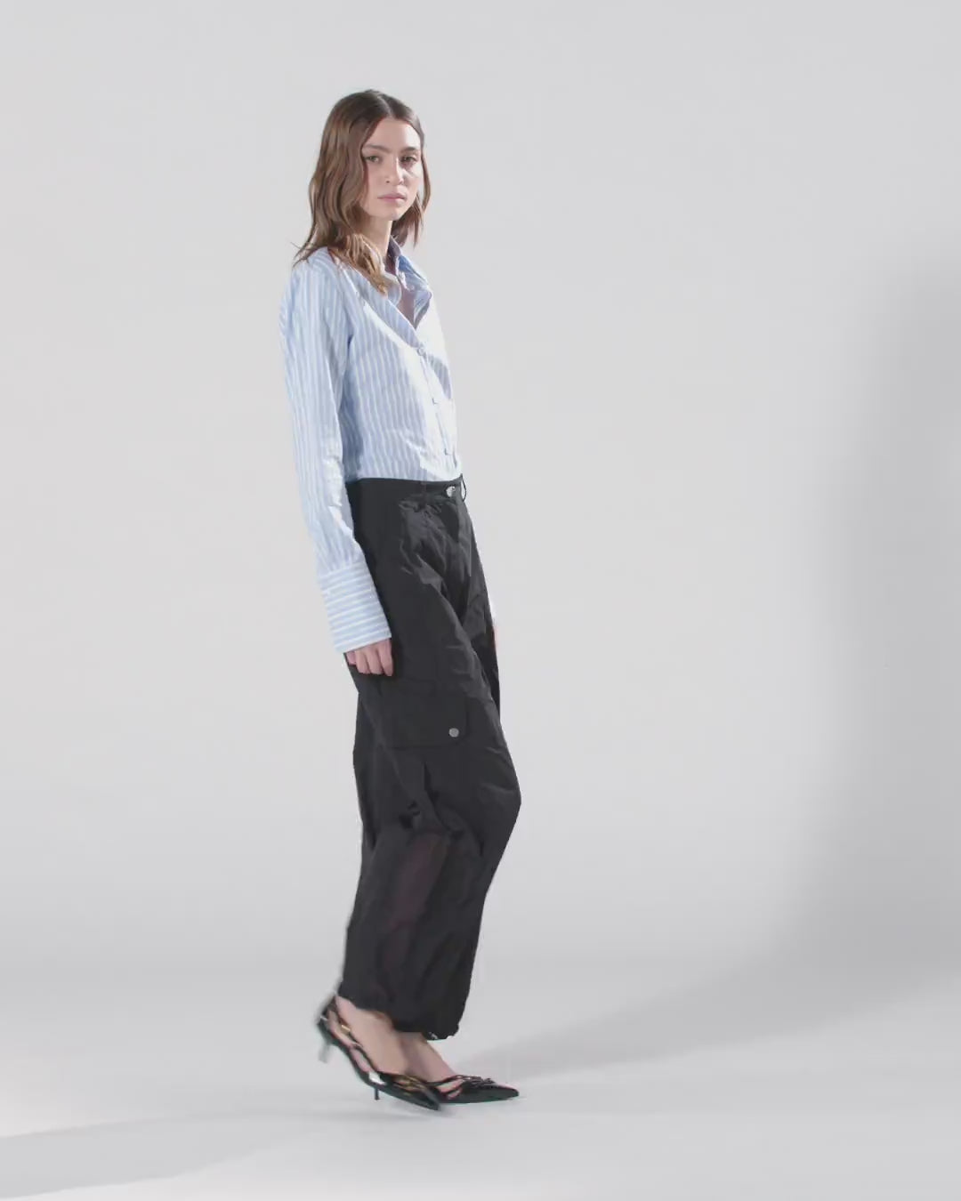 Hose, hergestellt aus technischem Canvas, das an Taft erinnert, und versehen mit Einsätzen an Ärmeln, Kragen und Taschen aus Organza-Ripstop für eine Kombination aus Widerstandsfähigkeit und Transparenz. Das Kleidungsstück ist mit einem verstellbaren Tunnelzug am Beinabschluss, zwei Seitentaschen, zwei aufgesetzten Gesäßtaschen und zwei Taschen im Workwear-Stil mit Patte und Druckknöpfen entlang der Beine ausgestattet. Ein vielseitiges und modernes Kleidungsstück, das den Geist der Streetwear im Stil von PINKO neu interpretiert. - ROMEY TROUSERS