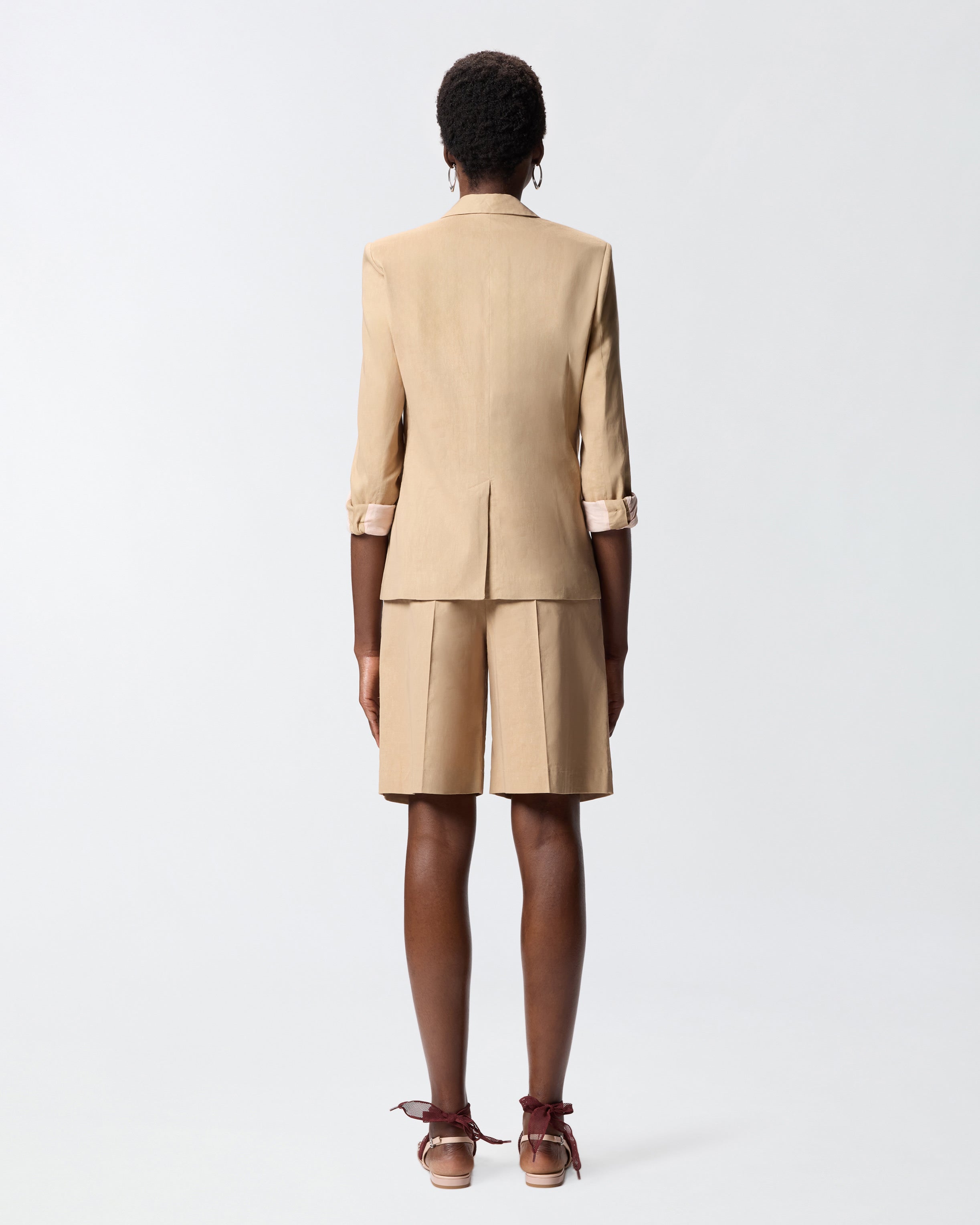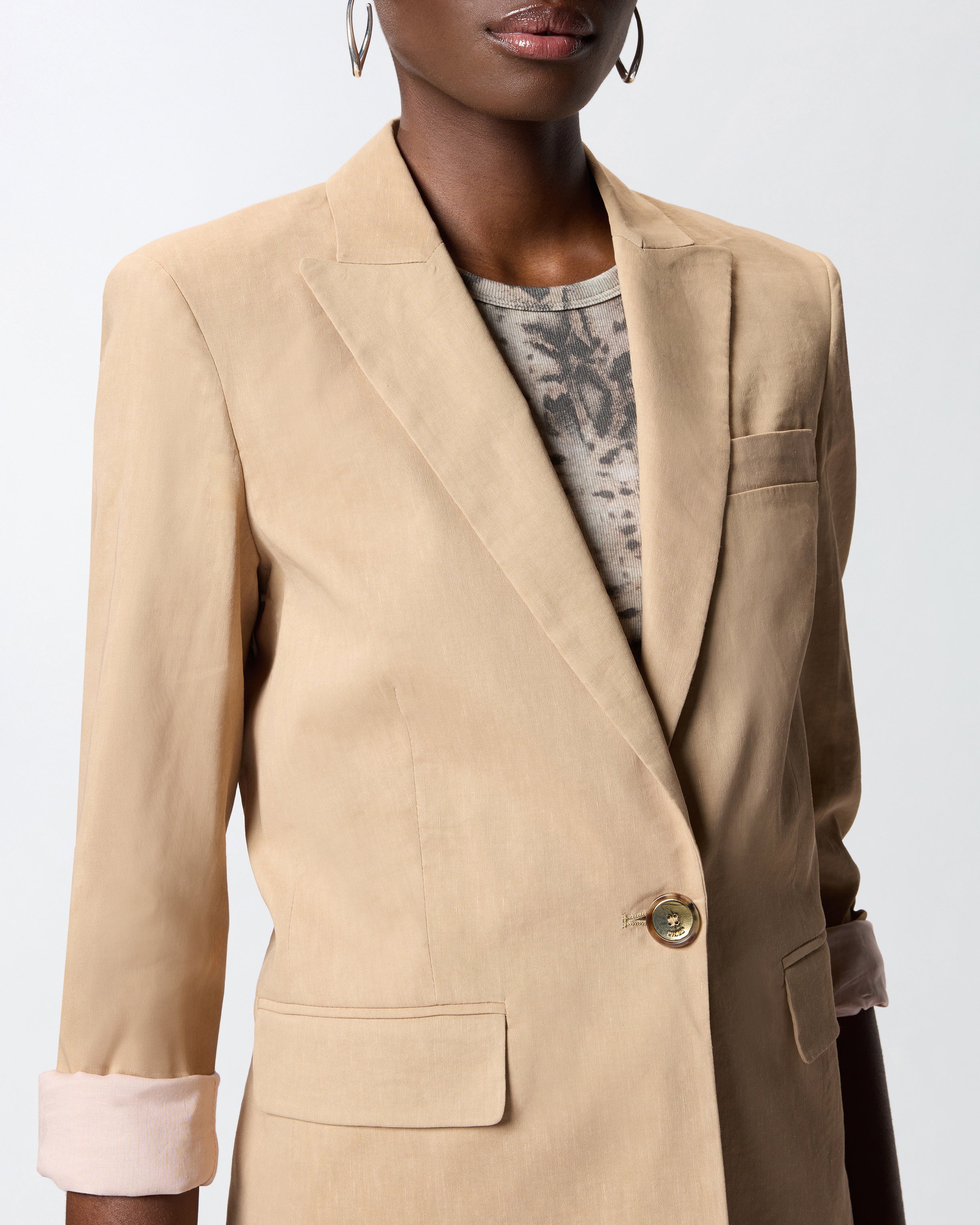 Einreihige Jacke mit Verschluss mit einem Knopf aus einem stretchigen Mix in Leinen und Viskose mit Leinwandbindung, einem geflammten und glänzenden Stoff, der klassisches Leinen auf innovative Weise neu interpretiert. Das Kleidungsstück zeichnet sich durch spitze Revers, zwei Pattentaschen auf der Vorderseite, Ärmelbündchen mit Knopf und einen eleganten Schlitz am Rücken aus. Dieses Modell ist mit einem Innenfutter versehen, um ein angenehmes Tragegefühl zu gewährleisten. Kombinieren Sie die Jacke mit einer Hose aus demselben Stoff für einen Total Look, der für formelle Anlässe geeignet ist, oder machen Sie sie zum Highlight Ihrer Business-Looks.