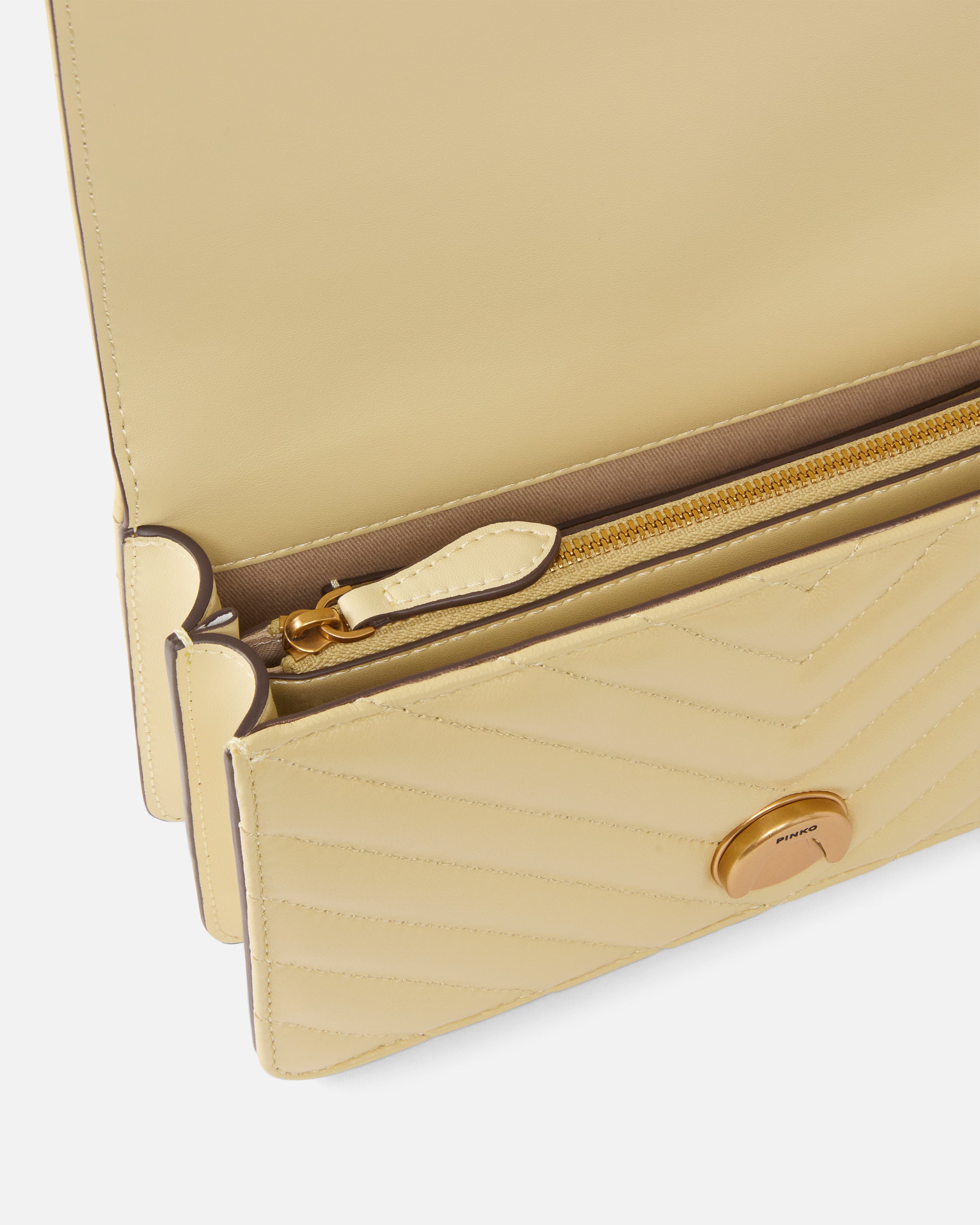 Mini Love Bag One aus gestepptem Nappaleder mit Fischgrätmuster. Der Verschluss wird durch die ikonische Schließe Love Birds Diamond Cut aus Metall abgerundet. Das Innere ist mit Mikrofaser in Veloursoptik gefüttert und mit Zwischenfach mit Reißverschluss und Seitenfach aus Leder ausgestattet. Der Schulterriemen ist eine Kombination aus einer klassischen Kette mit runden Gliedern und einem praktischen verstellbaren Tragegurt aus Leder. - LOVE ONE MINI DC