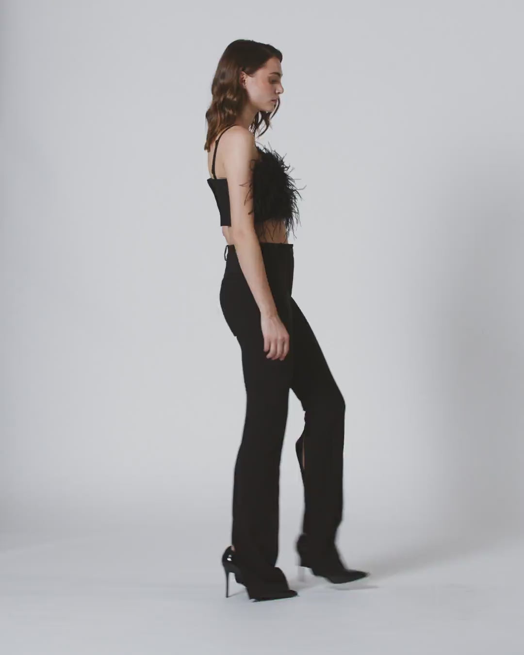 Poly viscose crop top with thin and adjustable straps and zip closure on the back. The softness and fluidity of the fabric are perfectly combined with an original application of feathers, which enhances its charm and exclusivity. The ideal garment for special occasions or for a bold and chic look.