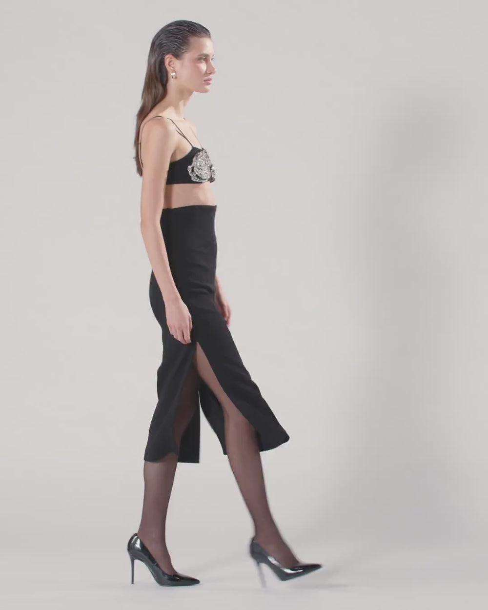 Taillierter Midirock aus stretchiger Viskose mit kompakter Optik, perfekt, um Ihre Figur zu betonen, und mit eleganten Seitenschlitzen und einer bequemen Öffnung mit Reißverschluss auf der Rückseite ausgestattet, um das Anziehen zu erleichtern. Die wahre Besonderheit des Kleidungsstücks liegt jedoch in der Taille, die sich durch ein sehr hohes Design auszeichnet, das durch die Stäbchen hervorgehoben wird, die Struktur verleihen und an weibliche Bustiers erinnern. Dank seiner besonderen Textur, aber auch dank seiner femininen Silhouette ist dieser Rock perfekt für einen besonderen Abend. Kombinieren Sie dazu Ihre Lieblingspumps. - PERA SKIRT