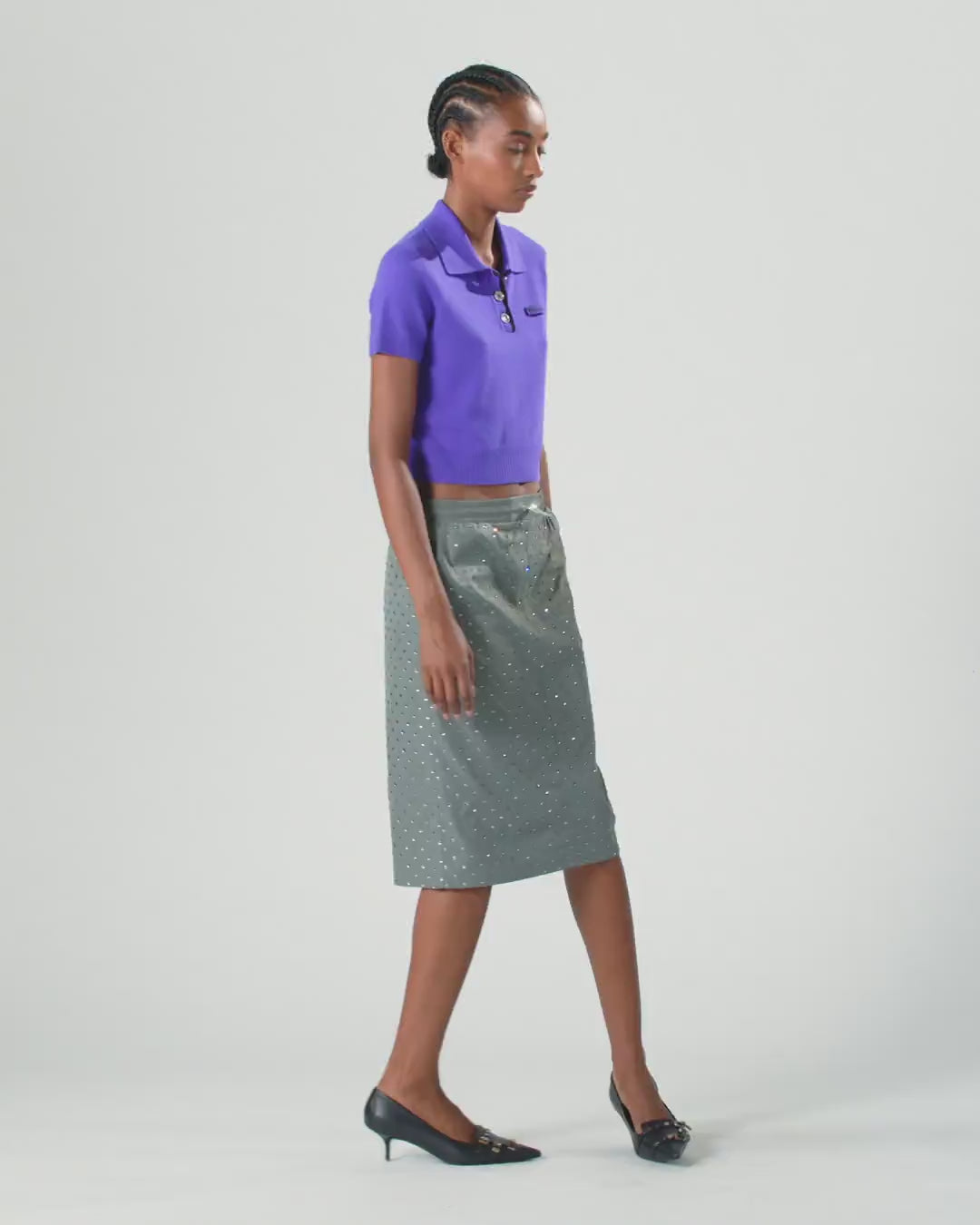 Midirock aus diagonalem Stoff mit mattem Finish und elastischem Bund mit Tunnelzug und praktischem durchgehendem Reißverschluss auf der Rückseite, um die Tiefe des Schlitzes anzupassen. Der praktische Charakter des Kleidungsstücks wird durch die Dekoration perfekt ausgeglichen: ein kostbares All-Over-Motiv mit thermoadhäsiven, rautenförmigen Strasssteinen und Mikro-Metallnieten, die Ihre Outfits im reinen Stil von PINKO aufwerten.