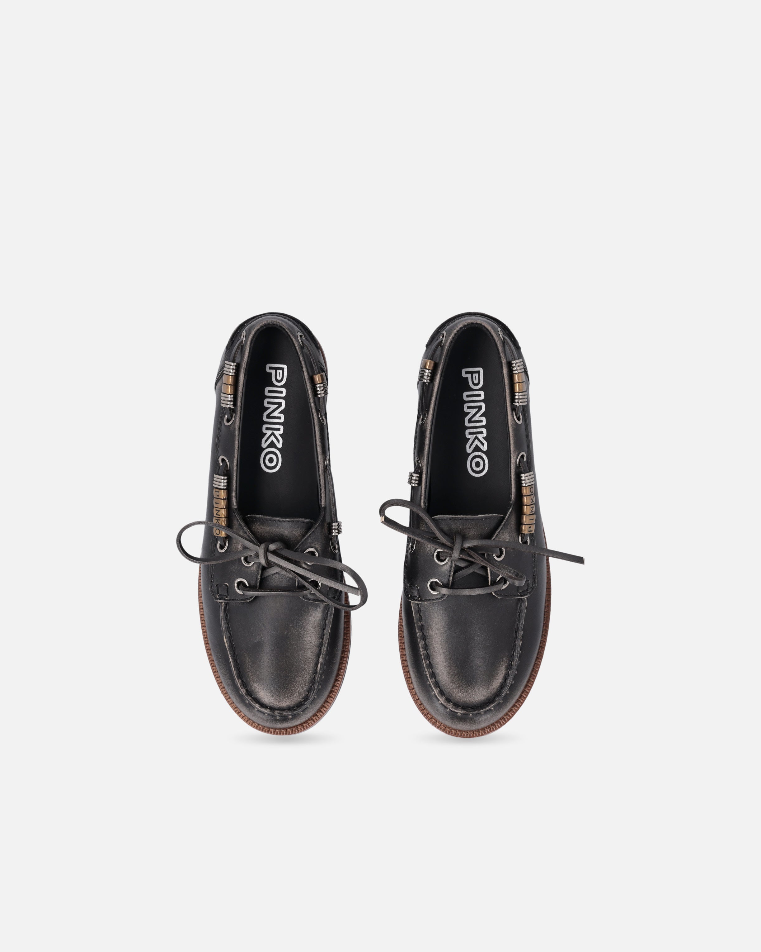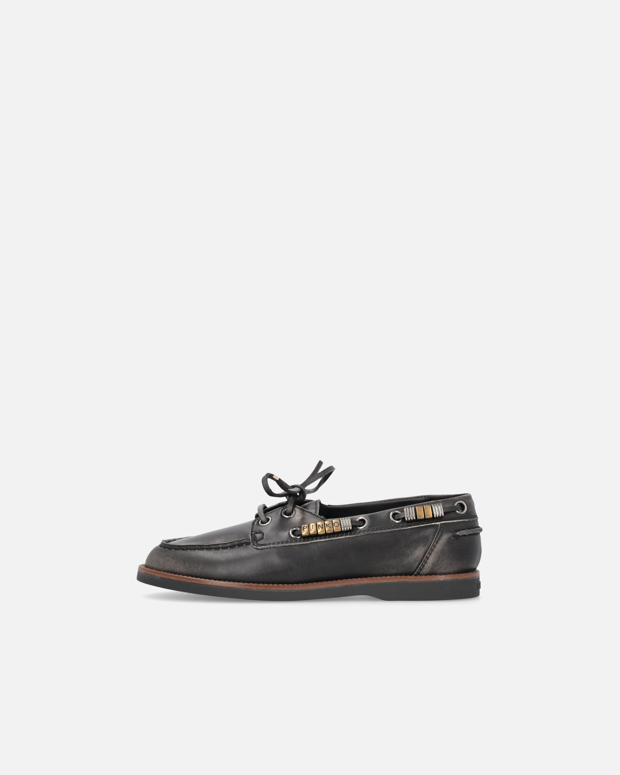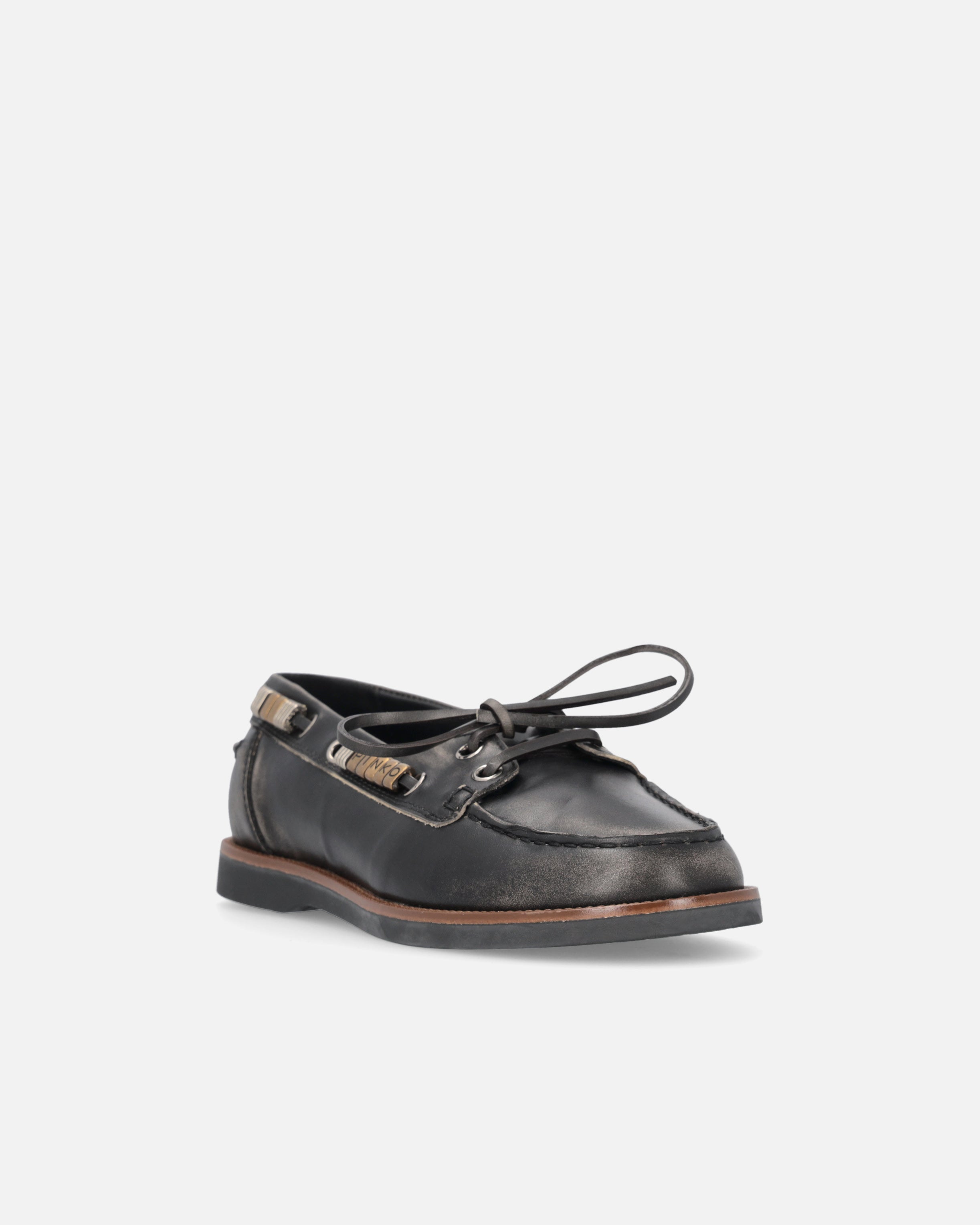 Diese Mokassins sind eine Neuinterpretation des Stils von Bootsschuhen mit einem urbanen und raffinierten Akzent und bestehen aus in Italien hergestelltem Leder, das für Qualität und Tradition steht. Das Design wird durch die Drapierung am Obermaterial abgerundet, eine handwerkliche Technik, die händisch genähte Artikel aufwertet und einen authentischen und unverwechselbaren Look verleiht. Die Metalldetails an den seitlichen Bändern, einschließlich der goldenen Ringe, die das PINKO-Logo als Lettering bilden, sorgen für Licht und Charakter, während die Gummisohle mit Crêpe-Effekt Komfort und Flexibilität garantiert. Das Modell, das Sie gesucht haben, um Ihre Alltagsoutfits mit einer lässigen und modernen Eleganz abzurunden.