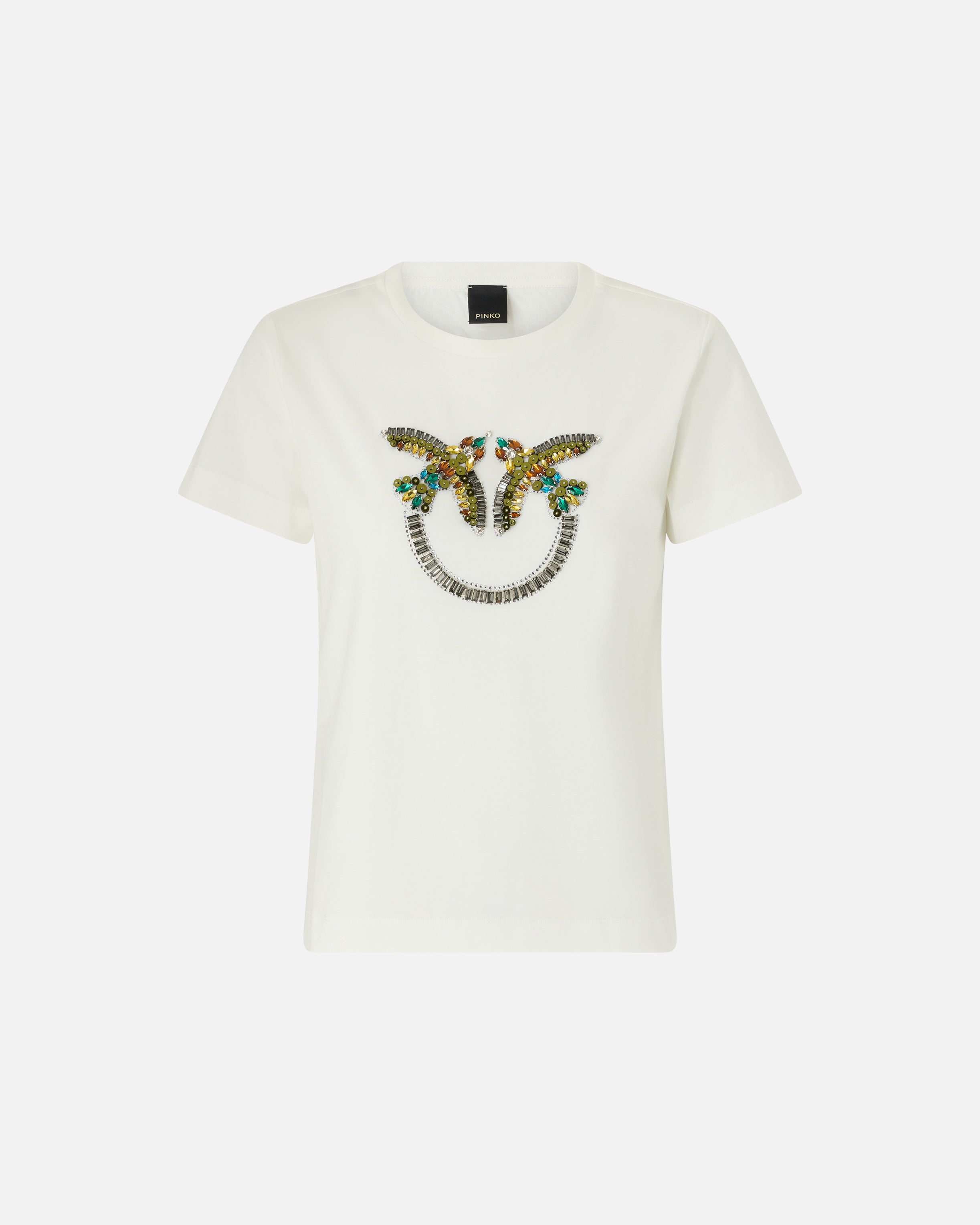 T-Shirt aus weichem Baumwolljersey mit Rundhalsausschnitt und kurzen Ärmeln. Die essentiellen Linien des Modells werden durch die Maxi-Schmuckstickerei auf der Brust belebt, die aus leuchtenden Kristallen und mehrfarbigen Pailletten besteht, die das unverwechselbare Logo Love Birds bilden. Tragen Sie das T-Shirt mit Ihrer Lieblingsjeans, um Ihren Casual-Outfits einen funkelnden Touch im reinen Stil von PINKO zu verleihen.