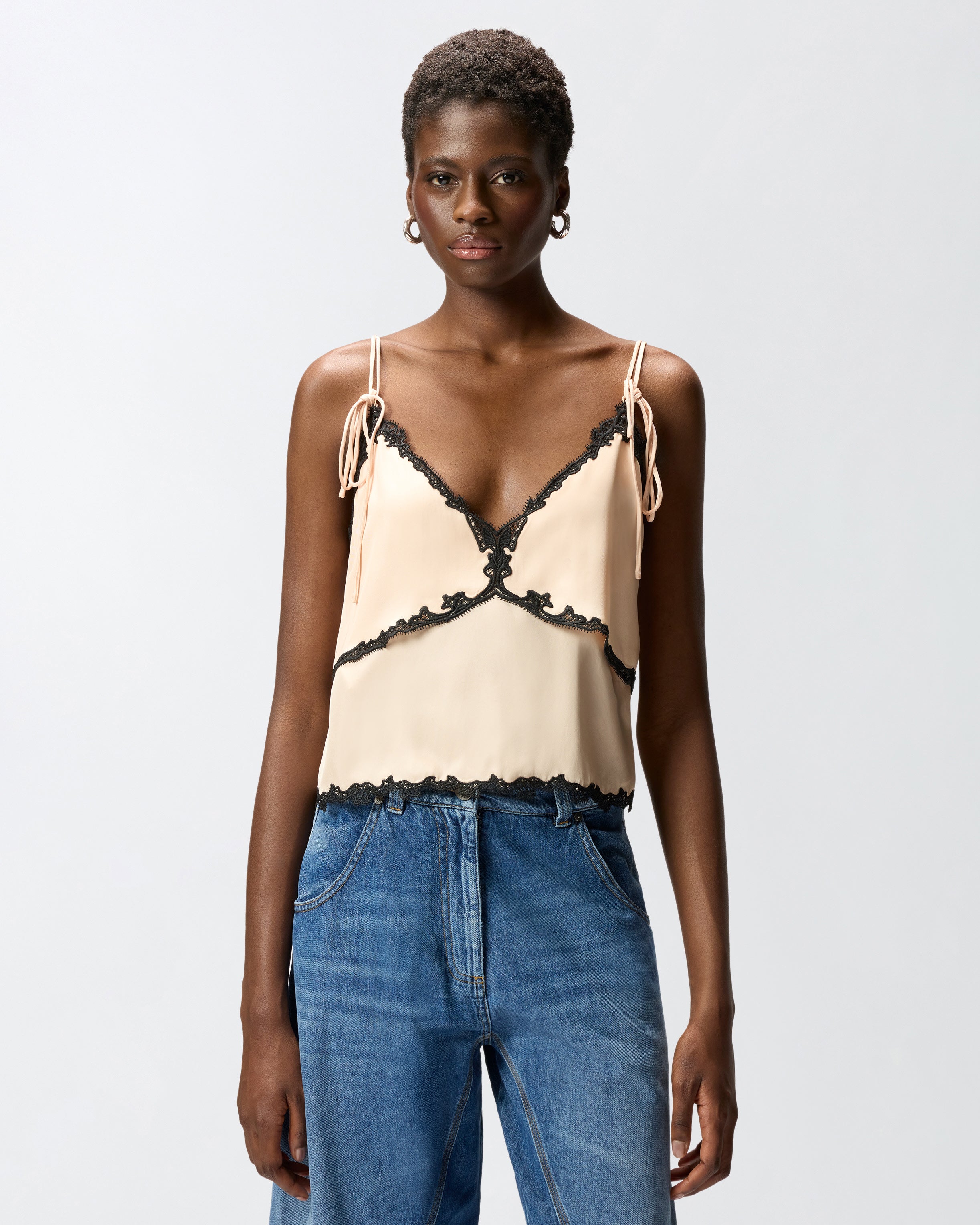 Kurzes Oberteil aus fließendem Twill mit V-Ausschnitt auf der Vorderseite, geradem Ausschnitt auf der Rückseite und langen, schmalen Trägern, die nach Belieben verstellt und gebunden werden können. Das Kleidungsstück wird durch sinnliche Details im reinen Stil von PINKO abgerundet: die Einsätze aus bestickter Spitze, die von Dessous inspiriert sind und den vorderen Ausschnitt, die Taille und den unteren Saum profilieren.