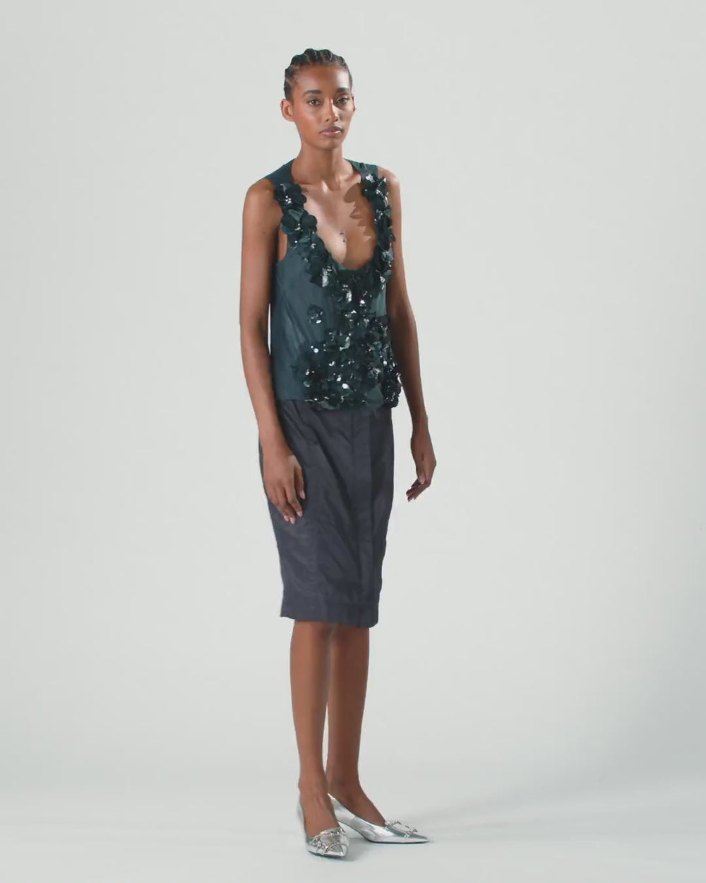Ärmelloses Top mit fließender und weicher Passform sowie tiefem U-Ausschnitt. Das Kleidungsstück besteht aus Tüll und Organza. Das Modell ist mit kleinen Kristallen und Pailletten in Lackoptik in verschiedenen Größen verziert, die von Hand aufgestickt und so angeordnet sind, dass große Schmuckblumen um den Ausschnitt und auf der Vorderseite entstehen. Kombinieren Sie dieses Kleidungsstück mit einer Jeans aus Ihrer Garderobe: Ein Detail genügt, um auch die lässigsten Outfits erstrahlen zu lassen.