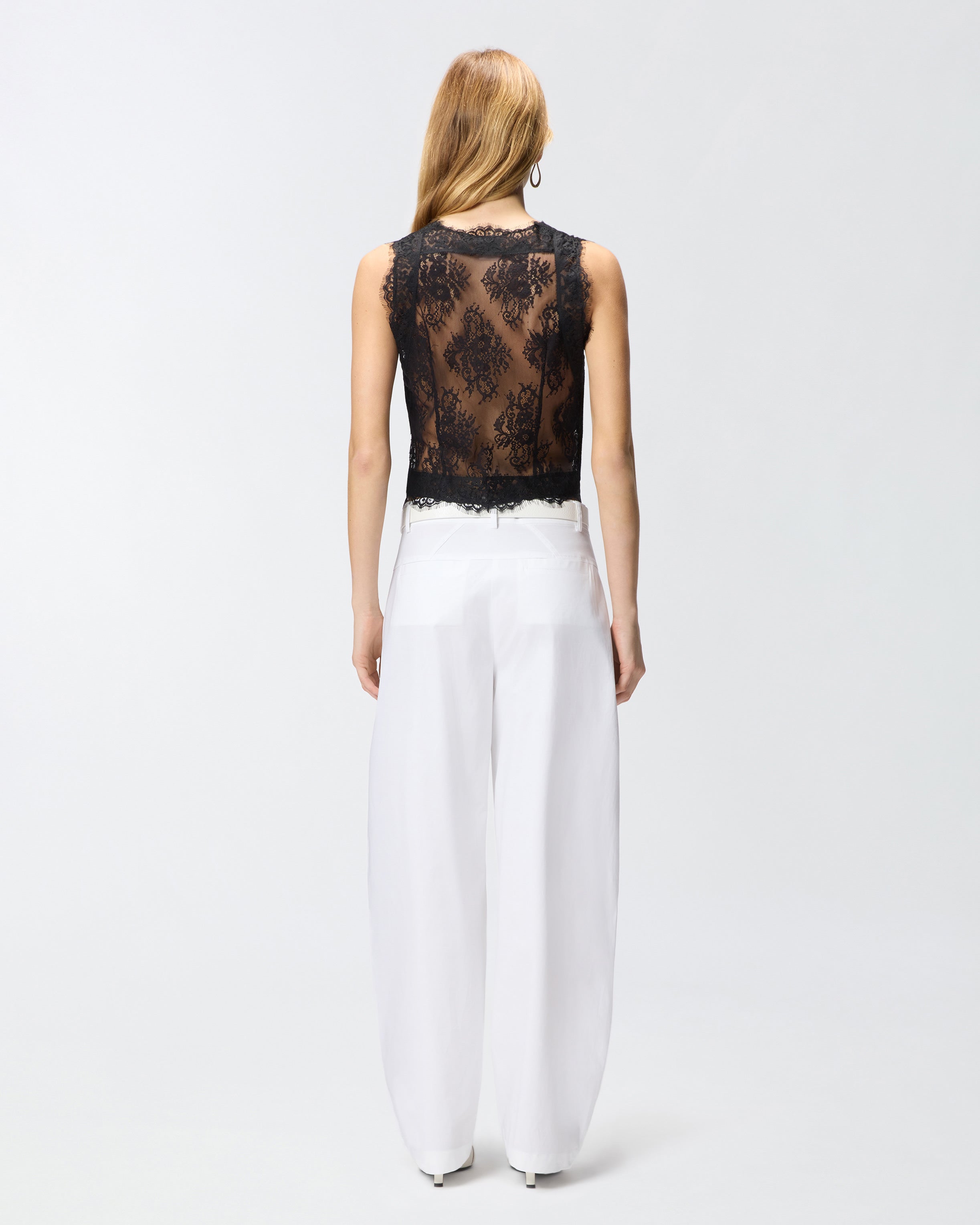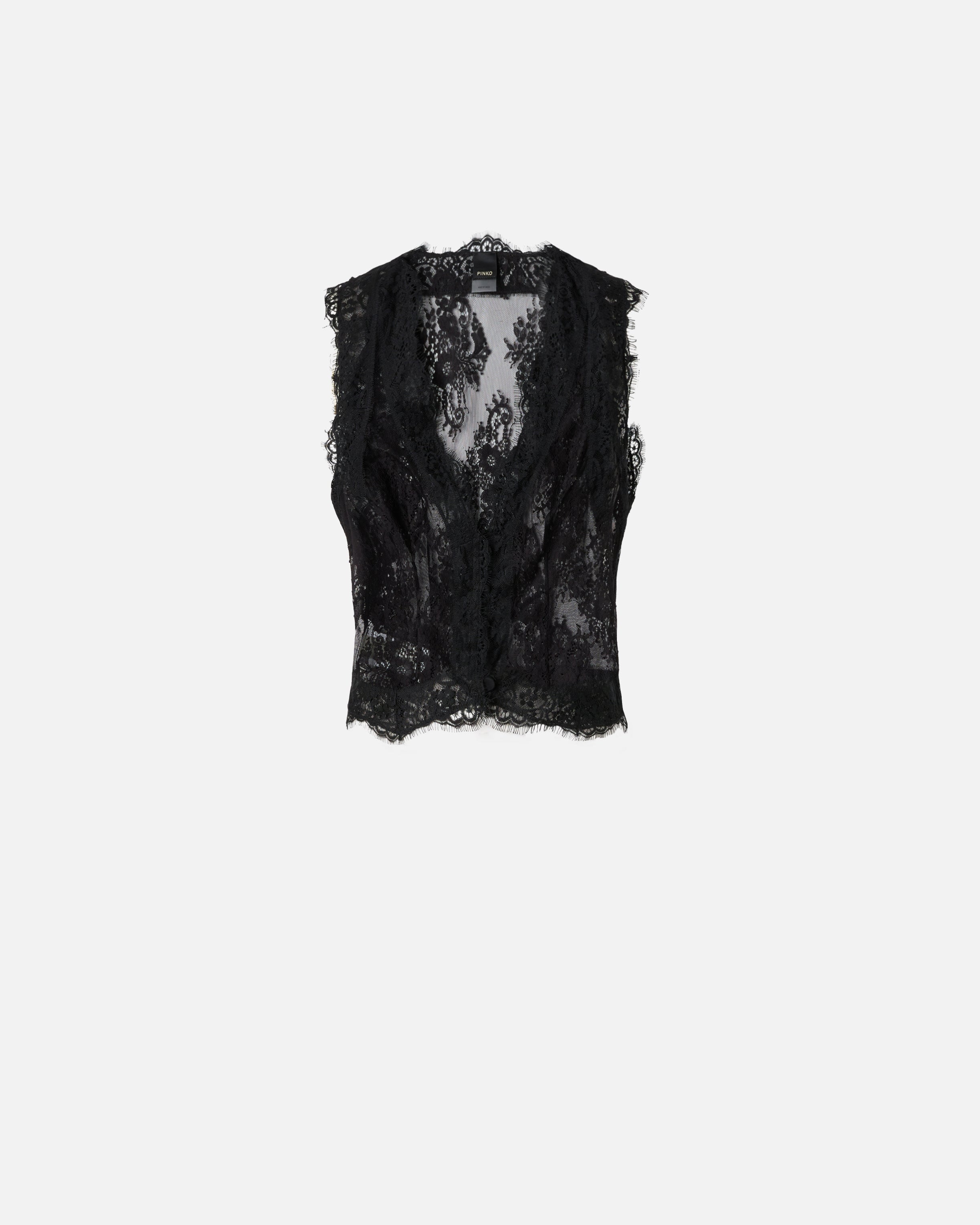 Eng anliegende Weste, die sich durch ein von Bustiers inspiriertes Design und einen tiefen V-Ausschnitt vorne auszeichnet, der in eine Öffnung mit kleinen, überzogenen Knöpfen übergeht. Das Modell besteht aus hauchdünner Valencienne-Spitze mit floralen Elementen, die einen halbtransparenten Effekt erzeugt, und ist mit unversäuberten Säumen im Taglio Vivo. Die Leichtigkeit und das Spiel mit femininen Transparenzen machen diese Weste für Damen zur idealen Wahl für einen raffinierten Look, der nicht auf einen sinnlichen Akzent verzichtet.