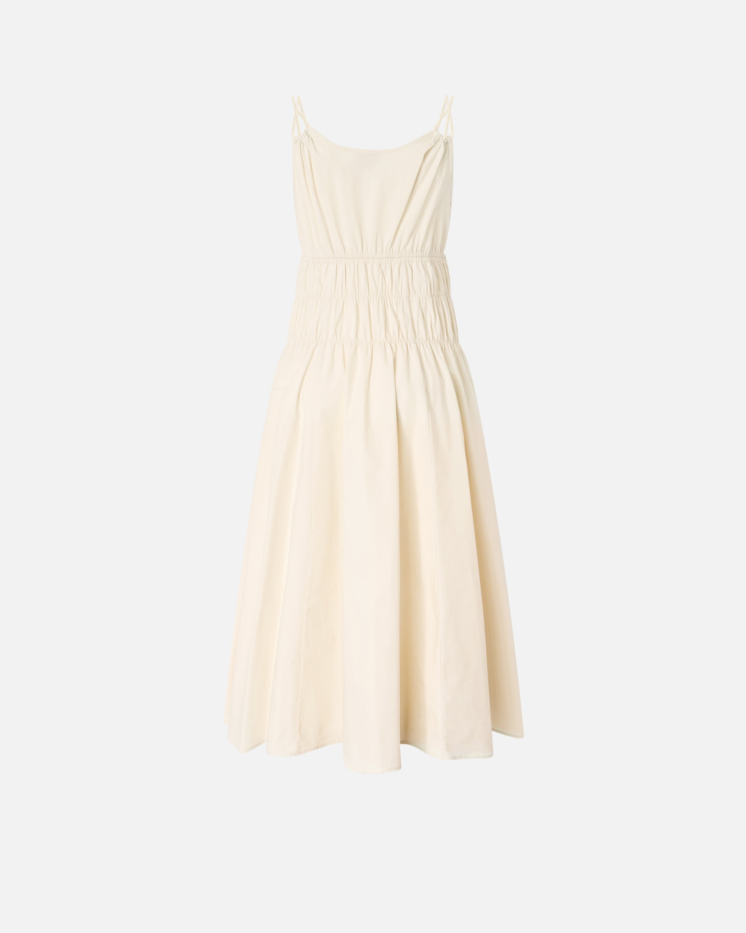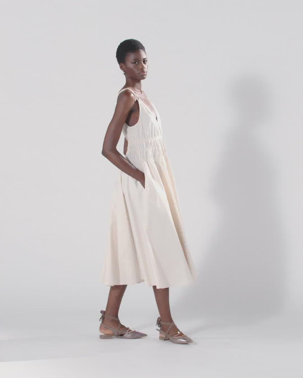 Φόρεμα σε μίντι μήκος από απαλή βαμβακερή ποπλίνα, με δροσερή και ευχάριστη υφή, με βαθύ V ντεκολτέ μπροστά και αμάνικη γραμμή με διπλές λεπτές τιράντες που δημιουργούν μικρές σούρες. Διαθέτει βολικές πλευρικές τσέπες και ξεχωρίζει για το εβαζέ κάτω μέρος με απαλές πιέτες και τη φάσα στη μέση με δύο φαρδιές σειρές με σούρες, που τονίζουν τη σιλουέτα χωρίς συμβιβασμούς στην άνεση. Αυτό το φόρεμα είναι ιδανικό τόσο για ένα θηλυκό καθημερινό look με ένα ζευγάρι χαμηλά παπούτσια, όσο και για ένα ιδιαίτερο βραδινό ντύσιμο με ένα ζευγάρι γόβες.
