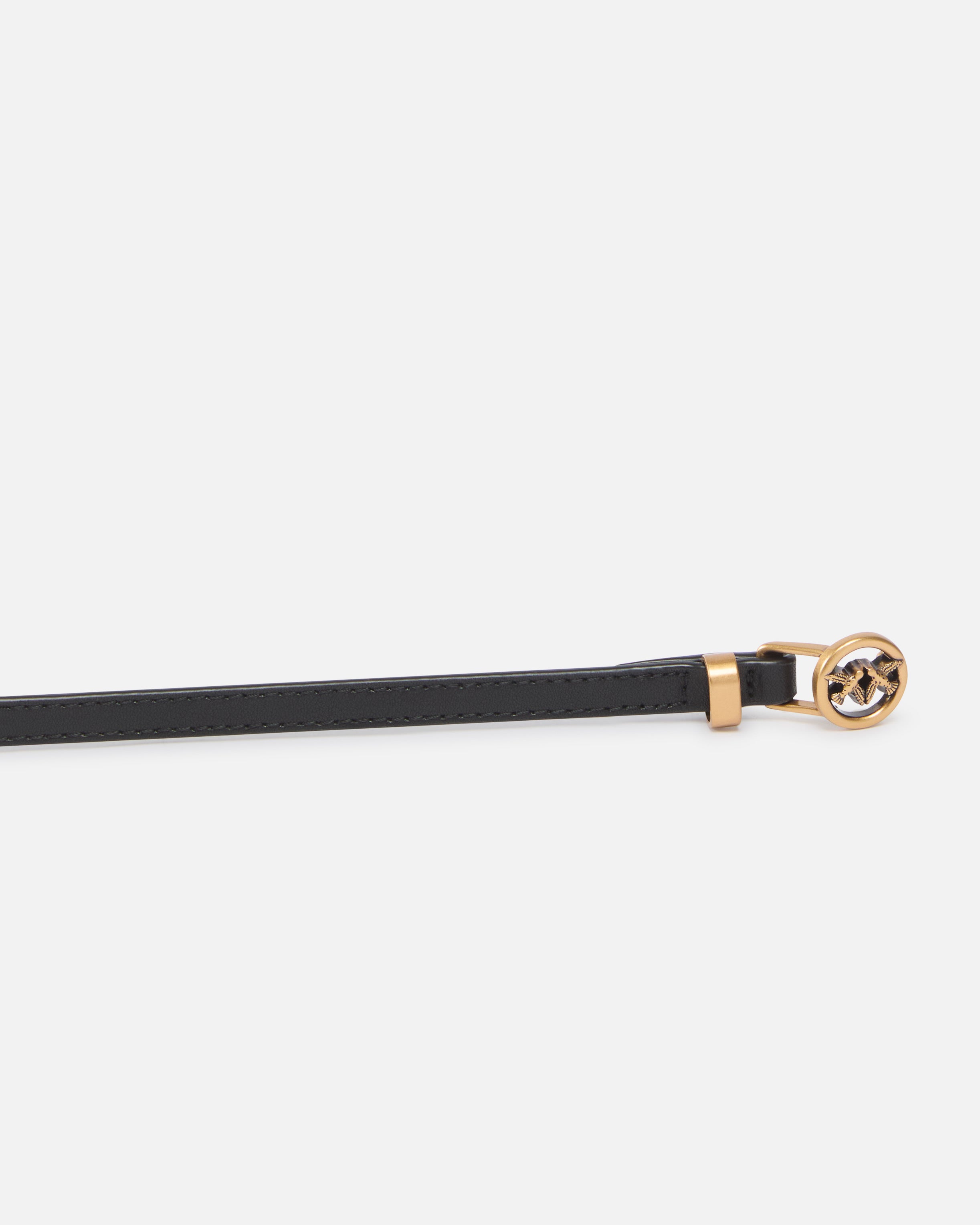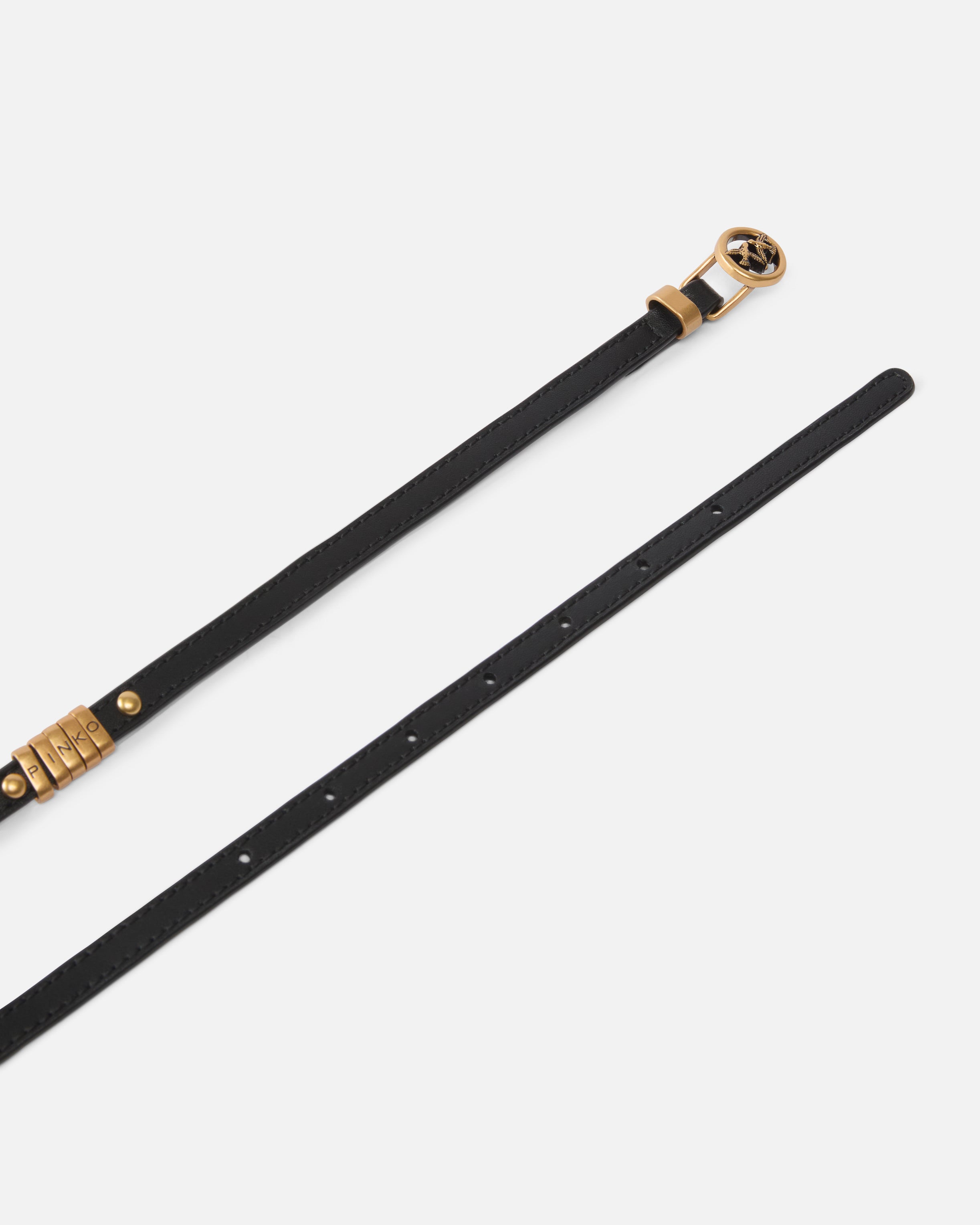 Λεπτή ζώνη πλάτους 1 cm από μαλακό δέρμα με πολύ απαλή υφή. Το αξεσουάρ έχει τέτοιο μήκος ώστε να μπορεί να φορεθεί διπλό, και είναι διακοσμημένο με στρογγυλά τρουκς, μεταλλικούς κρίκους με χαραγμένα γράμματα που σχηματίζουν το λογότυπο PINKO, καθώς και μια μικρή στρογγυλή αγκράφα με τα εμβληματικά Love Birds. Χάρη στον ευέλικτο αλλά αναγνωρίσιμο σχεδιασμό της, η ζώνη μπορεί να φορεθεί τόσο με καθημερινά looks όσο και με βραδινά σύνολα.
