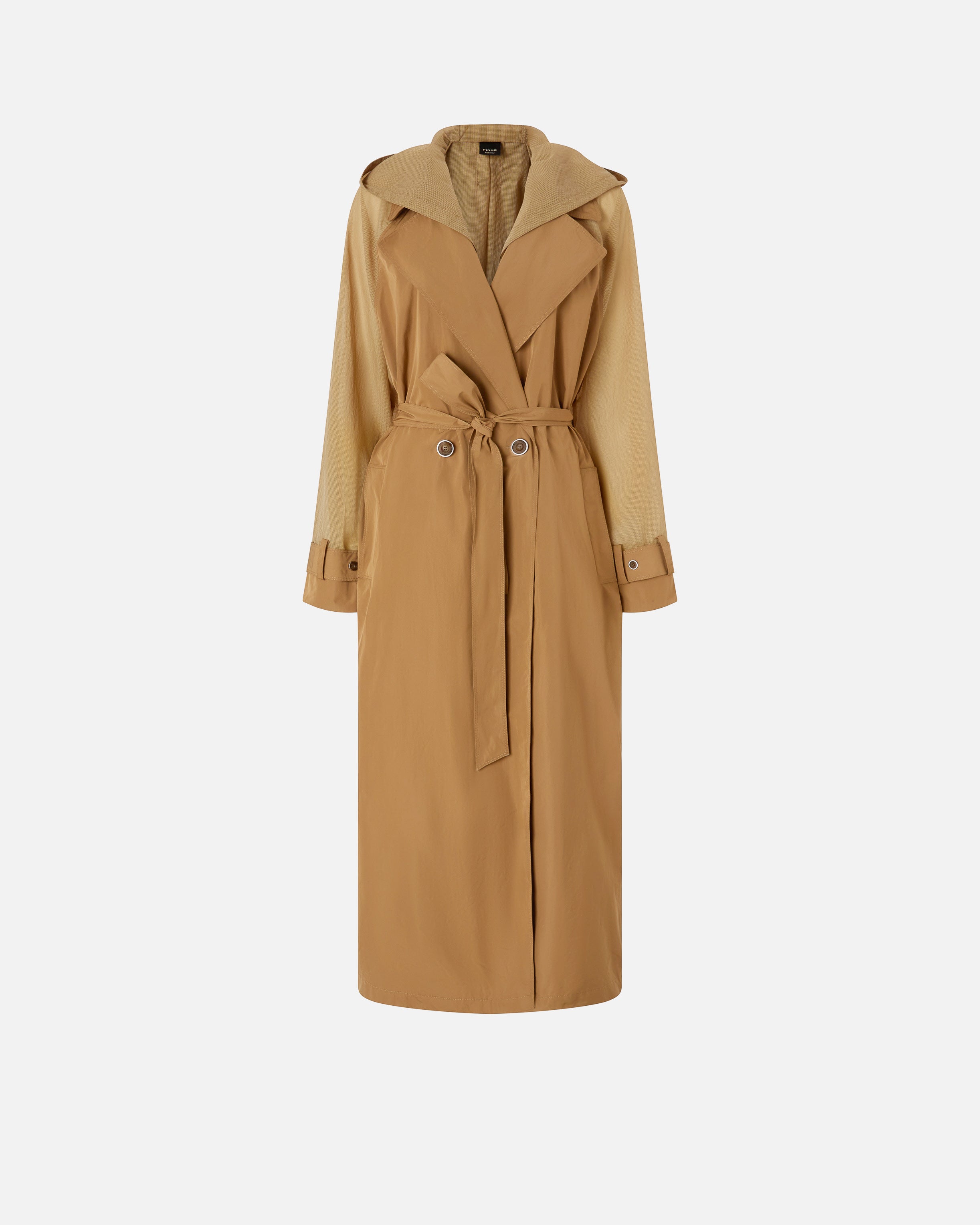 Μακριά καμπαρντίνα κατασκευασμένη από διπλό τεχνικό ύφασμα με μανίκια και πίσω μέρος από ύφασμα ripstop με όψη ημιδιαφανούς οργάντζας. Το εκλεπτυσμένο παιχνίδι αντιθέσεων που δημιουργούν τα δύο υφάσματα συνδυάζεται με πιο λειτουργικές λεπτομέρειες όπως η κουκούλα, το φαρδύ πέτο, οι τσέπες με φιλέτο και τα ζωνάκια με κουμπιά στην άκρη των μανικιών. Το σταυρωτό κλείσιμο με δύο κουμπιά ολοκληρώνεται με μια αφαιρούμενη ζώνη που δένεται στη μέση τονίζοντας τη γυναικεία σιλουέτα.