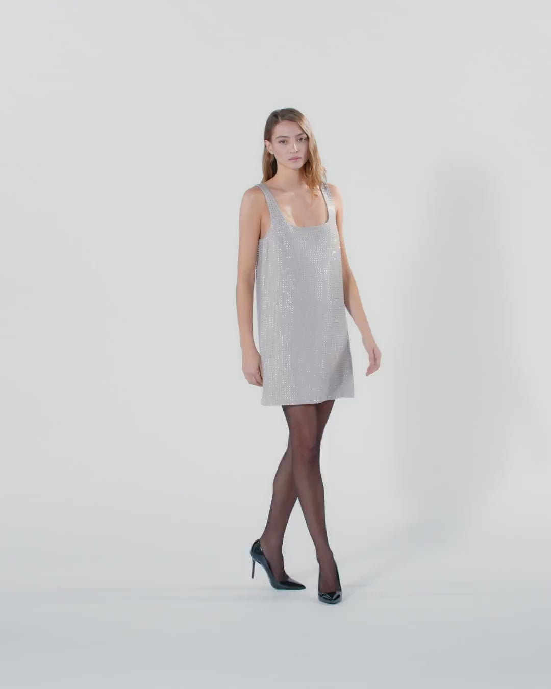 Κοντό φόρεμα σε ελαφρά εβαζέ γραμμή με τιραντάκια, τετράγωνη λαιμόκοψη και φερμουάρ πίσω. Τα πολλαπλά ασορτί στρας είναι οι πραγματικοί πρωταγωνιστές του look, καλύπτουν ολόκληρη την επιφάνεια και προσδίδουν στο ρούχο μια λαμπερή πινελιά. Αυτό το πρωτότυπο μοντέλο θα φωτίσει αναμφισβήτητα τις βραδιές και τα outfits σας.