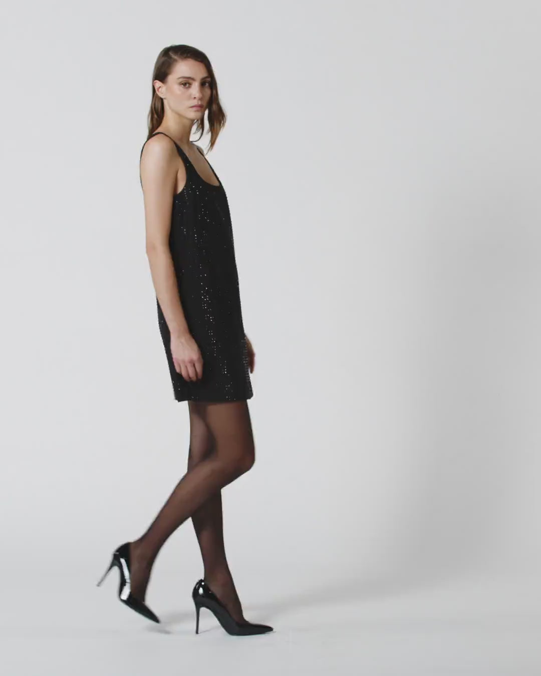 Κοντό φόρεμα σε ελαφρά εβαζέ γραμμή με τιραντάκια, τετράγωνη λαιμόκοψη και φερμουάρ πίσω. Τα πολλαπλά ασορτί στρας είναι οι πραγματικοί πρωταγωνιστές του look, καλύπτουν ολόκληρη την επιφάνεια και προσδίδουν στο ρούχο μια λαμπερή πινελιά. Αυτό το πρωτότυπο μοντέλο θα φωτίσει αναμφισβήτητα τις βραδιές και τα outfits σας.