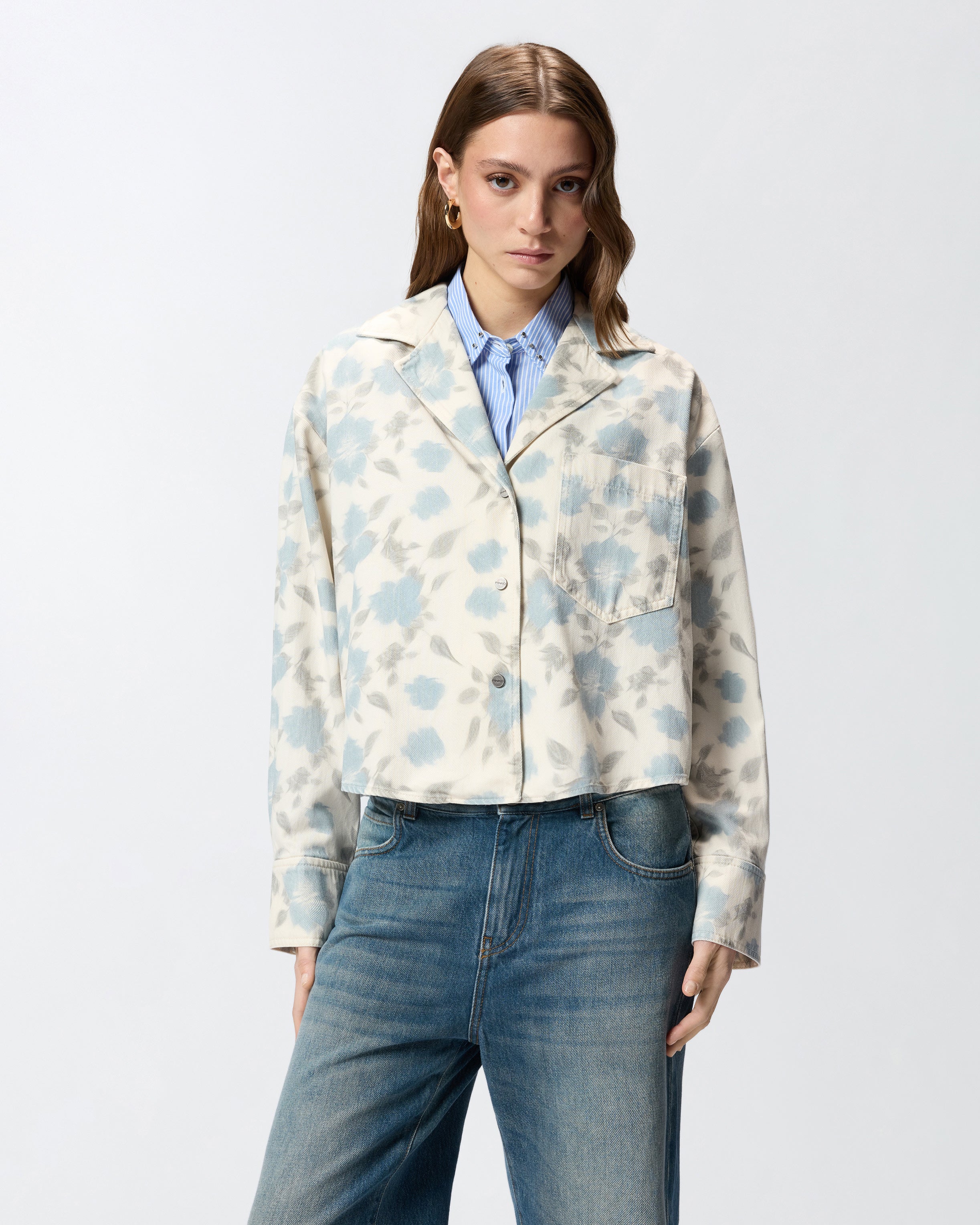 Πουκάμισο σε boxy γραμμή, τέλειο και σαν ελαφρύ τζάκετ, με γιακά με πέτο, μανσέτες με κουμπιά, εξωτερικό τσεπάκι στο στήθος, κούμπωμα μπροστά και ωμίτη στην πλάτη με διπλή πιέτα. Η ιδιαιτερότητα του ρούχου είναι το σχέδιό του: το μοτίβο Cottage Flower που διακοσμεί όλη την επιφάνεια του υφάσματος, ένα λεπτό ύφασμα bull από βαμβάκι και lyocell που απεικονίζει εκλεπτυσμένα λουλούδια σε λεπτές αποχρώσεις. Το πουκάμισο είναι φοδραρισμένο για περισσότερη άνεση.