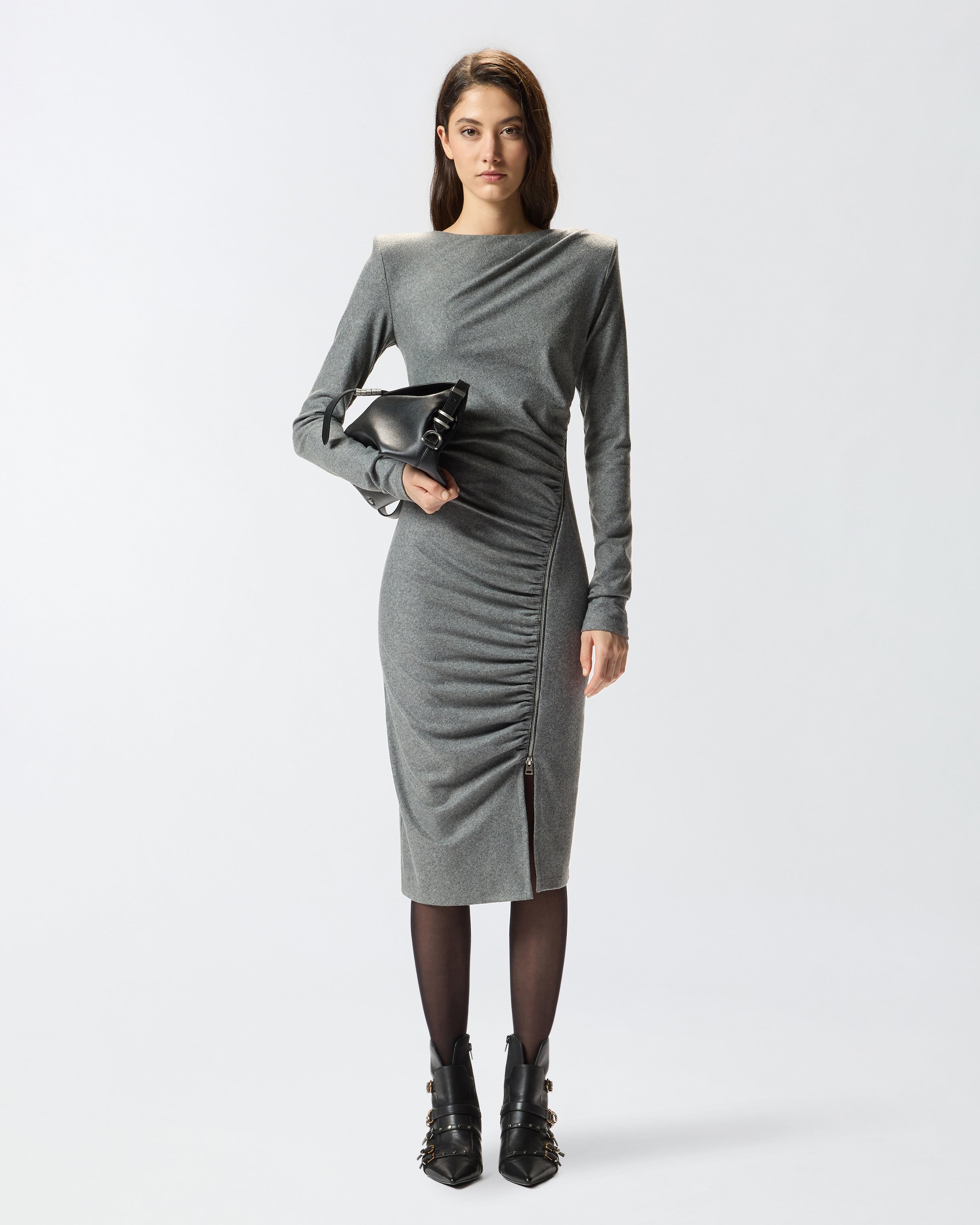 Εφαρμοστό μίντι φόρεμα με μακριά μανίκια, δομημένους ώμους και γιακά με κουμπάκι και μικρό άνοιγμα πίσω, από ύφασμα φανέλα με σύμμεικτο μαλλί, βαμμένο στο νήμα, που συνδυάζει απαλότητα, ελαστικότητα και άνεση. Το μοντέλο έχει απλό ύφος, που όμως εμπλουτίζεται με εντυπωσιακές λεπτομέρειες όπως το δυναμικό ντραπάρισμα μπροστά και τα πλαϊνά φερμουάρ που ρυθμίζουν το άνοιγμα του σκισίματος. Η φούστα είναι ιδανική για να δημιουργήσετε καθημερινά σύνολα με μια θηλυκή και προσωπική πινελιά, που θα φορέσετε και στο γραφείο.