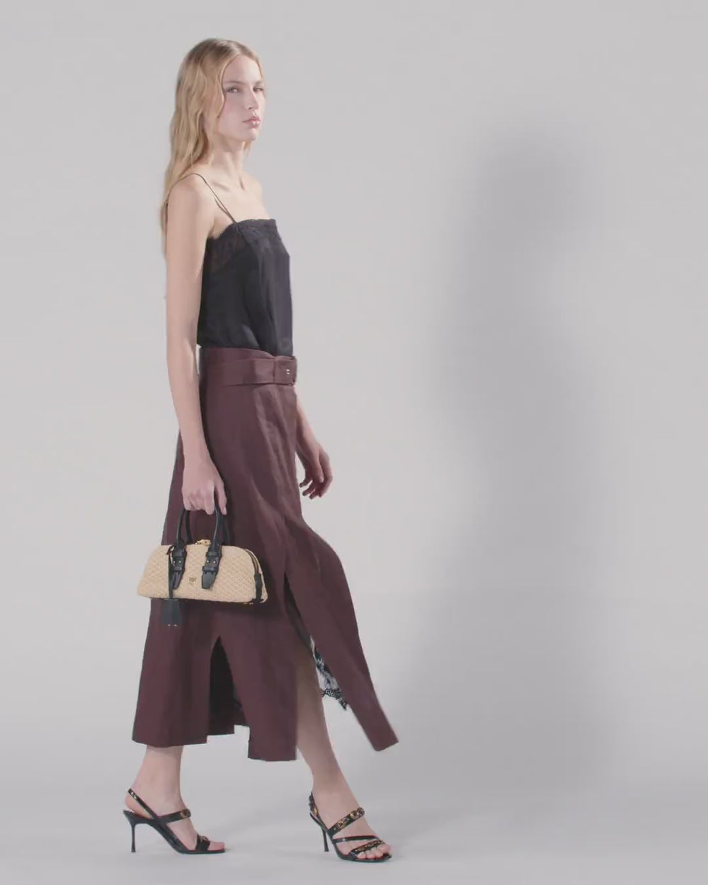 Μίντι φόρεμα σε ίσια γραμμή, ελαφρώς εβαζέ προς το τελείωμα στο κάτω μέρος. Ένας αυθεντικός ύμνος στη δημιουργική έκφραση της PINKO, το φόρεμα ξεχωρίζει για την πρωτότυπη αντίθεση υλικών και στυλ ανάμεσα στο επάνω και στο κάτω μέρος. Το επάνω μέρος, με έμπνευση από το στυλ lingerie, διαθέτει λεπτές τιράντες και εκτείνεται σχεδόν μέχρι το τελείωμα στο κάτω μέρος του φορέματος. Είναι διακοσμημένο με τμήματα από εκλεπτυσμένη δαντέλα βαλανσιέν, που δημιουργούν κομψές διαφάνειες, και είναι ραμμένο στη φούστα μόνο στο πίσω μέρος, ώστε να εξασφαλίζει μεγαλύτερη άνεση και ελευθερία κινήσεων. Το κάτω μέρος, κατασκευασμένο από λινό ύφασμα με τη χαρακτηριστική ακανόνιστη υφή αυτού του υφάσματος, διακρίνεται για την κατασκευή με φαρδιά τμήματα και βαθιά σκισίματα, τα οποία αφήνουν να διαφαίνεται η συνέχεια του επάνω μέρους, προσδίδοντας αισθησιασμό σε όλη την εμφάνιση. Το φόρεμα αυτό, με μοναδικό και εκλεπτυσμένο σχεδιασμό, που μπορεί να φορεθεί ως βραδινό σύνολο ή ως καλοκαιρινό φόρεμα για επίσημη βραδινή περίσταση, ολοκληρώνεται με κλείσιμο με φερμουάρ μπροστά στο κάτω μέρος για εύκολη εφαρμογή και με αφαιρούμενη και ρυθμιζόμενη ασορτί λινή ζώνη.