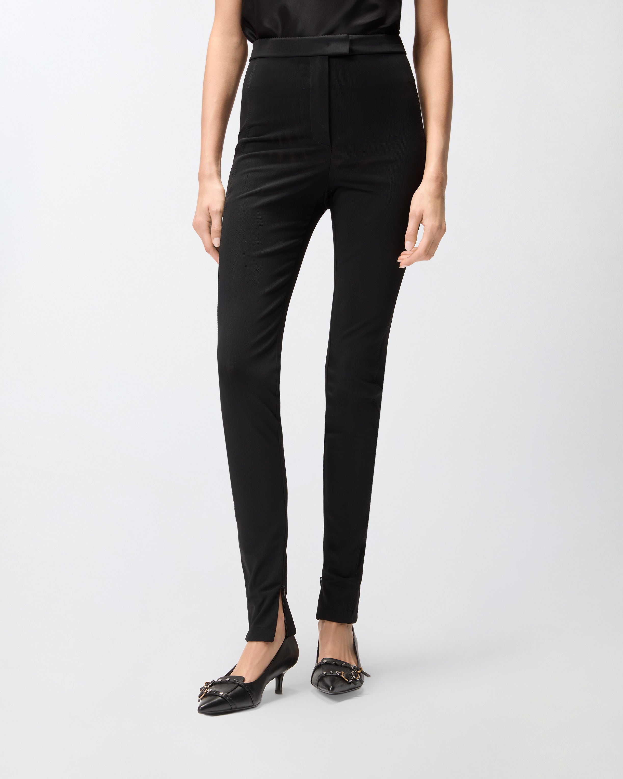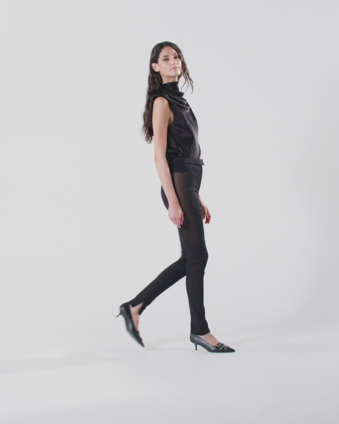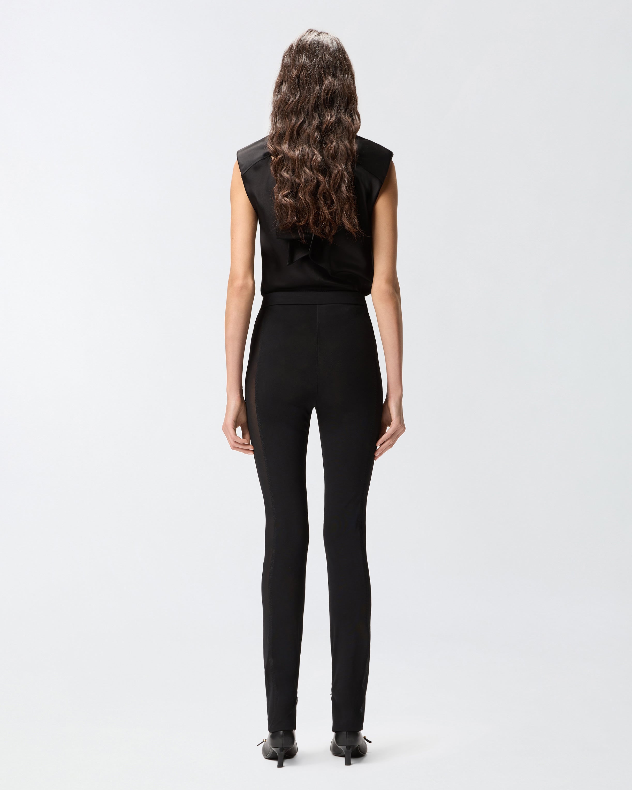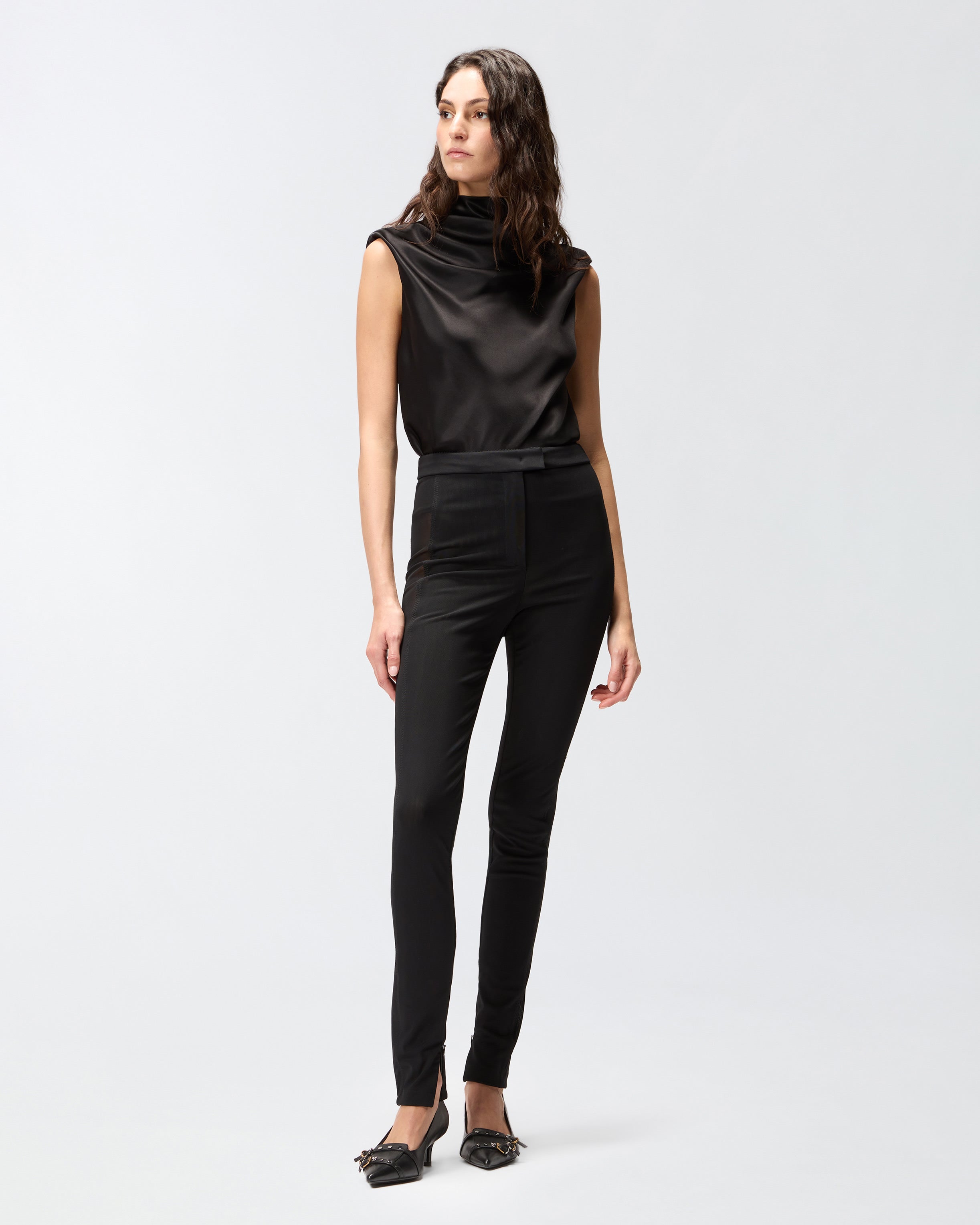 Μακρύ παντελόνι σε στενή γραμμή, με διαφανή πλευρικά τμήματα σε όλο το μήκος στα μπατζάκια και φερμουάρ στο τελείωμα. Το ύφασμα, ένα «ύφασμα κορσέ» μεγάλης ελαστικότητας, προσφέρει στο ρούχο την ιδιότητα να «σμιλεύει» τη σιλουέτα, αναδεικνύοντας τις καμπύλες με φυσικό και αρμονικό τρόπο. Το ρούχο εξασφαλίζει απόλυτη άνεση, αγκαλιάζοντας το σώμα χωρίς να περιορίζει την ελευθερία κινήσεων και προσφέροντας εφαρμογή που τονίζει τη σιλουέτα με διακριτικότητα και κομψότητα.