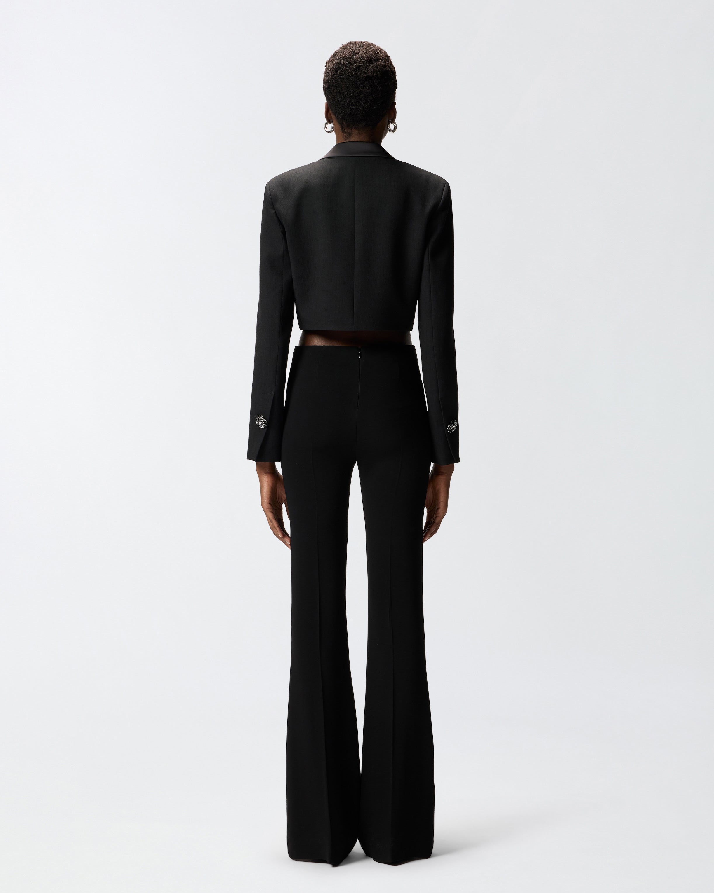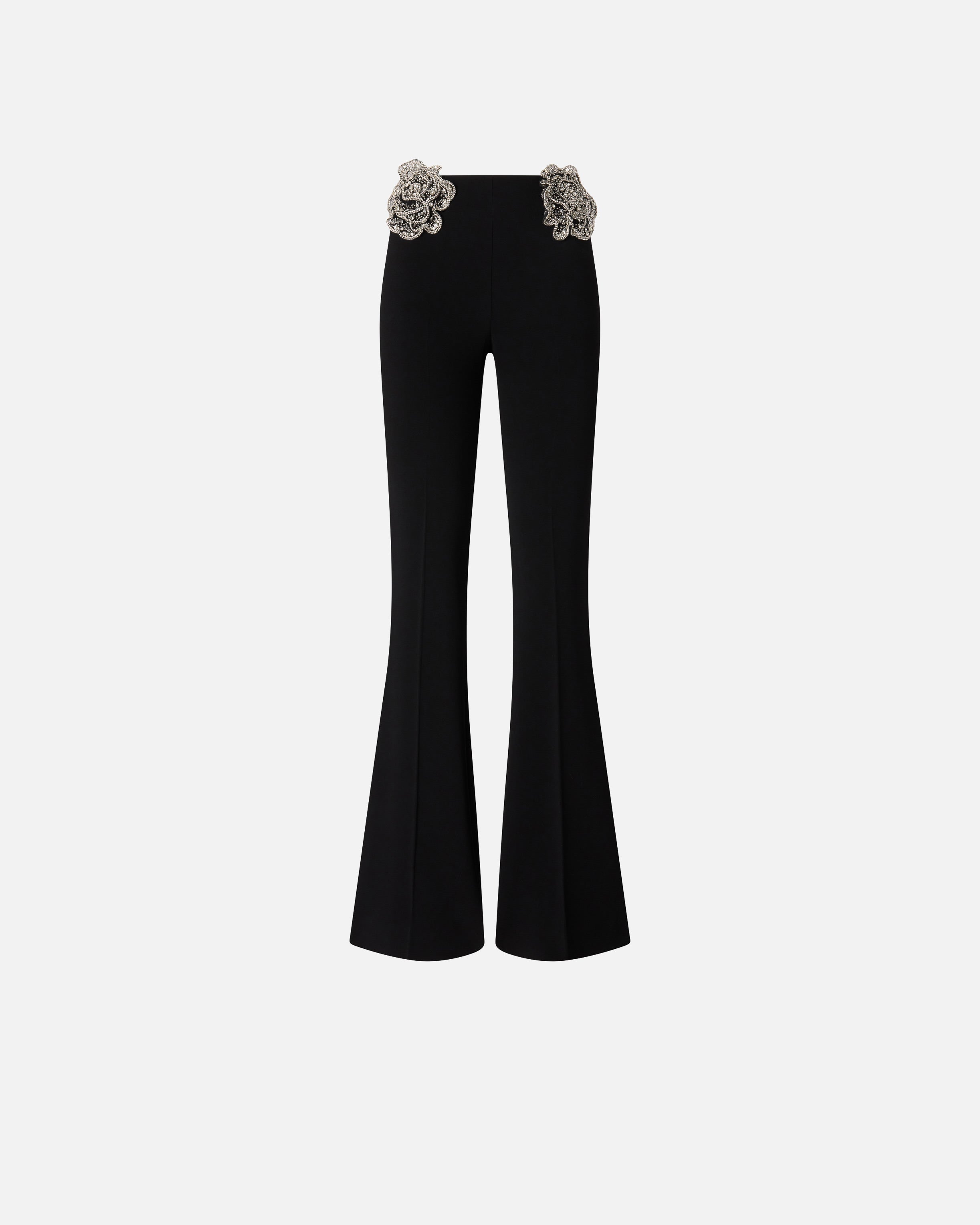 Καμπάνα παντελόνι από ελαστική βισκόζη, ένα απαλό, περιβάλλον ύφασμα που γλιστράει φυσικά πάνω στο σώμα, ορίζοντας κομψά τη σιλουέτα και προσφέροντας άψογη εφαρμογή. Το κομμάτι διαθέτει μια εκλεπτυσμένη, πιεσμένη πιέτα στο μπροστινό και πίσω μέρος και κλείσιμο με φερμουάρ στην πλάτη. Το βασικό στοιχείο, ωστόσο, είναι τα δύο τριαντάφυλλα στο μπροστινό μέρος: εξαιρετικά χειροκέντητα, με πέταλα λεπτά ενθετωμένα με κρύσταλλα που αντανακλούν κομψά το φως. Ιδανικό για μια ιδιαίτερη βραδιά ή ένα αποκλειστικό πάρτι, ειδικά όταν συνδυάζεται με το ταιριαστό τοπ, αυτό το πολύτιμο και θηλυκό κομμάτι θα σας μετατρέψει στην αδιαμφισβήτητη βασίλισσα του πάρτι.