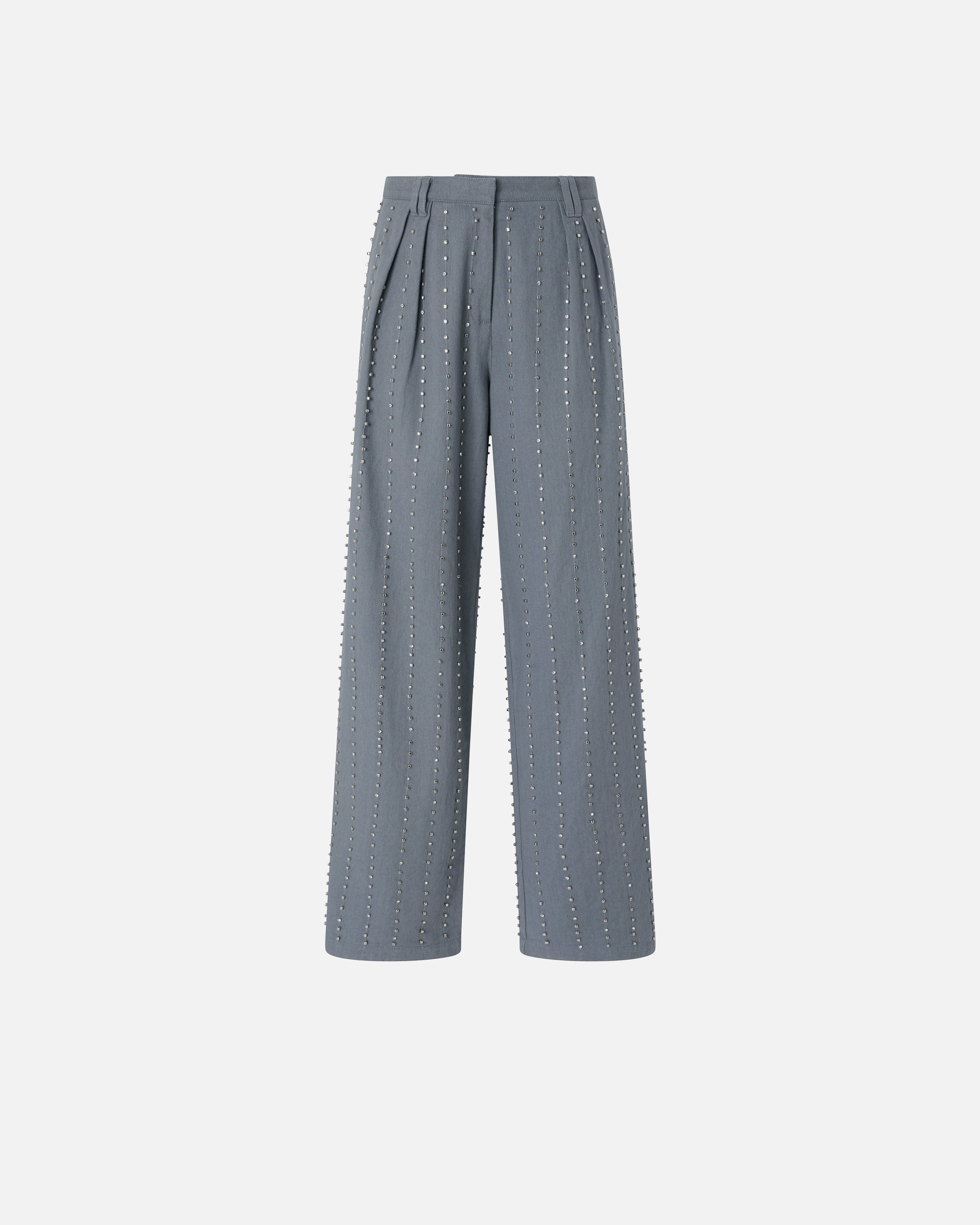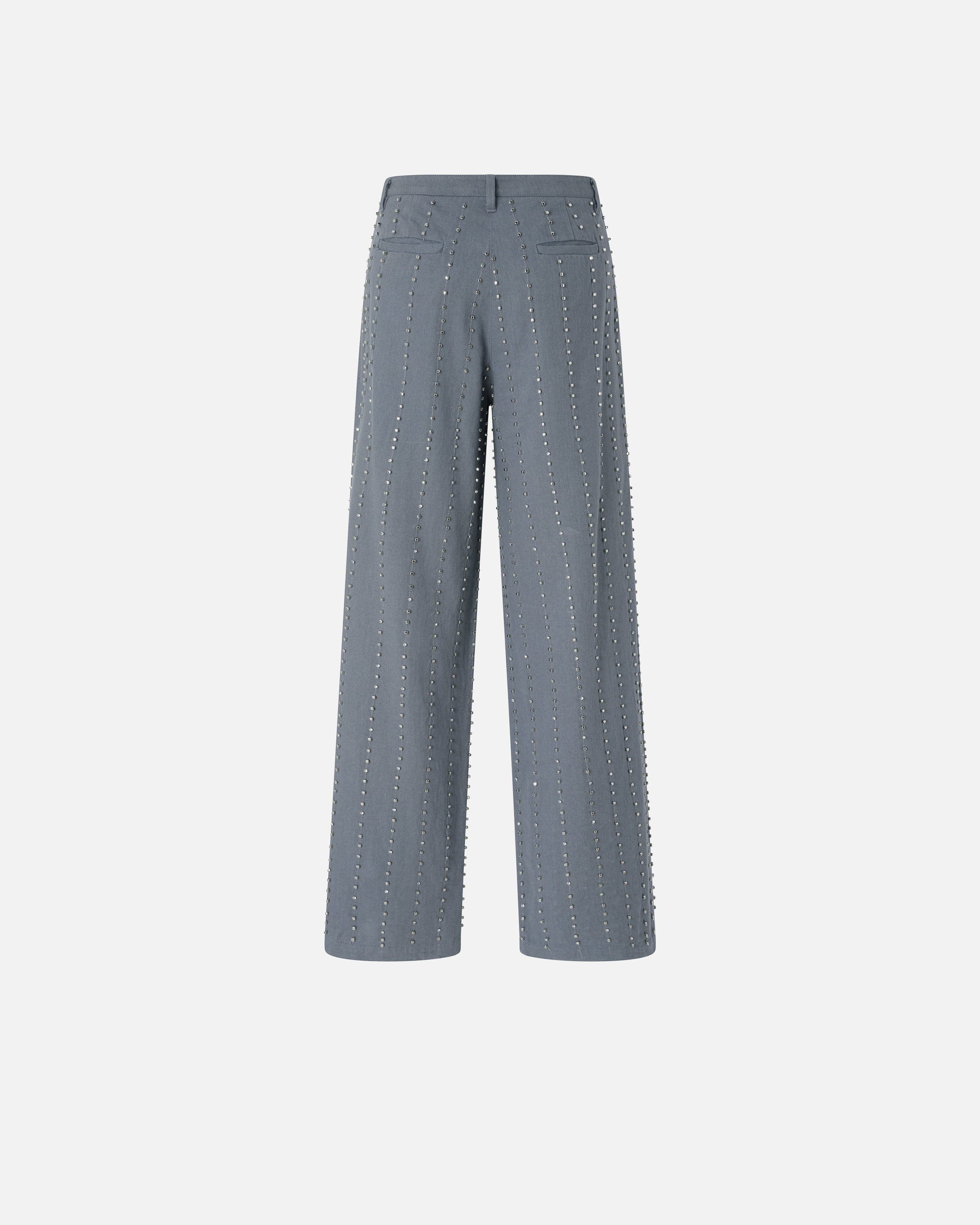 Παντελόνι από αγνό βαμβακερό twill με παχιά, ρέουσα όψη, με πλαϊνές τσέπες, πίσω τσέπες welt και εκλεπτυσμένες μπροστινές πιέτες. Το κομμάτι αισθάνεται σαν αληθινό κόσμημα, χάρη στο διακριτικό του σχέδιο εμπνευσμένο από ριγέ, που επιτυγχάνεται με την εναλλαγή μικρών μεταλλικών στοιχείων σε σχήμα κύβου και χειροκέντητων κρυστάλλων. Το κομμάτι είναι επενδυμένο για επιπλέον άνεση.