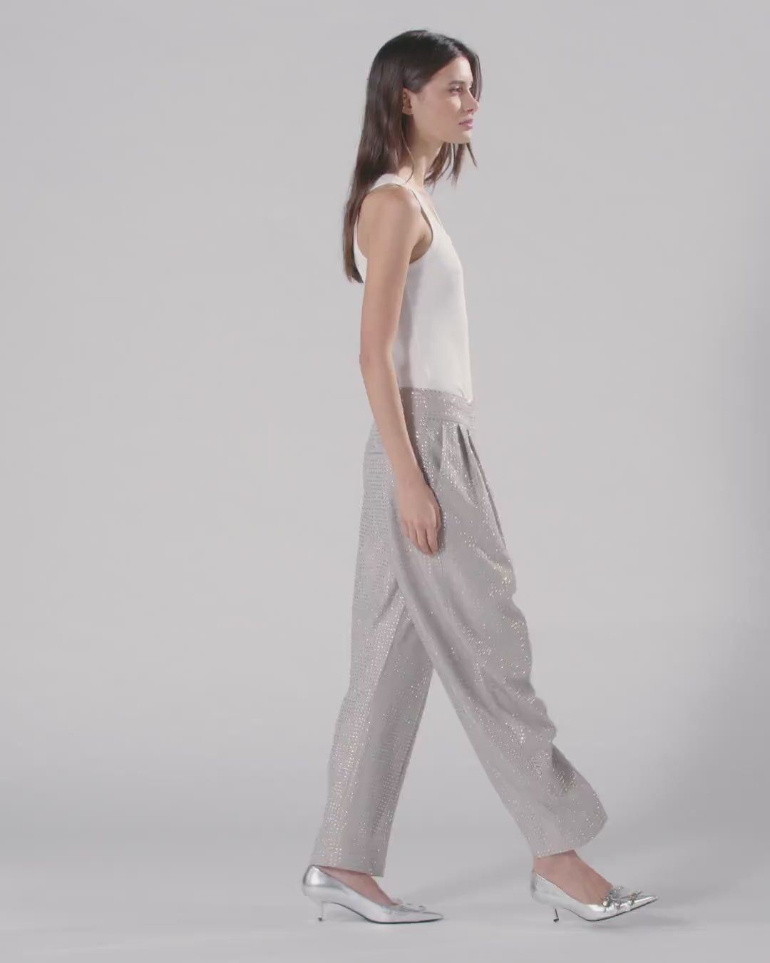 Γυναικείο παντελόνι από χυτή, ελαστική σύμμεικτη βισκόζη με βαμμένο νήμα, διακοσμημένο με λαμπερά στρας σε όλη την επιφάνεια, μπροστά και πίσω σε όλο το μήκος του ρούχου. Η φαρδιά γραμμή στα μπατζάκια αναδεικνύεται με τις κλασικές πένσες στη μέση, που προσθέτουν φάρδος. Το κλασικό αυτό παντελόνι με στρας έχει στυλ business με μια λαμπερή πινελιά που δίνει κομψότητα στο ντύσιμό σας. Φορέστε το με το ασορτί σακάκι για ένα καθημερινό πρωτότυπο και θηλυκό σύνολο. Είναι χαμηλόμεσο και διαθέτει λοξές πλευρικές τσέπες, τσέπες με φιλέτο πίσω και κλείσιμο με διπλή κόπιτσα ανδρικού παντελονιού στη μέση και φερμουάρ.