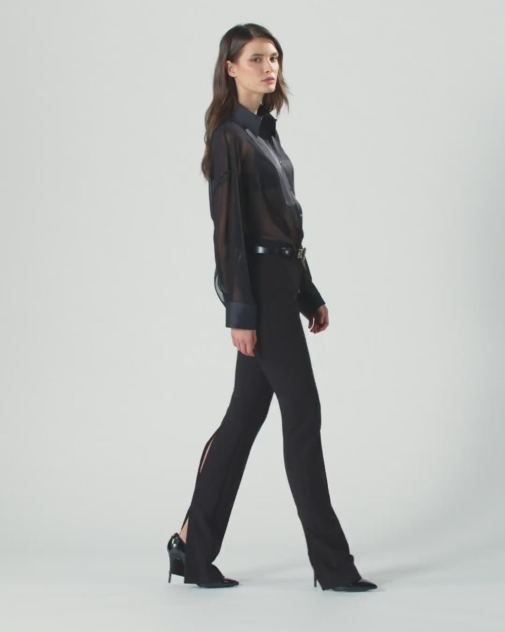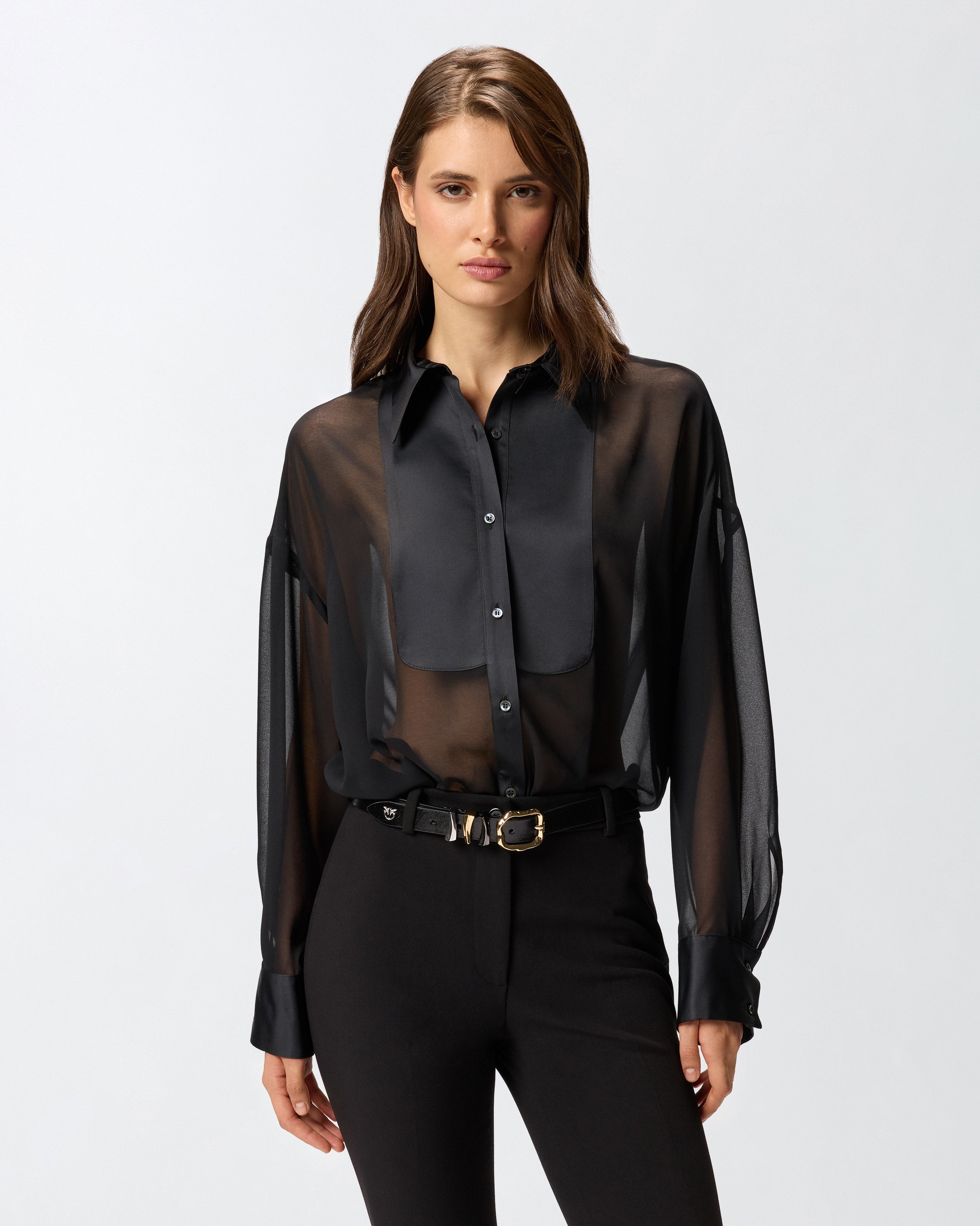 Μακρυμάνικο πουκάμισο σε κλασικό στυλ, με μυτερό γιακά, μανσέτες και ορθογώνιο τμήμα στο κούμπωμα. Ο συνδυασμός του υφάσματος από ζορζέτα με το αδιαφανές φινίρισμα και το εκλεπτυσμένο σατέν, δημιουργούν μια απαλή αίσθηση διαφάνειας. Η λεπτομέρεια όμως που κάνει τη διαφορά είναι το μικρό κόψιμο που σχηματίζει ο γιακάς πίσω από το λαιμό, μια απροσδόκητη και εντυπωσιακή πινελιά.