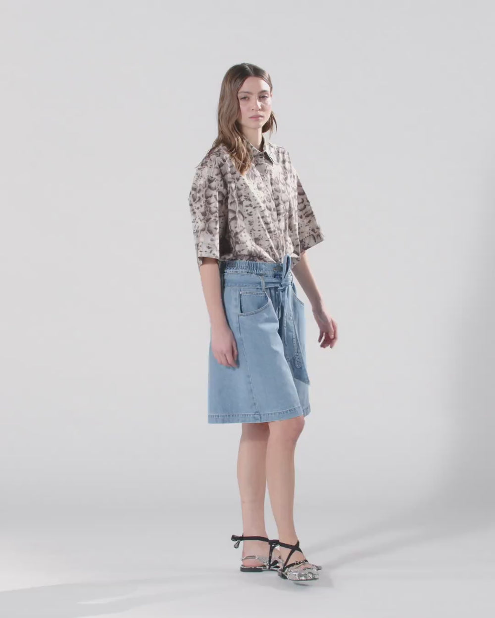 Βερμούδα σε γραμμή wide-leg με φαρδιά και άνετα μπατζάκια, από καθαρό βαμβακερό denim με ξεθωριάσματα τοπικά για ελαφρώς used όψη. Εκτός από τις κλασικές πέντε τσέπες και το κρυφό κούμπωμα με καρφωτό κουμπί με λογότυπο, το τζιν διαθέτει άνετη ελαστική μέση στο πίσω μέρος και ζώνη από το ίδιο ύφασμα, με ανάγλυφο λογότυπο PINKO και ξεφτισμένα τελειώματα. Το λογότυπο του brand διακοσμεί επίσης μία από τις δύο πίσω τσέπες με τη μορφή μικρής κεντητής λεπτομέρειας.