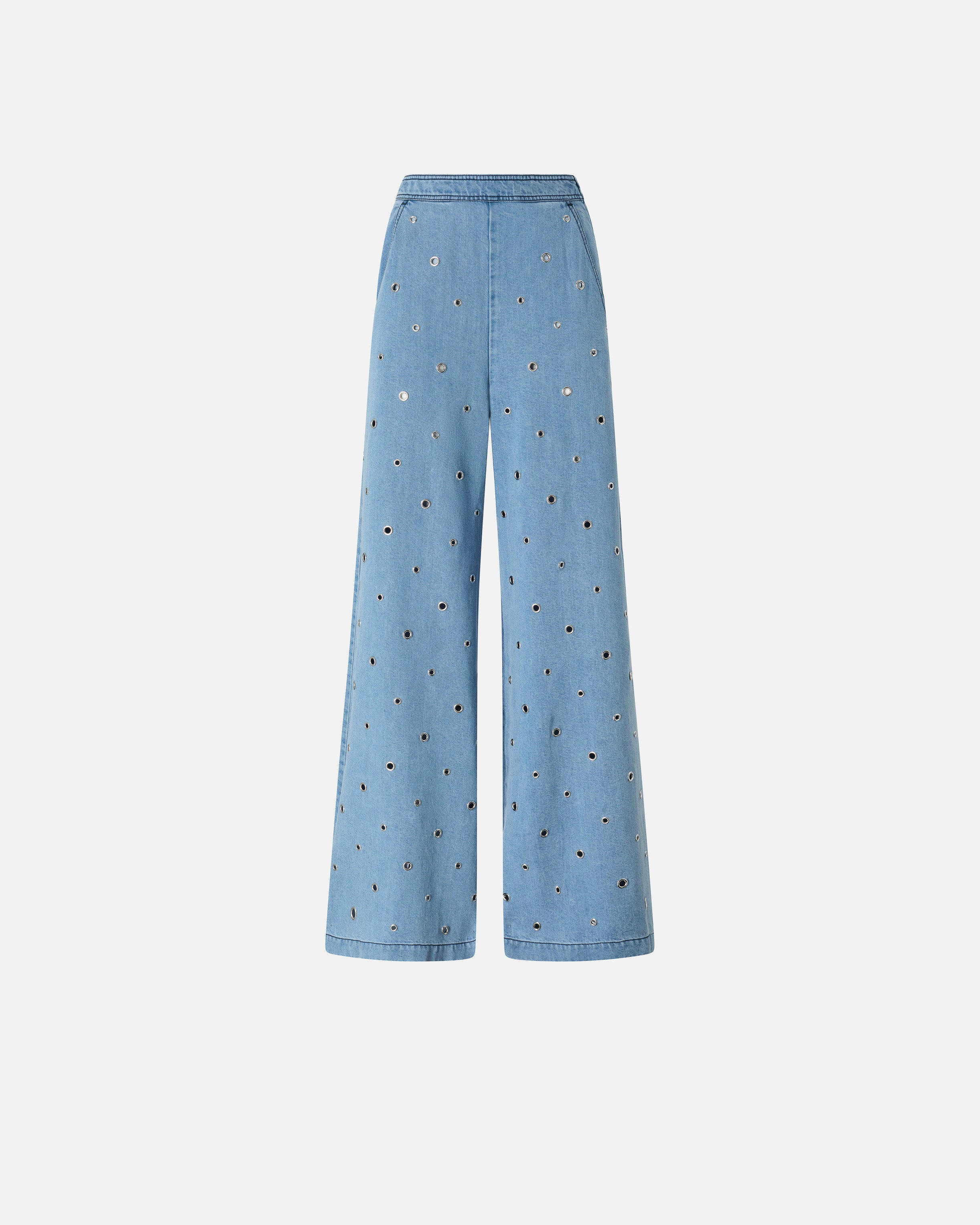 Παντελόνι με εβαζέ γραμμή με λοξές πλευρικές τσέπες και κλείσιμο με πλευρικό φερμουάρ. Ξεχωρίζει για την ιδιαίτερη επεξεργασία του: το λεπτό και χυτό ύφασμα denim από καθαρό lyocell έχει ξεθωριασμένο χρώμα και είναι διακοσμημένο εξ ολοκλήρου με μικρά μεταλλικά καψούλια που δημιουργούν μια διακριτική διάτρητη όψη. Δώστε μια πρωτότυπη και statement πινελιά στο καθημερινό σας look συνδυάζοντας το τζιν με το ασορτί πουκάμισο.
