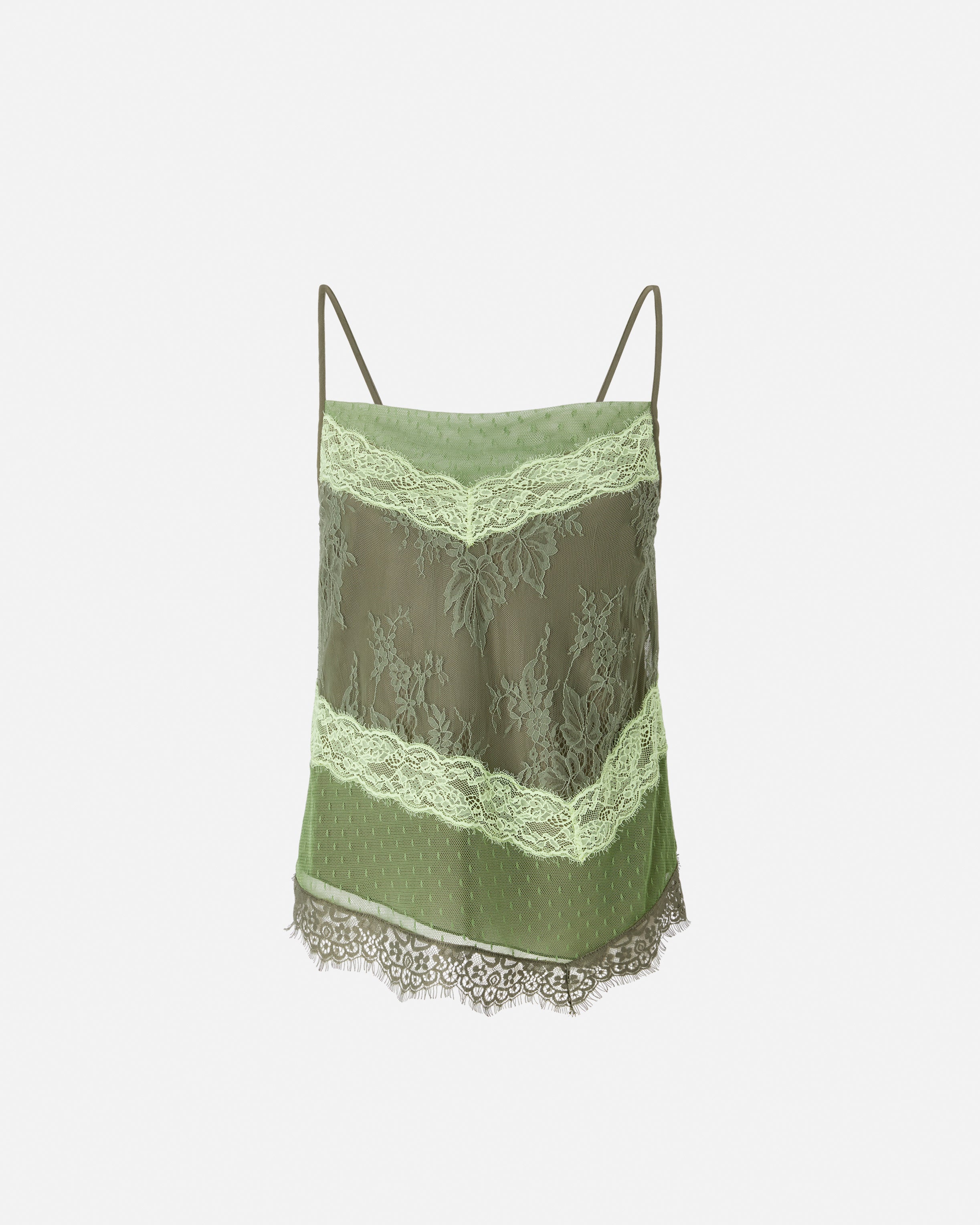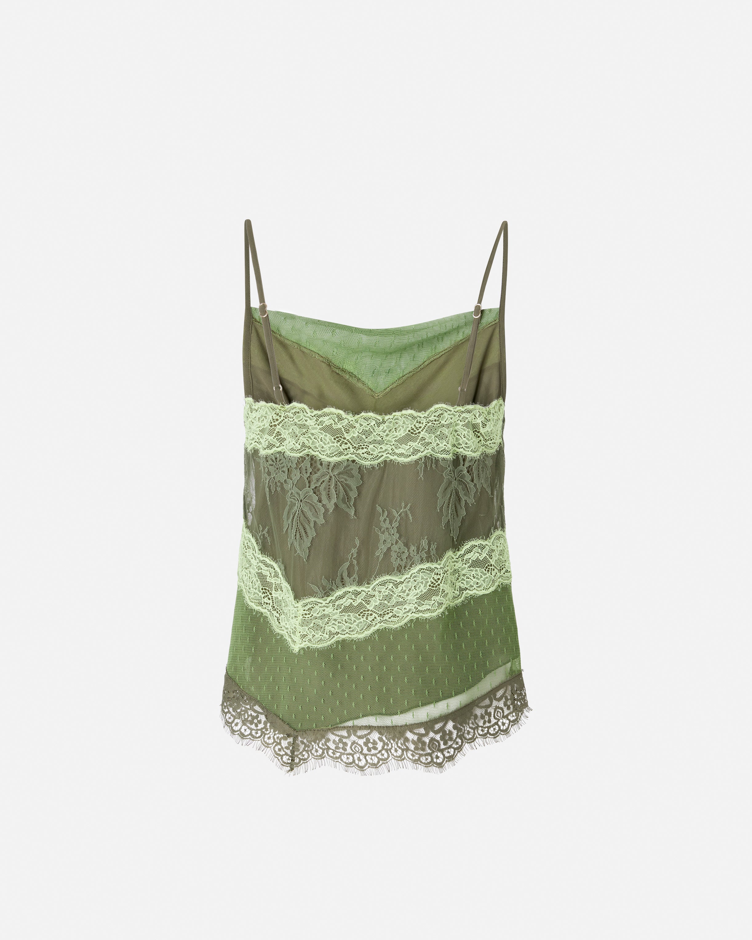 Τοπ με lingerie στυλ με λεπτές τιράντες και ίσιο, ελαφρώς ντραπέ ντεκολτέ. Ξεχωρίζει για το πρωτότυπο patchwork στυλ, που προκύπτει από τον συνδυασμό μιας κεντρικής φάσας με σχέδιο με λουλούδια και φύλλα, μιας φάσας κάτω με μικρό πουά μοτίβο και τμημάτων από δαντέλα με διακριτικά ξέφτια στο τελείωμα. Το κομμάτι διαθέτει επίσης φόδρα εσωτερικά που μετριάζει τη διαφάνεια και προσφέρει μεγαλύτερη άνεση. - RETROGUSTO TOP