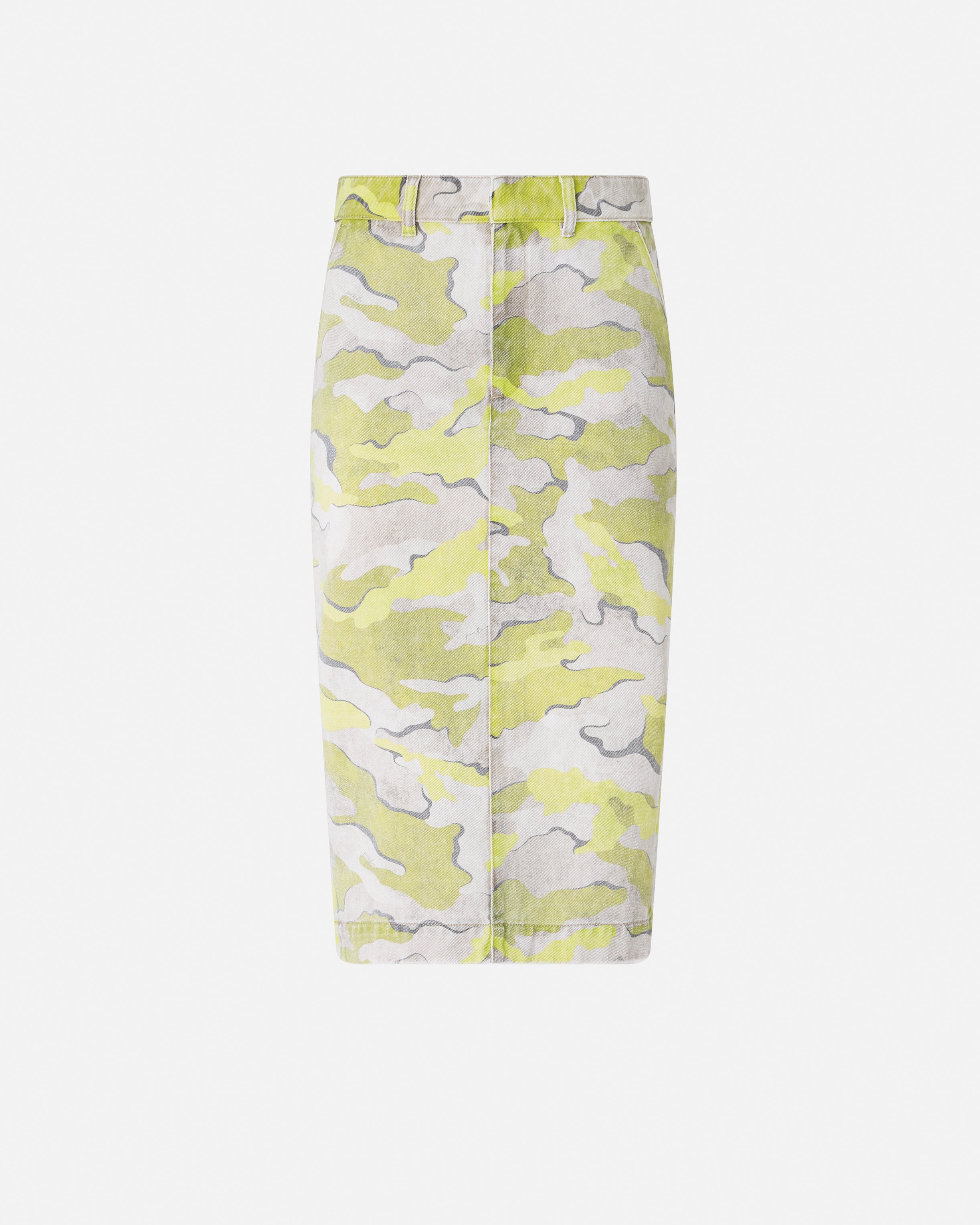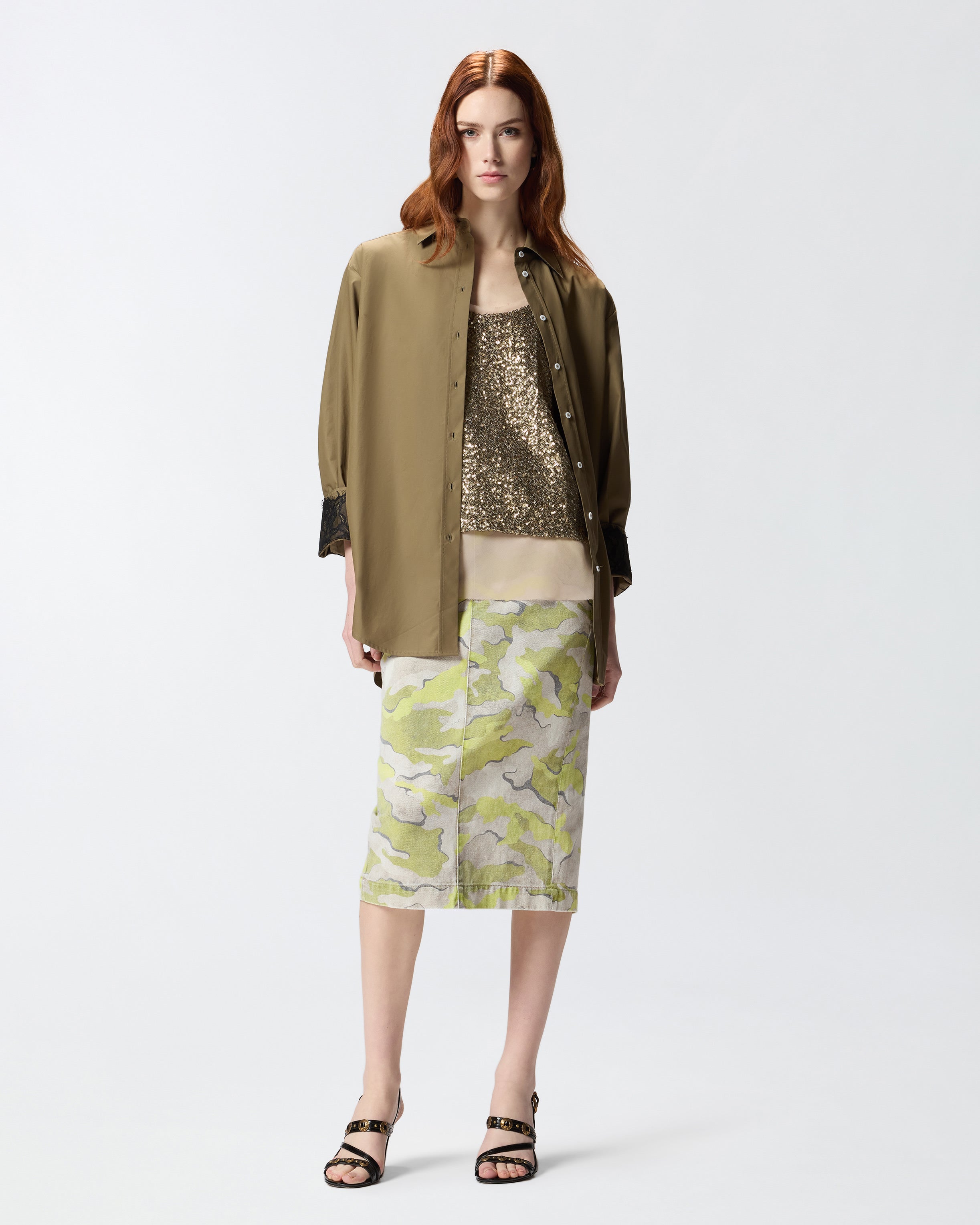 Φούστα με μήκος κάτω από το γόνατο σε ίσια και εφαρμοστή γραμμή, που διαθέτει κρυφό κλείσιμο μπροστά, λοξές πλευρικές τσέπες, μια τσέπη με φιλέτο και κουμπί πίσω και σκίσιμο πίσω στο κέντρο. Είναι κατασκευασμένη από βαμβακερό bull και ξεχωρίζει για το μοτίβο παραλλαγής σε όλη την επιφάνεια με urban και σύγχρονη αισθητική, ενώ διαθέτει θηλύκια για ζώνη στη μέση, ώστε να την προσαρμόζετε όπως θέλετε, προσθέτοντας την αγαπημένη σας ζώνη στο look. - TINAIA SKIRT