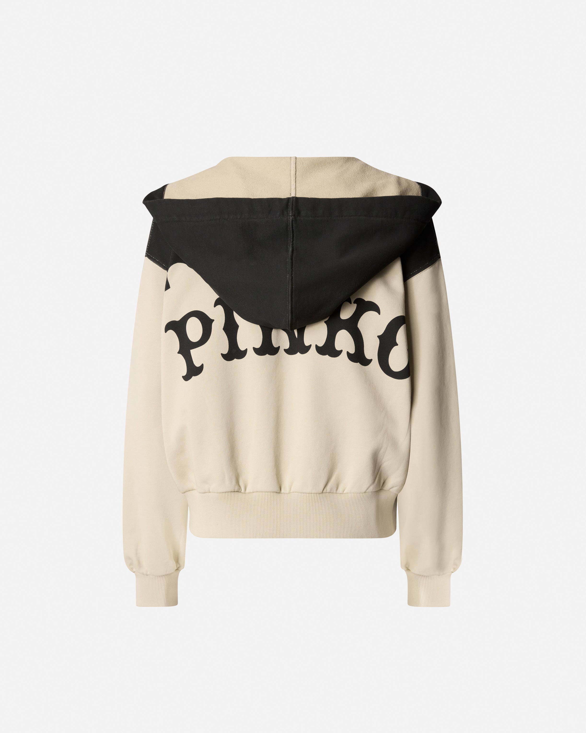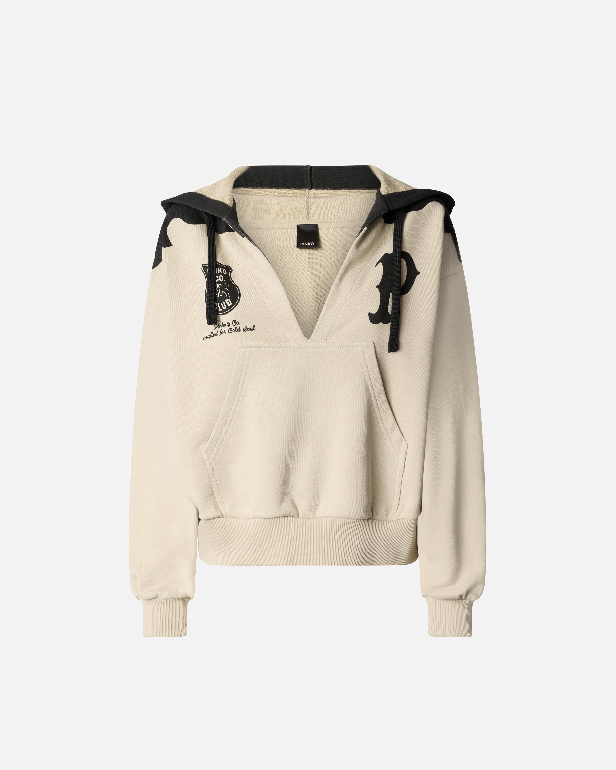 Φούτερ από βαμβακερό ύφασμα με λαιμόκοψη V, δίχρωμη κουκούλα με κορδόνι, τσέπη καγκουρό και ριμπ μανσέτες και τελείωμα στο κάτω μέρος. Χαρακτηρίζεται από στάμπες σε διαφορετικό χρώμα από το φούτερ σε στυλ ροντέο, όπως το λογότυπο PINKO πίσω, ο ωμίτης πίσω και το μονόγραμμα P μπροστά που συνοδεύεται από το σήμα PINKO Club. Φορέστε το φούτερ με το αγαπημένο σας τζιν για μια casual και σύγχρονη εμφάνιση.