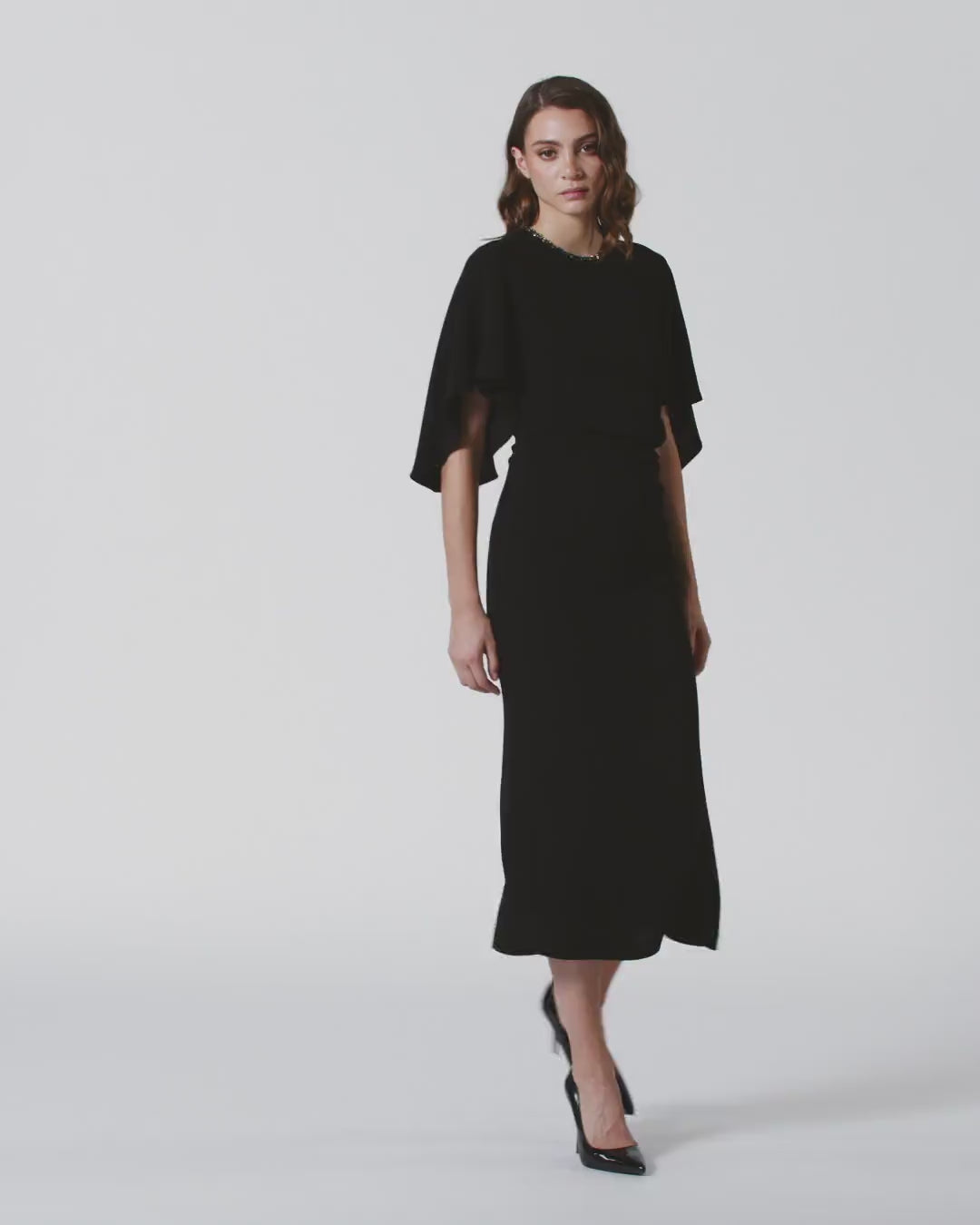 Μακρύ φόρεμα με φόδρα και εφαρμοστή γραμμή, με φαρδιά μανίκια τριών τετάρτων που είναι πιο μακριά στο πίσω μέρος και στρογγυλή λαιμόκοψη, διακοσμημένο με καστόνια και παγιέτες κεντημένες στο χέρι. Η γραμμή του φορέματος ακολουθεί και αναδεικνύει τις καμπύλες του σώματος, με σκίσιμο στο κάτω μέρος πίσω στο κέντρο. Το ύφασμα από τεχνική βισκόζη συνδυάζει απαλότητα και κίνηση, δημιουργώντας μια κομψή υφή που προσφέρει άνεση και άψογη εφαρμογή, χωρίς να χάνεται η δομημένη εμφάνιση του σχεδίου. Το υλικό έχει σχεδιαστεί για να εφαρμόζει τέλεια στις γραμμές του σώματος, αναδεικνύοντας τη σιλουέτα με φυσικό και ξεκάθαρο τρόπο. Τα μικρά κεντήματα με κρύσταλλα δημιουργούν ένα παιχνίδι φωτός που τονίζει την υφή του υφάσματος και δίνει κίνηση στην εμφάνιση, χωρίς να χάνεται το τελικό δομημένο και θηλυκό στυλ.