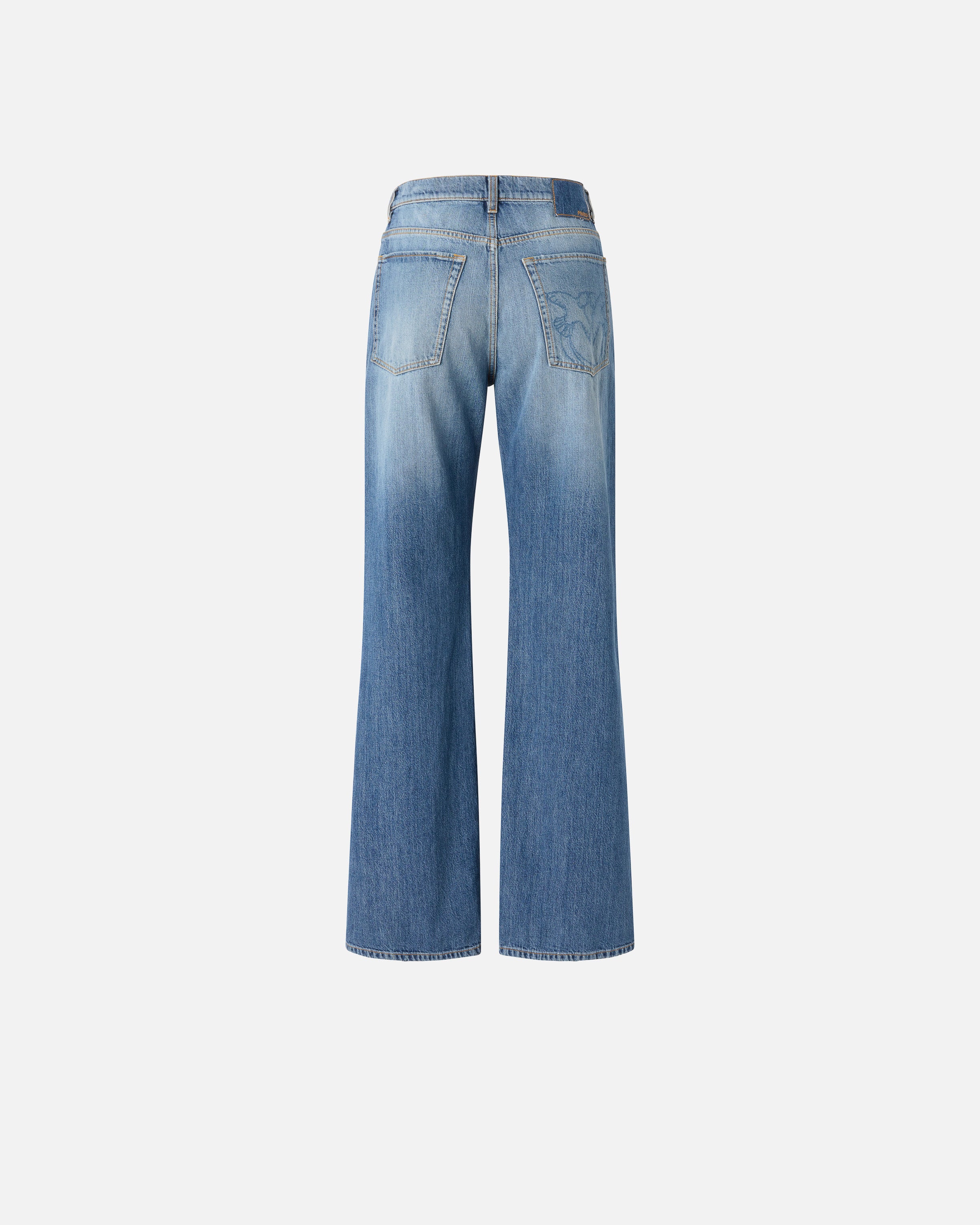 Πεντάτσεπο τζιν με φαρδιά μπατζάκια από καθαρό βαμβακερό denim με απαλή υφή, που χαρακτηρίζεται από μέτριο χρώμα με έντονα ξεθωριάσματα για μια εντυπωσιακή vintage όψη. Αυτό το τζιν με το αυθεντικό στυλ της PINKO είναι διακοσμημένο με κεντημένο λογότυπο του brand πίσω στη μέση και με το λογότυπο Love Birds, κεντημένο στη δεξιά πίσω τσέπη. Μοντέρνο και ευκολοφόρετο, αυτό το τζιν θα γίνει ο απόλυτος πρωταγωνιστής των καθημερινών σας συνόλων.