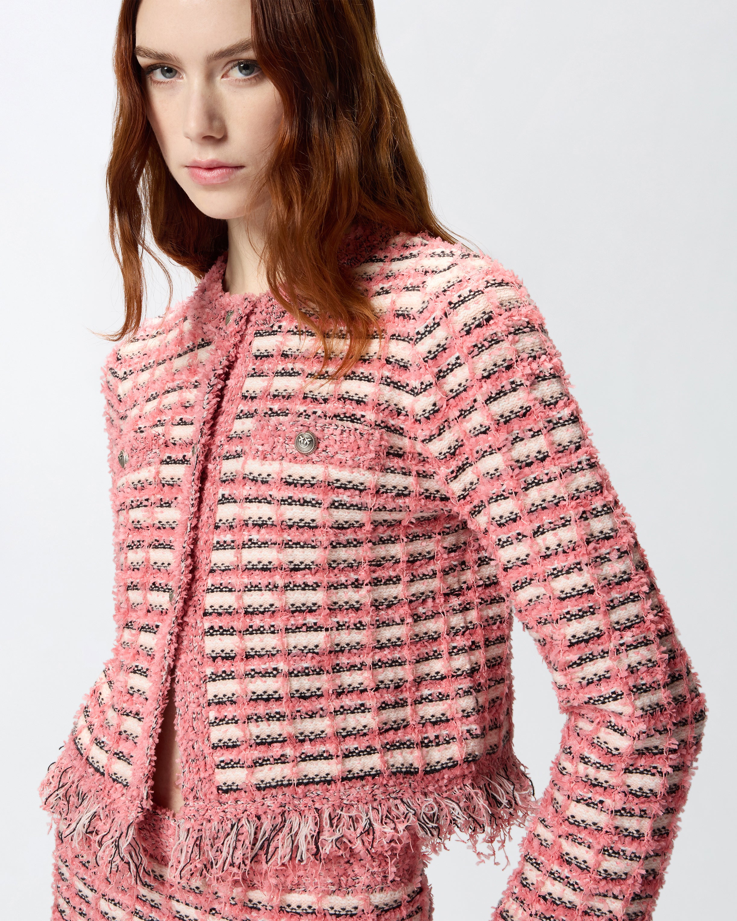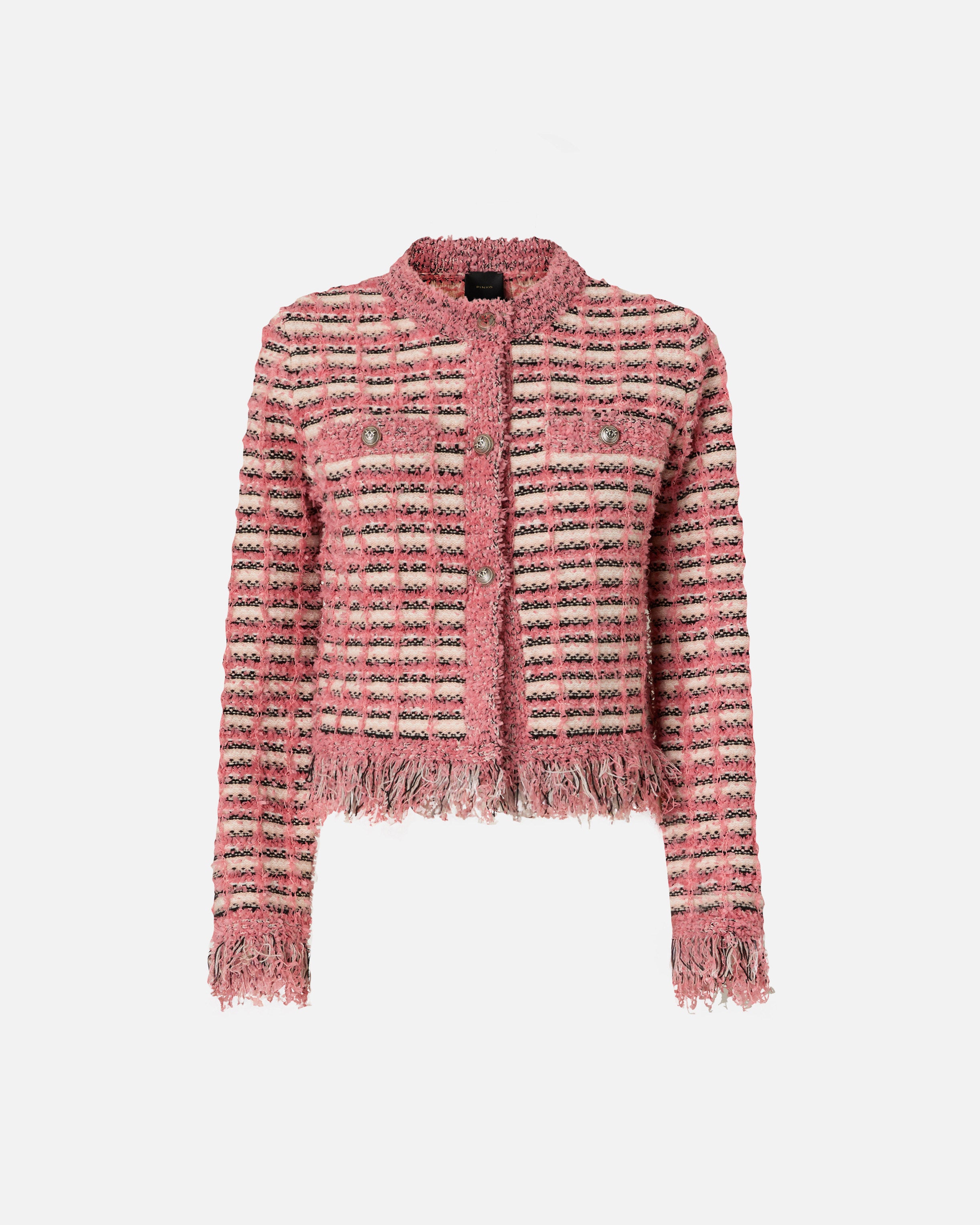 Σακάκι σε cropped γραμμή με στρογγυλή λαιμόκοψη, κατασκευασμένο από υφαντό ύφασμα με τουίντ όψη και χαρακτηριστικό καρό σχέδιο με περιγράμματα από πλεκτό ύφασμα, ελαφρώς ξεφτισμένο. Το τελείωμα στο κάτω μέρος και στα μανίκια διαθέτει πιο έντονα κρόσσια, ενώ τα μεταλλικά κουμπιά με το εμβληματικό λογότυπο Love Birds χαρακτηρίζουν το μπροστινό κλείσιμο και τα δύο τσεπάκια στο στήθος. Η ζακάρ ετικέτα με το λογότυπο PINKO πίσω χαρίζει την τελική πινελιά στυλ. Φορέστε αυτό το σακάκι με την ασορτί μίνι φούστα για ένα θηλυκό total look, ιδανικό για επίσημες περιστάσεις. - SPUMA JACKET