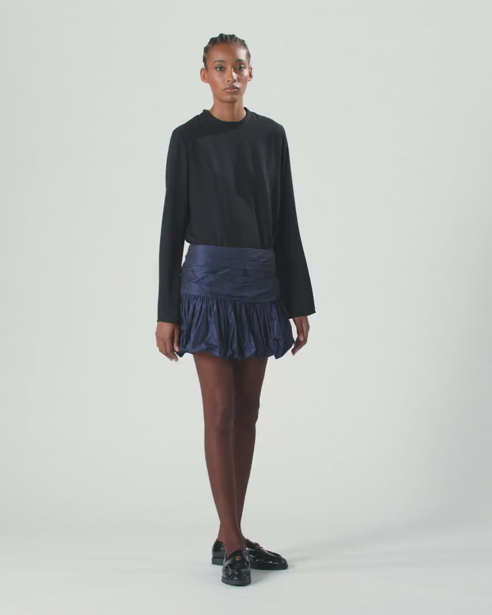 Miniskirt with draped band and zip on the back, made of taffeta. The fabric, light and shiny, creates iridescent reflections and blends perfectly with the soft and dynamic volume that distinguishes the garment. The studied cuts and contemporary lines of this short skirt are enriched by distinctive details, such as the balloon-effect hem and the draped bands. Overall, the final look is spectacular and impactful, also accentuated by the slightly crinkled fabric.