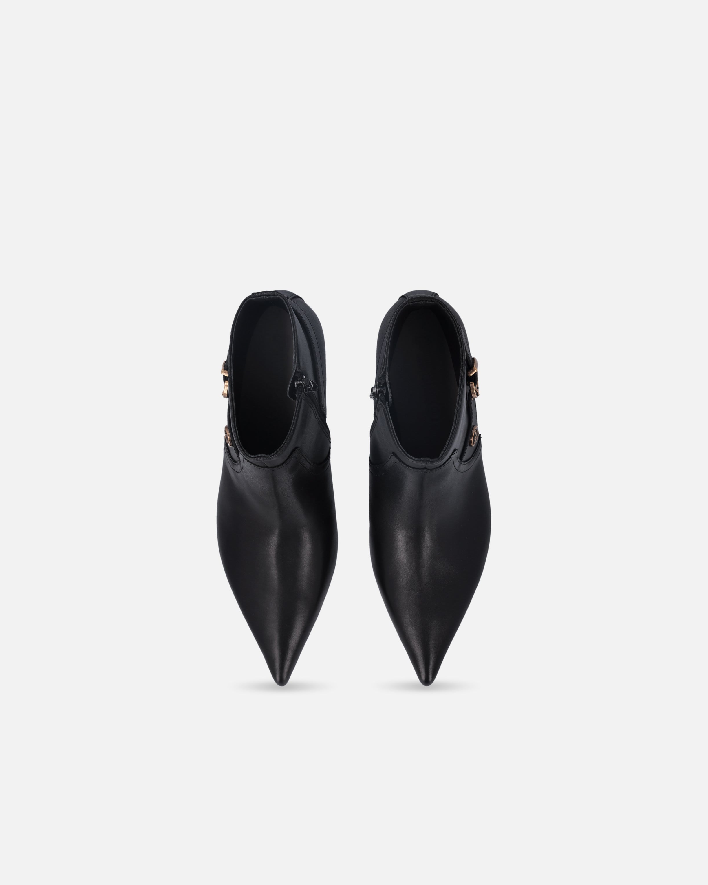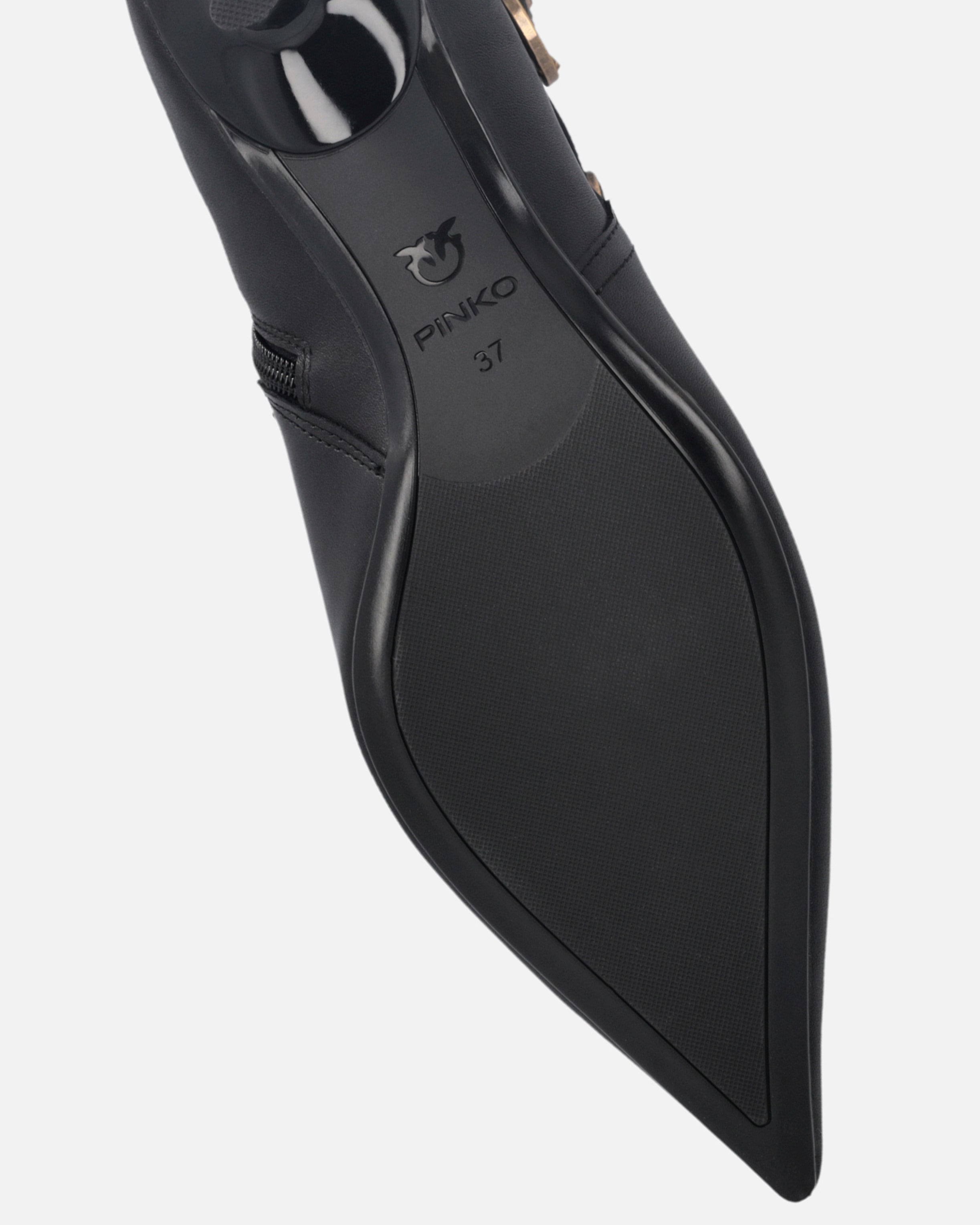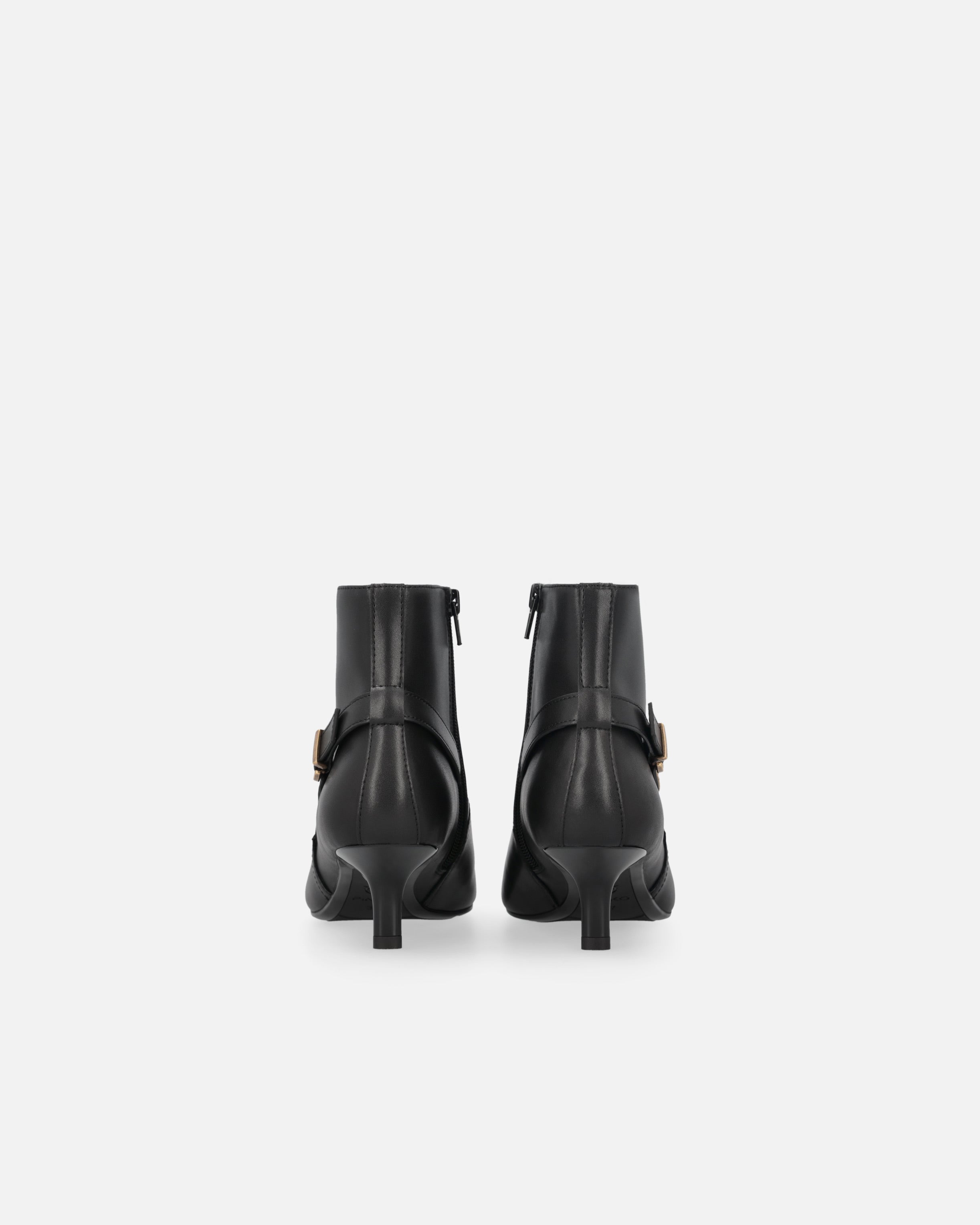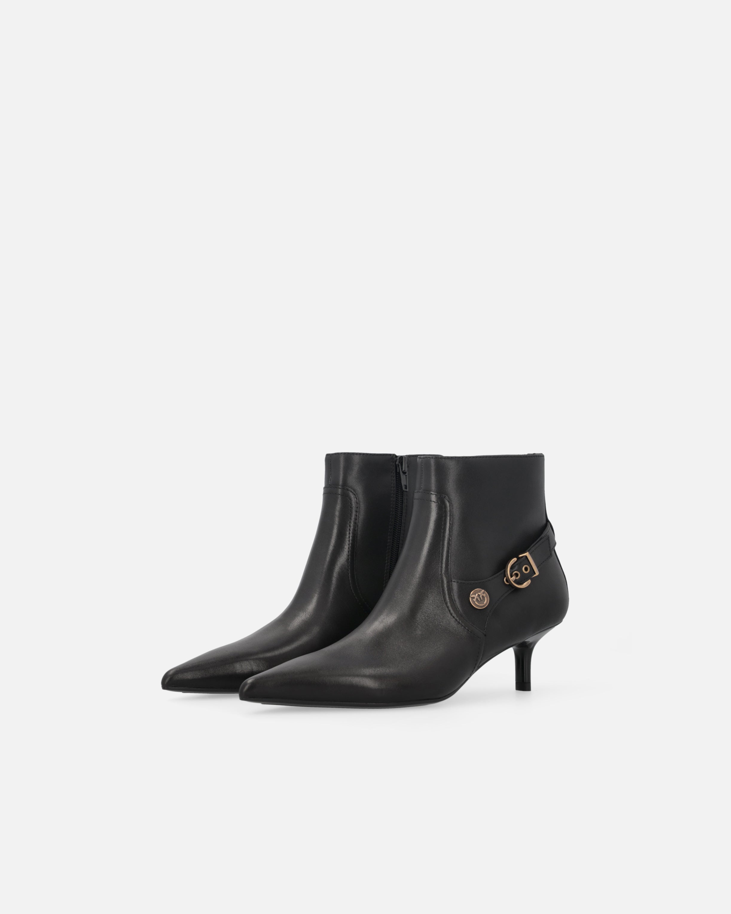 Leather booties with 13 cm-high leg shaft and slender 5 cm-high heel. The model features an adjustable side strap with buckle enhanced by a small antique gold-electroplated metal Love Birds logo plaque. The pure rubber sole provides excellent thermal insulation, ensuring maximum comfort and durability. Bold and refined, this pair of shoes can be worn with tailored trousers for the perfect office look.