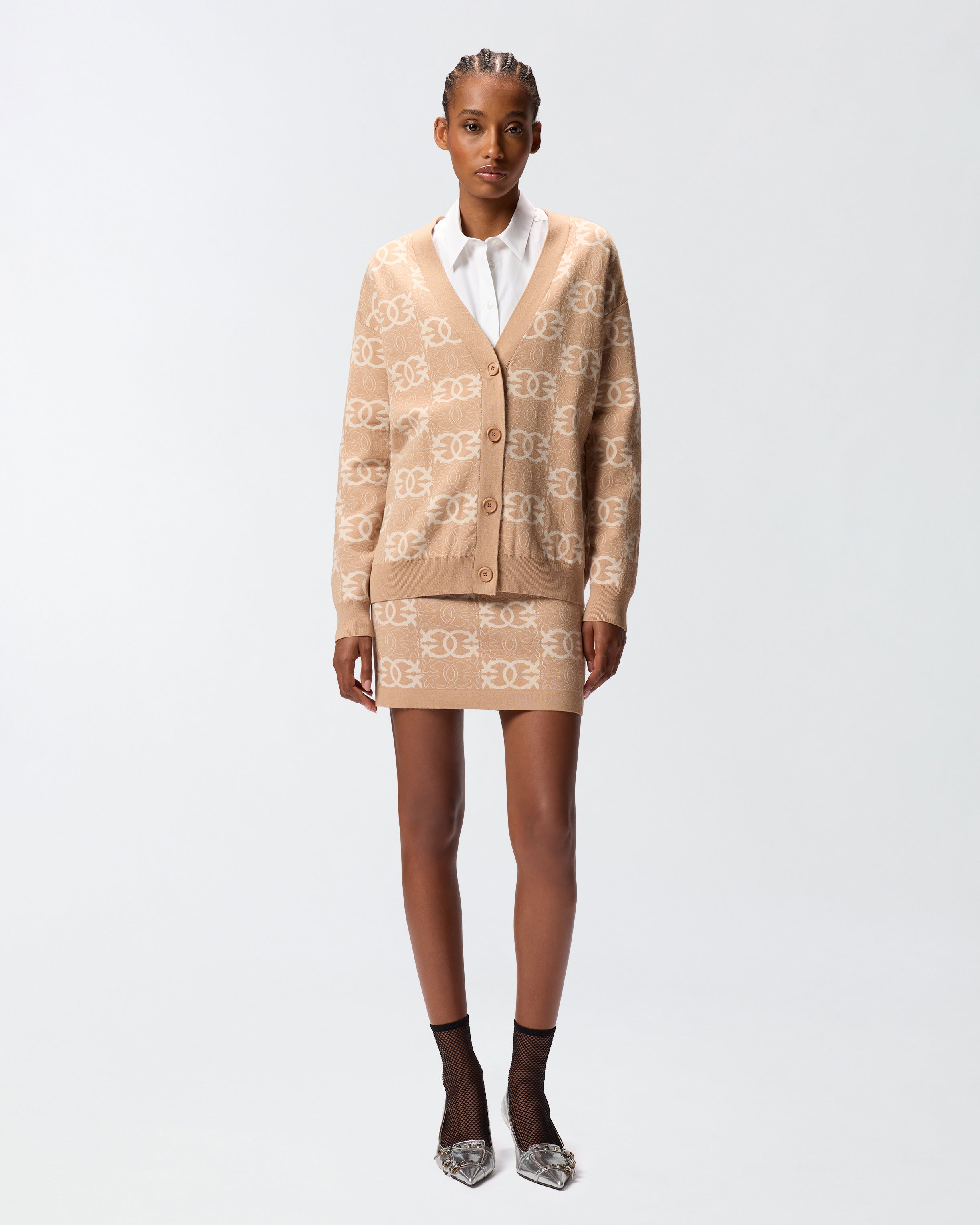 Oversized, long-sleeved knit cardigan with tone-on-tone buttons and contrasting ribbed V-neck, placket and cuffs. The all-over jacquard Love Birds logo motif is an eye-catching detail that enhances the model. The piece has undergone finishing tests to minimise the possible formation of pilling, ensuring greater fabric softness and durability. Pair this refined, versatile piece with its matching skirt from the same collection for a sure-fire look.