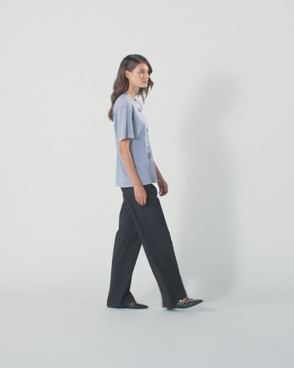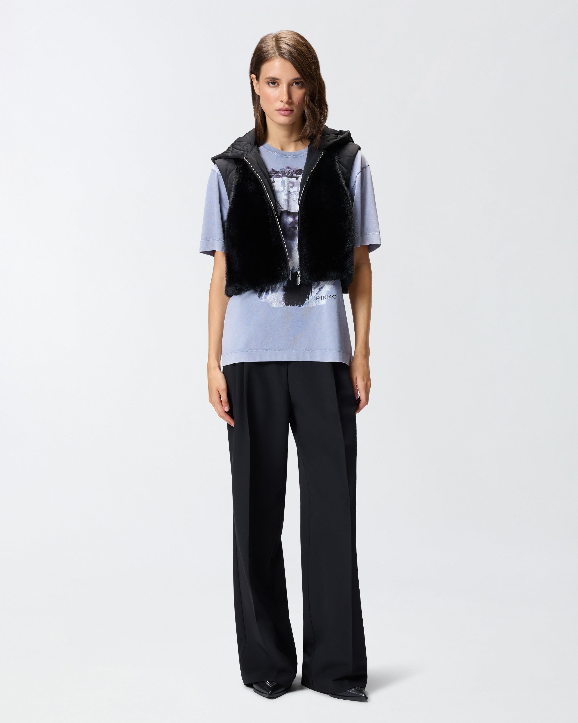 Short-sleeved crew-neck T-shirt in pure cotton jersey with a special marble-effect dye. The piece stands out with its fun front print with a feminine face accompanied by CHEESE lettering and the signature PINKO lettering logo. This T-shirt will work seamlessly with your favourite trousers, elevating your look in a simple, elegant and original way.