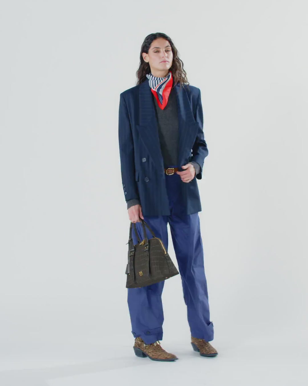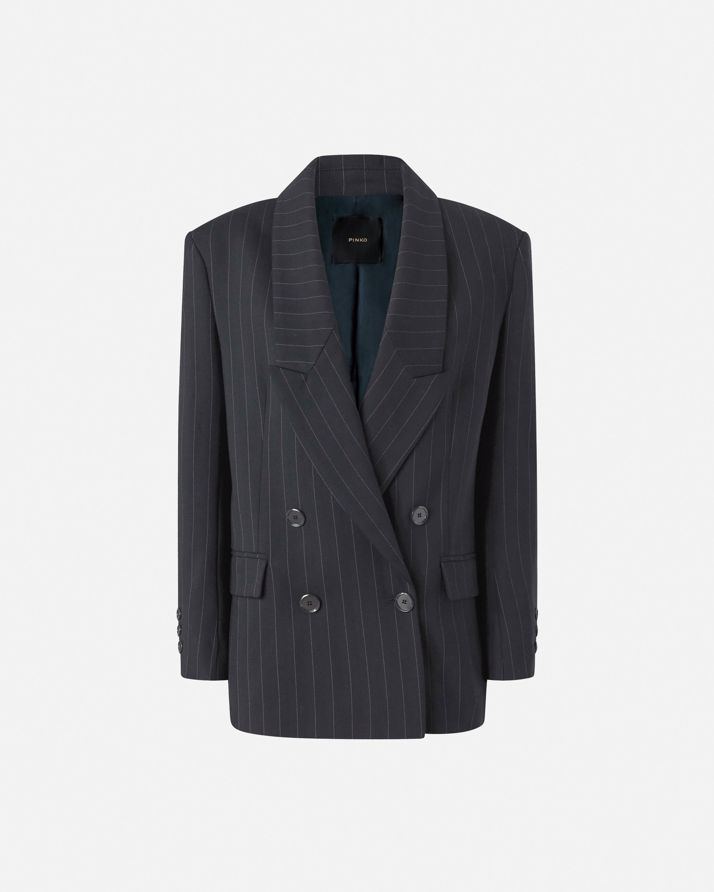 Double-breasted blazer jacket with a masculine look, characterized by a straight line with a central slit on the back, flap pockets and a lapel collar with lowered spears. The fabric used is a classic poly wool pinstripe characterized by a change of texture and light to emphasize the design of the material. Combine the jacket with trousers in the same fabric to create an elegant yet contemporary outfit.