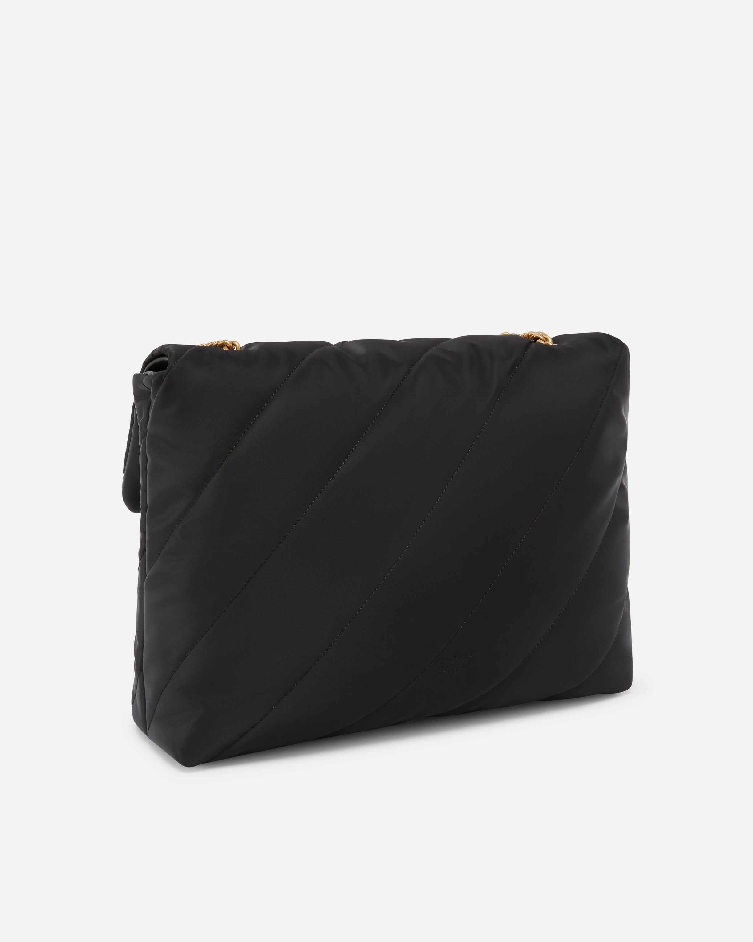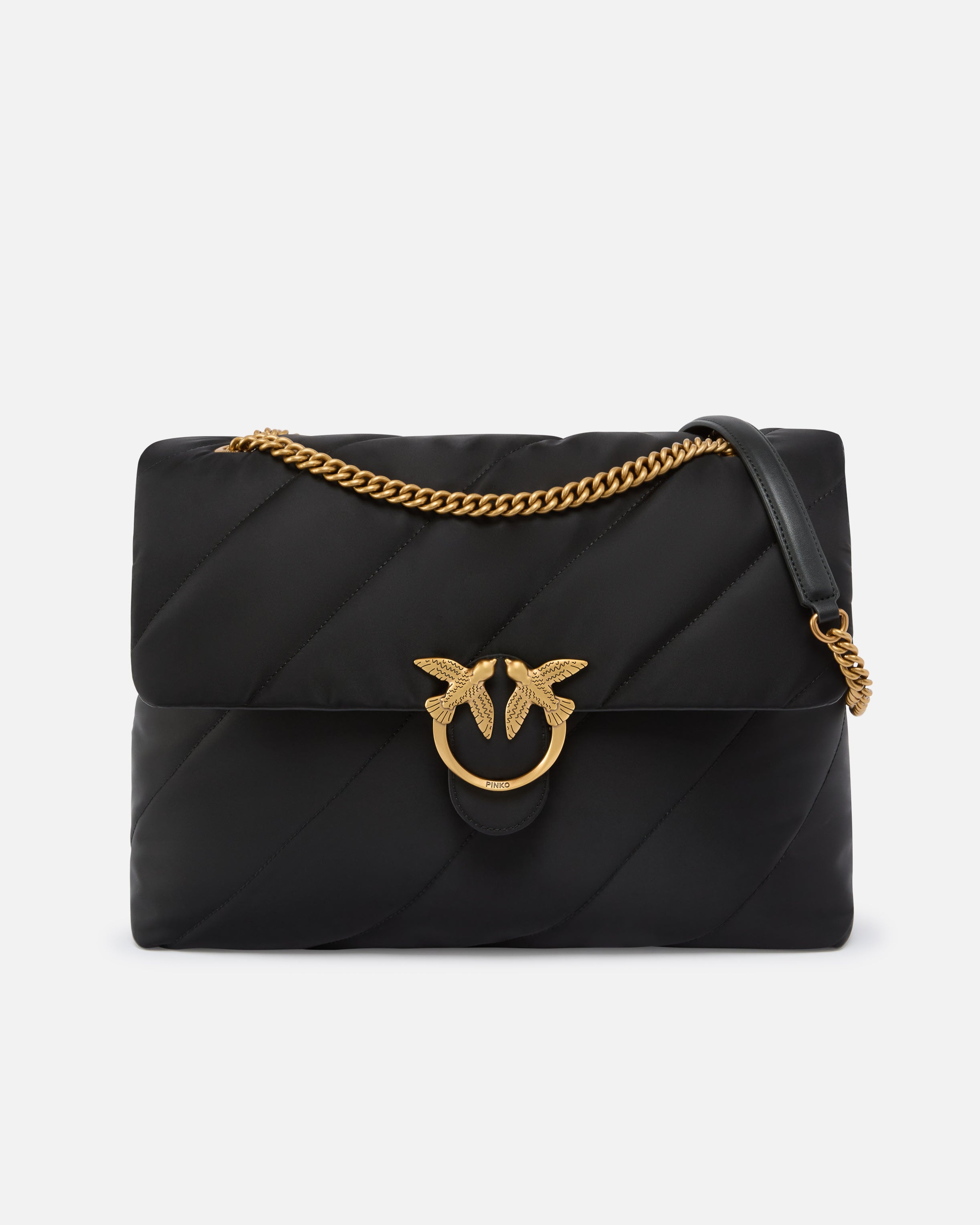 Large Extra Love Bag Puff in recycled-fibre fabric with diagonal maxi quilting and shoulder strap. Flap fastening accompanied by an antique gold-electroplated Love Birds Diamond Cut buckle. Inside, it has recycled polycotton lining and a handy zipped divider pocket. The metal chain strap with practical shoulder pad made from the same fabric as the bag allows you to wear it crossbody or on the shoulder, as needed. Activate your PINKO bag: verify the authenticity of your product and access a personalised experience by scanning the Love Birds embroidery on the back of the bag with your smartphone!