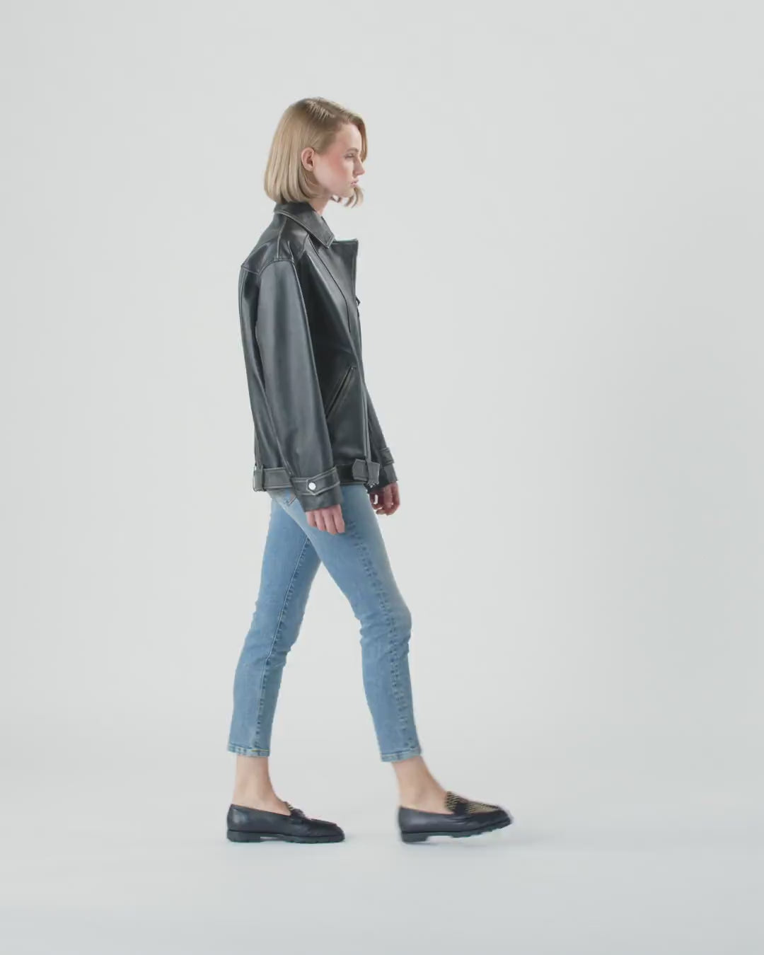 Biker-style biker jacket with shirt collar, cuff closure adjusters, slanted pockets and pocket with flap and snap button. The garment is offered in a leather version with an attractive aged effect, obtained through a special dyeing and finishing process. Belt with buckle at the bottom of the garment, to be worn open or closed to customize the wear of the garment. Off-center zip closure. This jacket is a contemporary reinterpretation of the classic leather biker jacket, with a slightly softer and less structured line, perfect to combine with your everyday looks and light them up with the style that this outerwear represents. Made with sustainable leather certified GRS (Global Recycle Standard) and LWG GOLD, for greater attention to environmental impact.