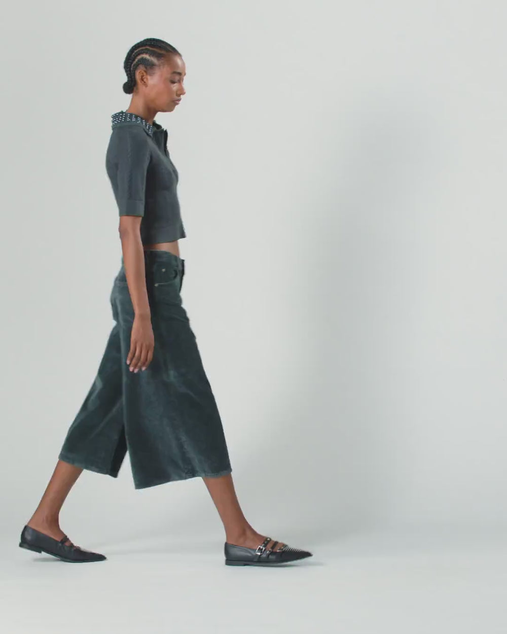 Long, wide-leg, 70s-inspired, five-pocket corduroy shorts with an old treatment and a marbled wash for a 3D effect. The label with the Love Birds logo heat-pressed on the back of waistband and the detachable belt loop with Love Birds logo add pure PINKO style to the design. Wear these shorts with a pair of high boots for a striking look even in winter. Mid-rise with belt loops and a zip and button fastening.