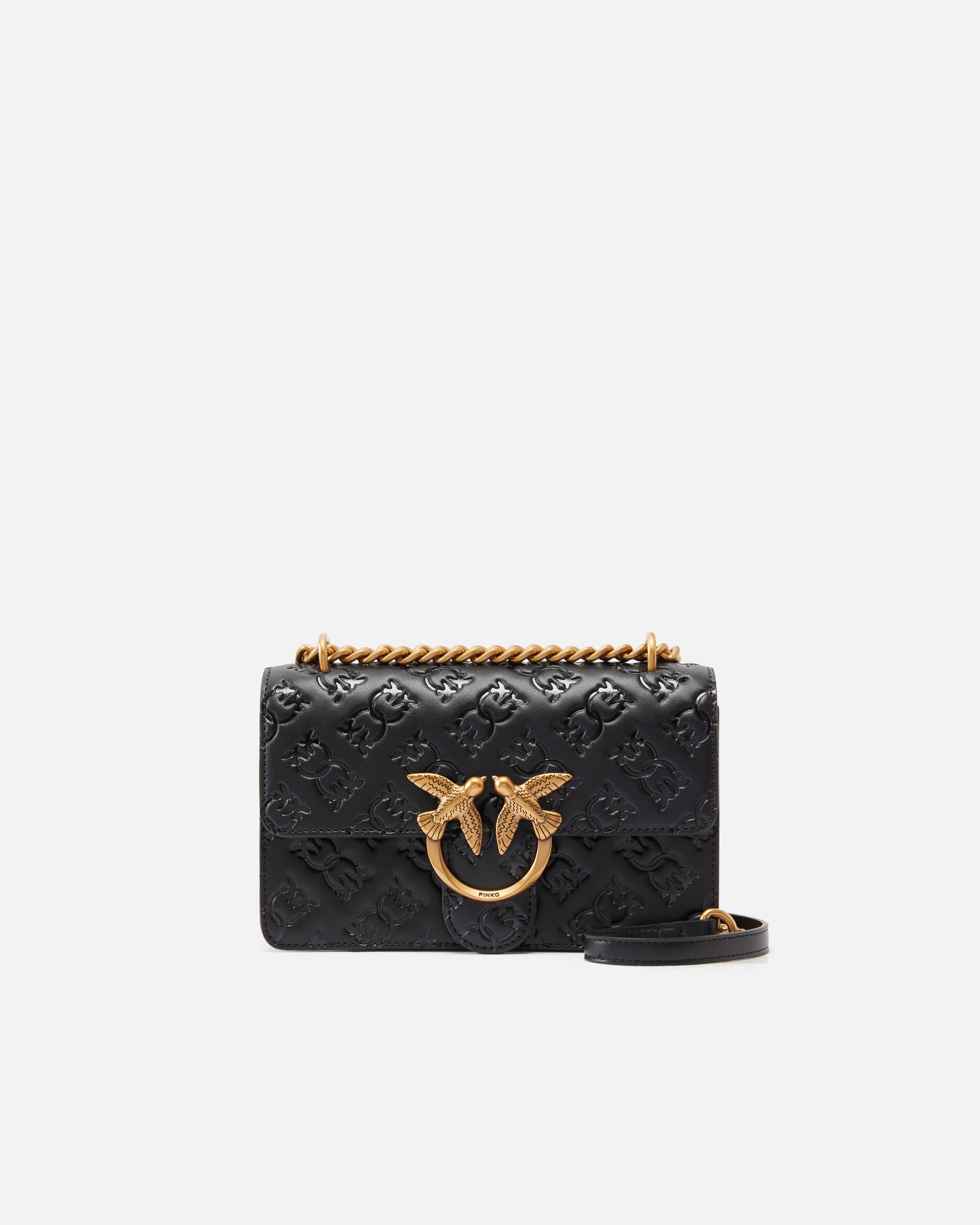 Love Bag mini crossbody bag in soft, silky leather with imprimé Love Birds Monogram motif and antique gold-electroplated Love Birds Diamond Cut buckle. Inside, it has suede lining, a leather slip pocket and a zipped centre divider pocket. The bag is complete with a shoulder strap combining a metal chain and adjustable leather shoulder pad. Activate your PINKO bag: verify the authenticity of your product and access a personalised experience by scanning the Love Birds embroidery on the back of the bag with your smartphone!