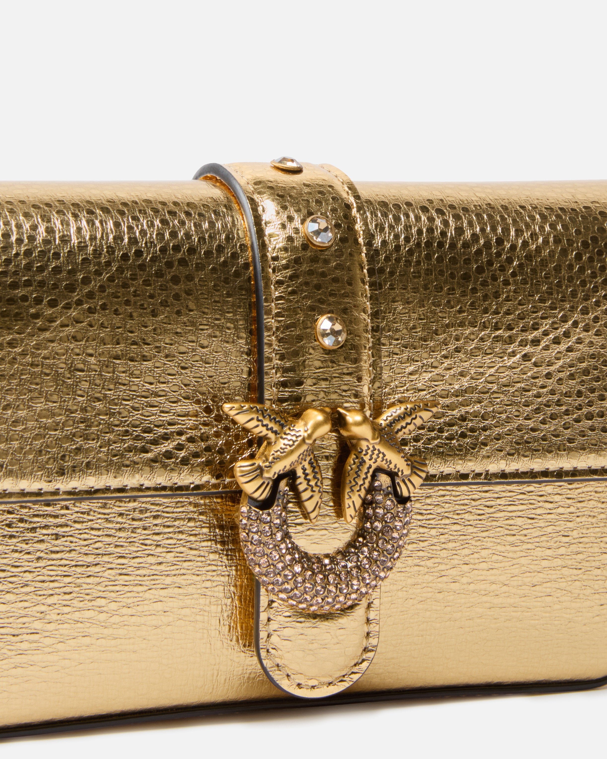 Love Bag One Slouchy small shoulder bag made from laminated and tumbled leather. Featuring an adjustable leather and chain strap for shoulder or crossbody wear, this clutch is very refined and practical. The flap fastening is accompanied by small metal studs and a buckle featuring the Love Birds Diamond Cut logo. The accessory features a cotton drill-lined interior and a zipped slip pocket. Activate your PINKO bag: verify the authenticity of your product and access a personalised experience by scanning the Love Birds embroidery on the back of the bag with your smartphone!