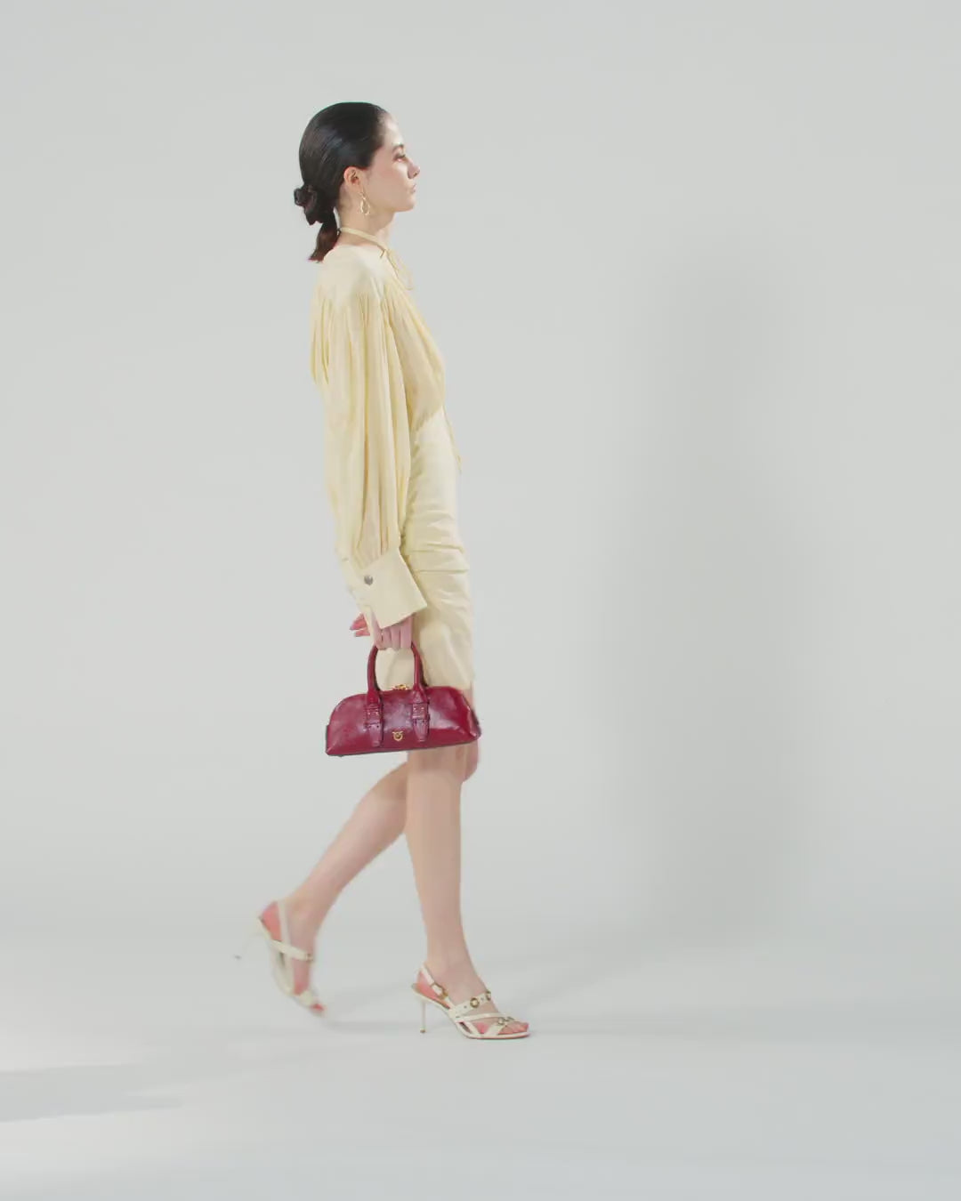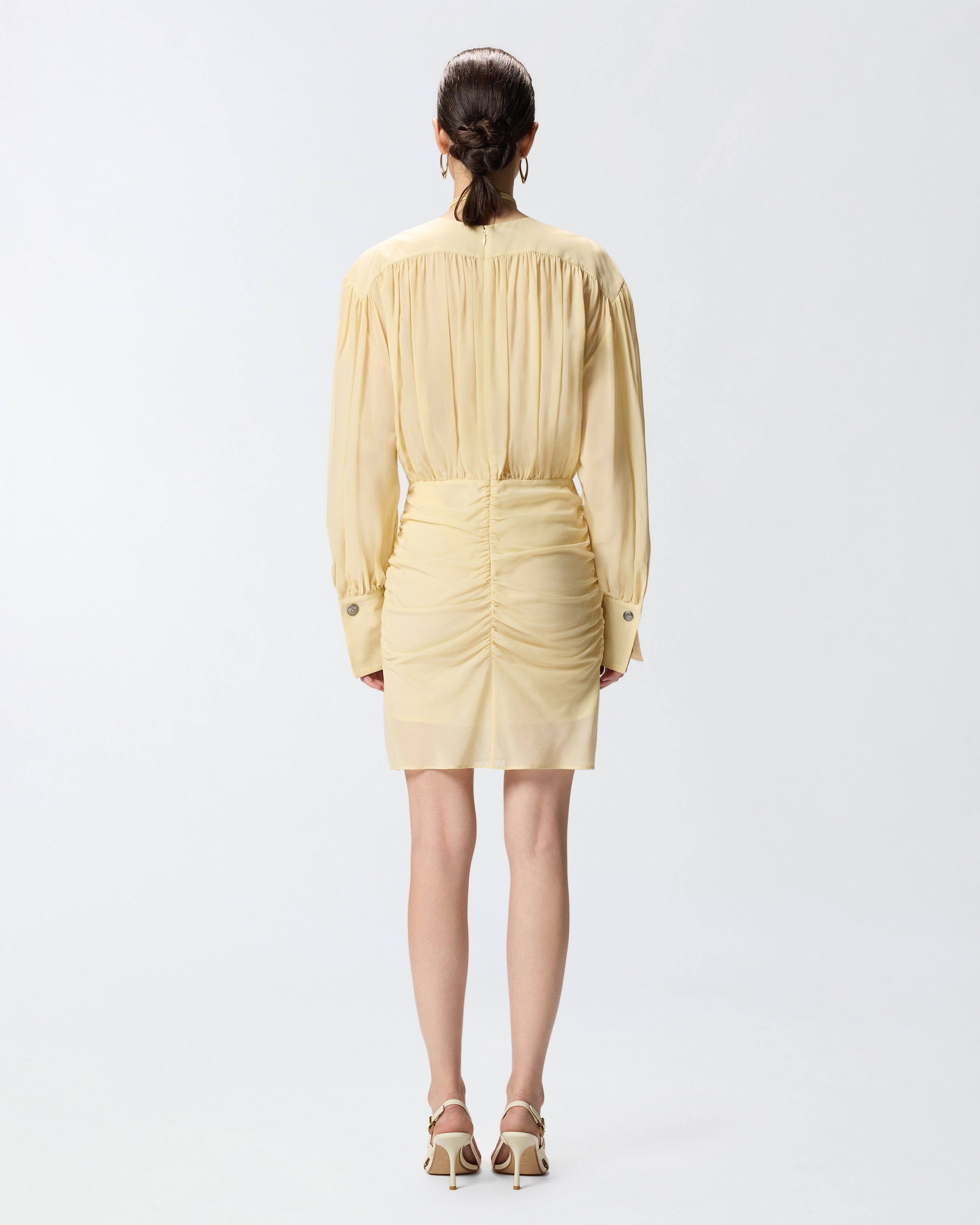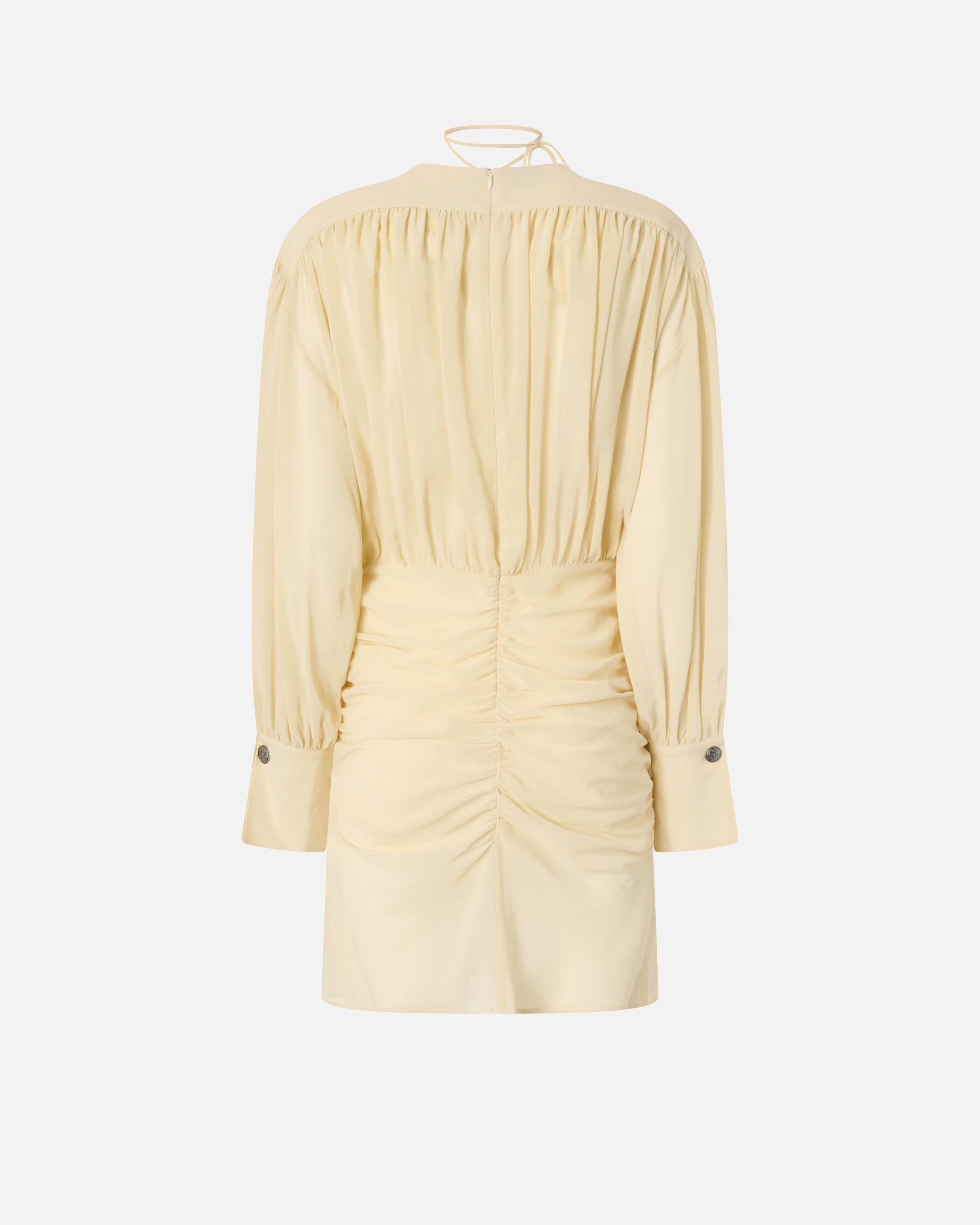 Mini dress made from a clever combination of lightweight viscose voile and cotton crêpe, for a semi-sheer and wavy finish. This garment offers striking contrast between its slim-fitting, figure-caressing skirt and more loose-fitting bodice featuring long sleeves with metal buttons on the cuffs and plunging V-neck with thin ribbons, which you can tie in different ways to create unique, alluring looks. The dress is also enhanced by draping and gathering that lend movement on the back of the skirt, sides, yoke, back, sleeves and waist, and is complete with an invisible rear zip that makes it easier to put on.
