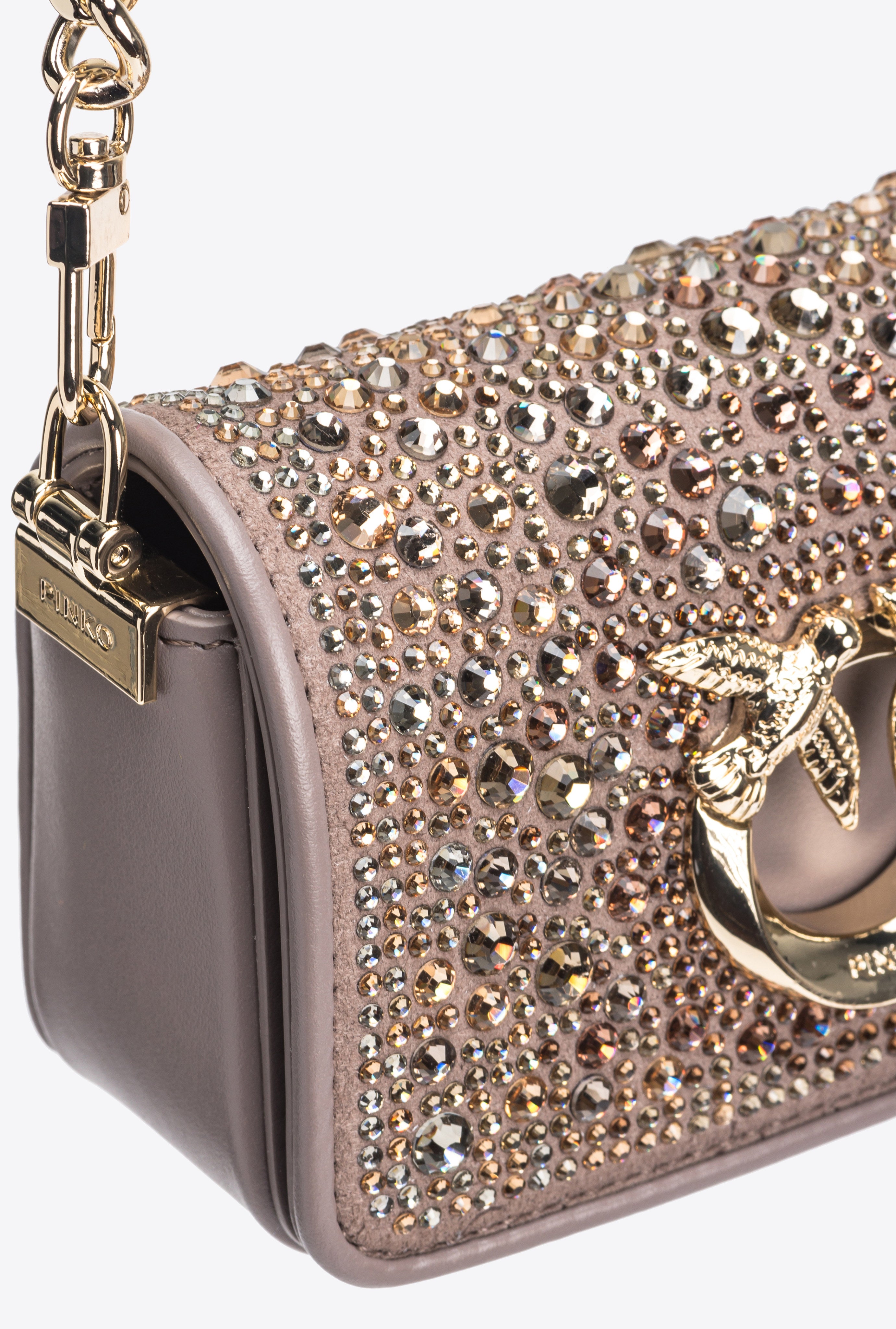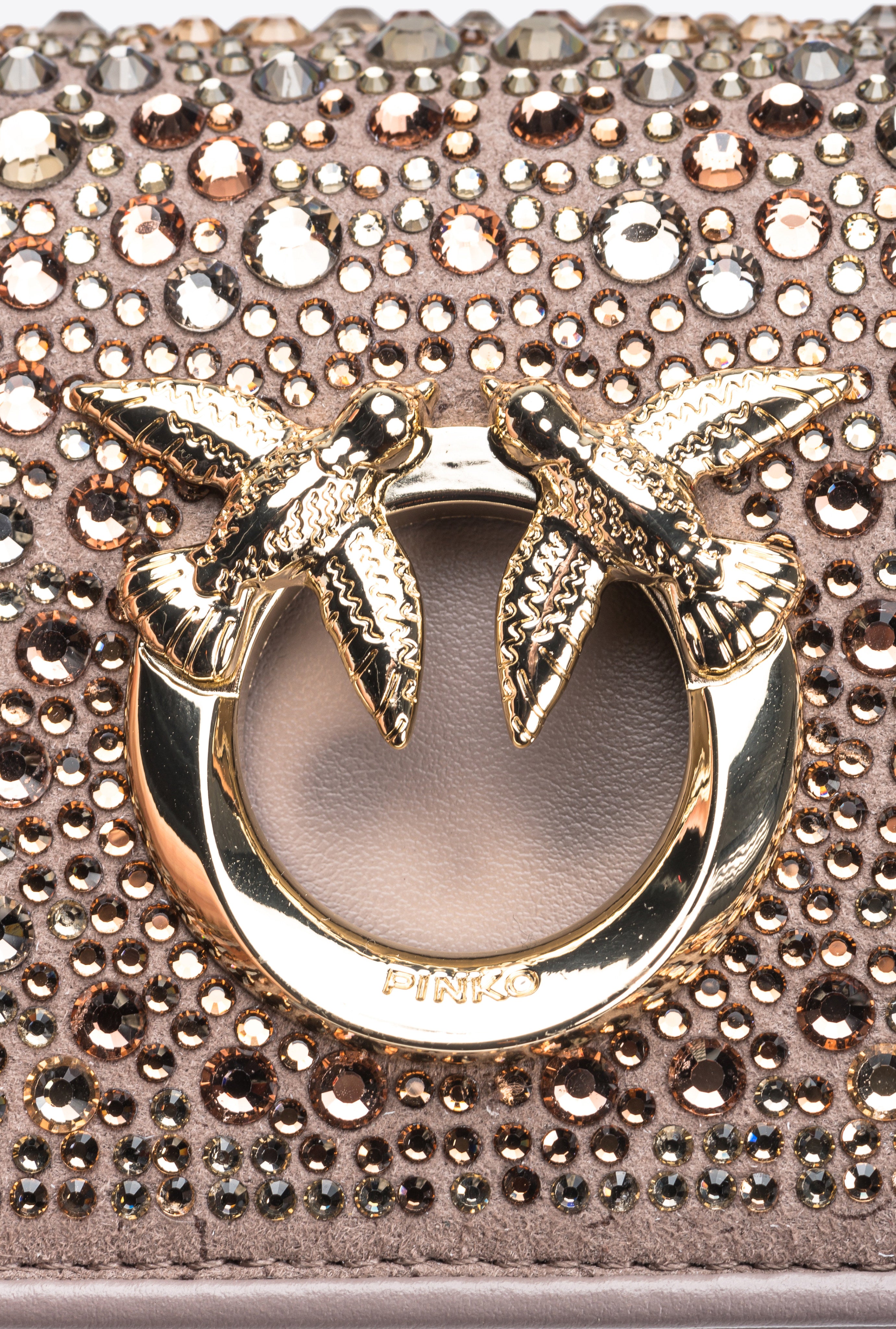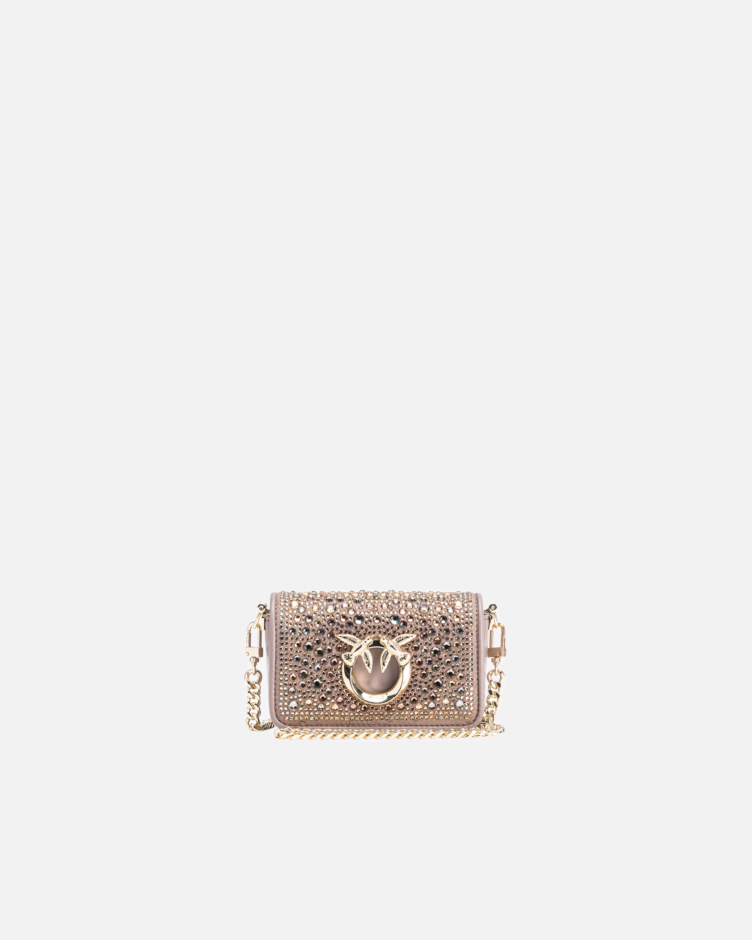 Micro Love Bag Click comprising imperfection-concealing brushed leather, in addition to suede which boasts a placed distinctive nuance, in line with the design created specifically by the PINKO team. All-over heat-transferred crystal appliqués: these comprise Europe-sourced round crystals with 8 ultra-bright facets, affixed in a secure and long-lasting way by means of the provided glue. The crystals - which come in four different sizes - are positioned, covered with a tissue and heat-pressed for several minutes. The concealed press-stud fastening is embellished by the iconic metal Love Birds Diamond Cut buckle with cut-out effect. The shoulder strap combines the classic round-link chain with a practical, adjustable leather pad. The bag is part of the Limited Edition special capsule collection which comprises PINKO Galleria-exclusive limited-edition models. Use the special NFC chip to enjoy a special experience, specific to the bag you have just bagged!